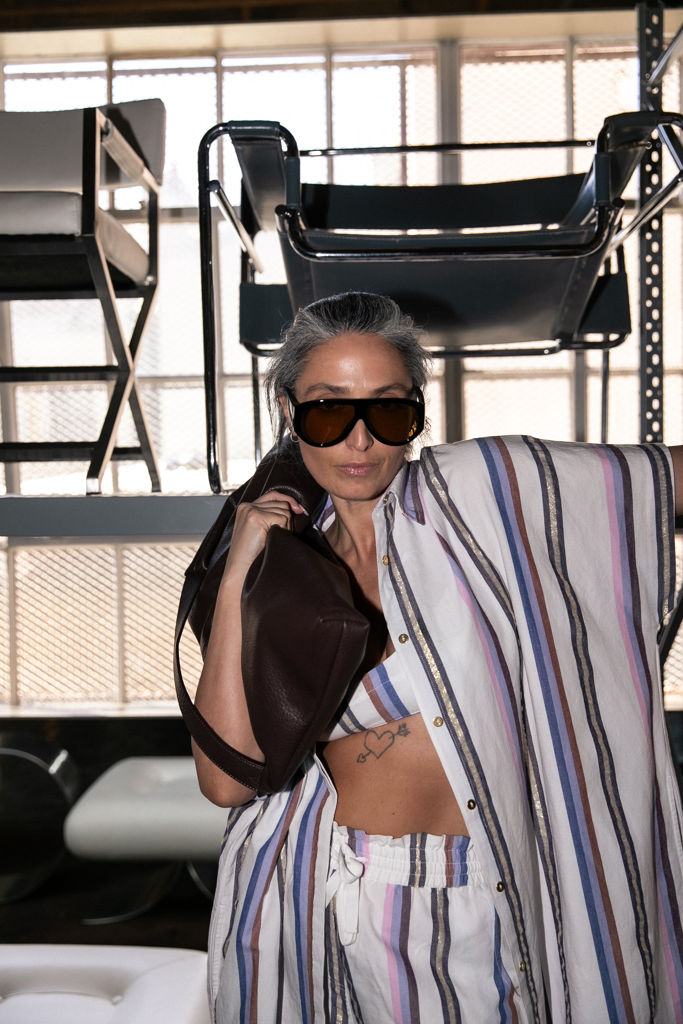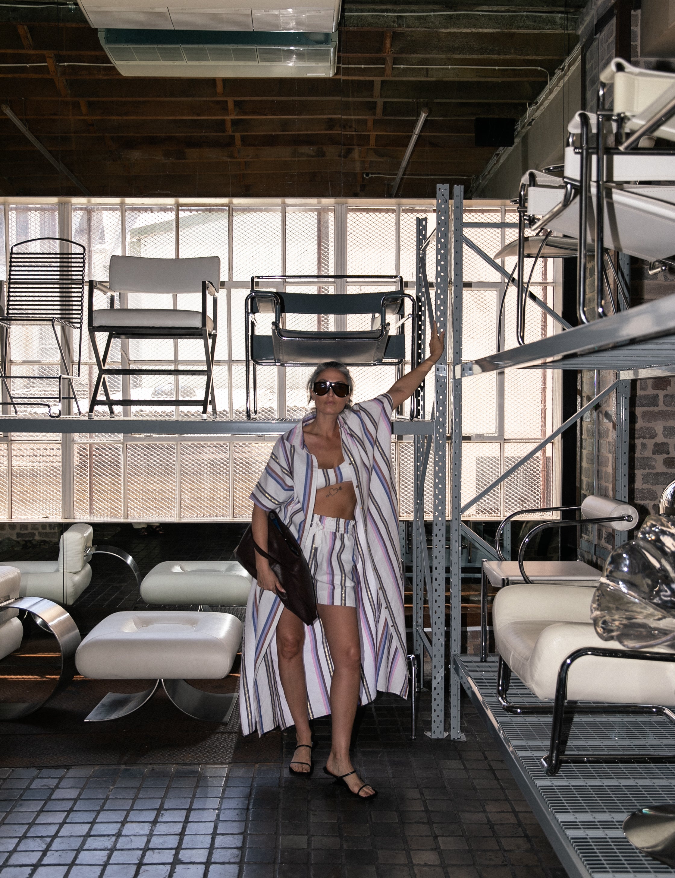 Prim Haus is a curated photographic studio and event space and I like to outsource furniture that has a story. For instance (walking alongside a piece in the studio) this couch is an original piece from South Africa. It was sourced by a women who purchased it and brought it to Australia – she kept it herself for 20 years and when she went to sell it I found [it] and I loved the metal bracketing of the base. It’s a caterpillar piece designed by a south African furniture designer, and I loved how it correlated and matched the metal on the windows. So finding this felt like it belonged in this space and that’s what I love, every time I curate a photographic studio I love to make the pieces match the foundation and the aesthetic of the space so then it just creates this flow. And then by having it in here, and the fact that it’s a sustainable piece, it’s had stories, it’s got depth, it’s got character, it’s got you know little nuances within it. I love how that brings elements to shoots so it’s not about perfection it’s about the beauty in the imperfection.