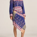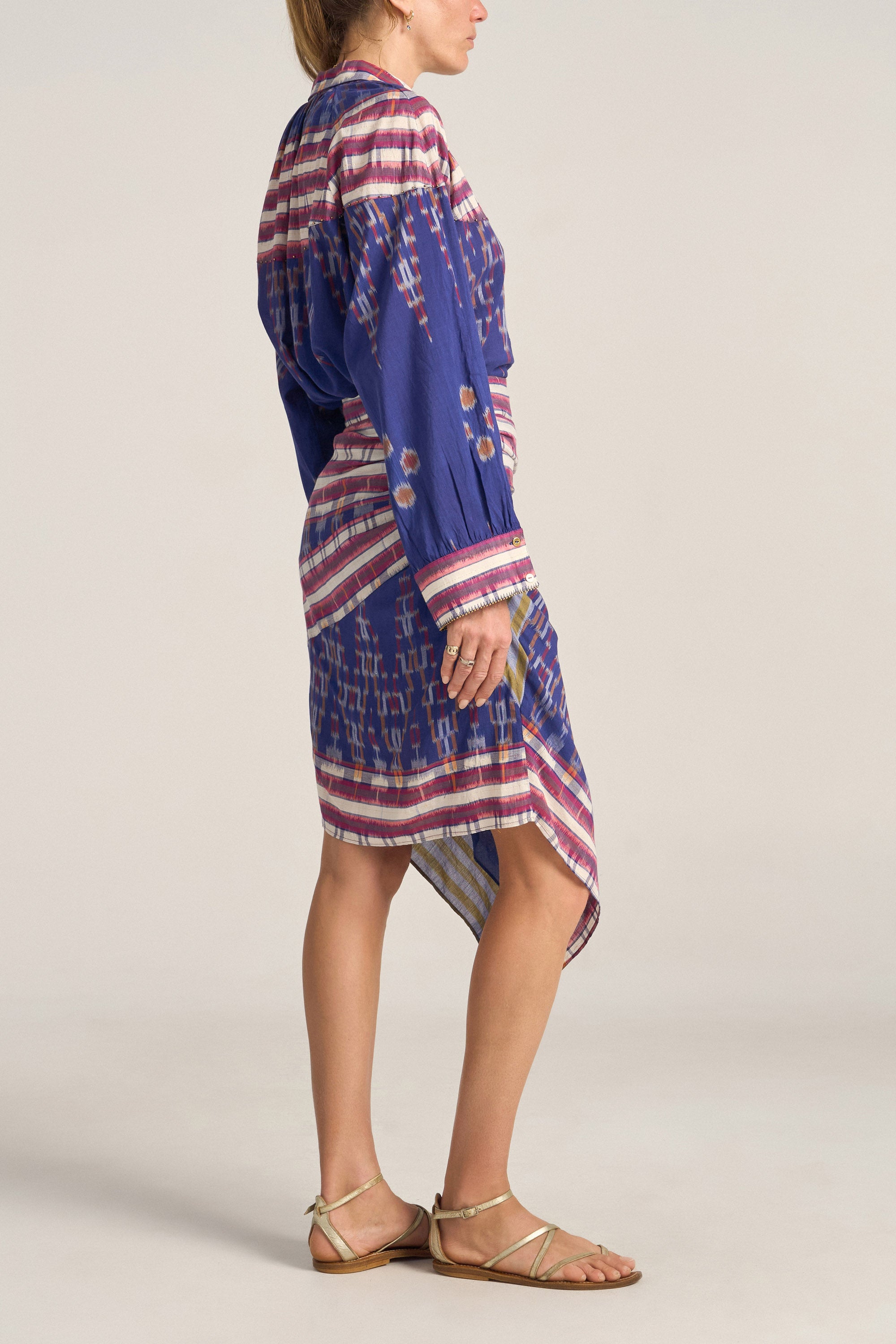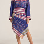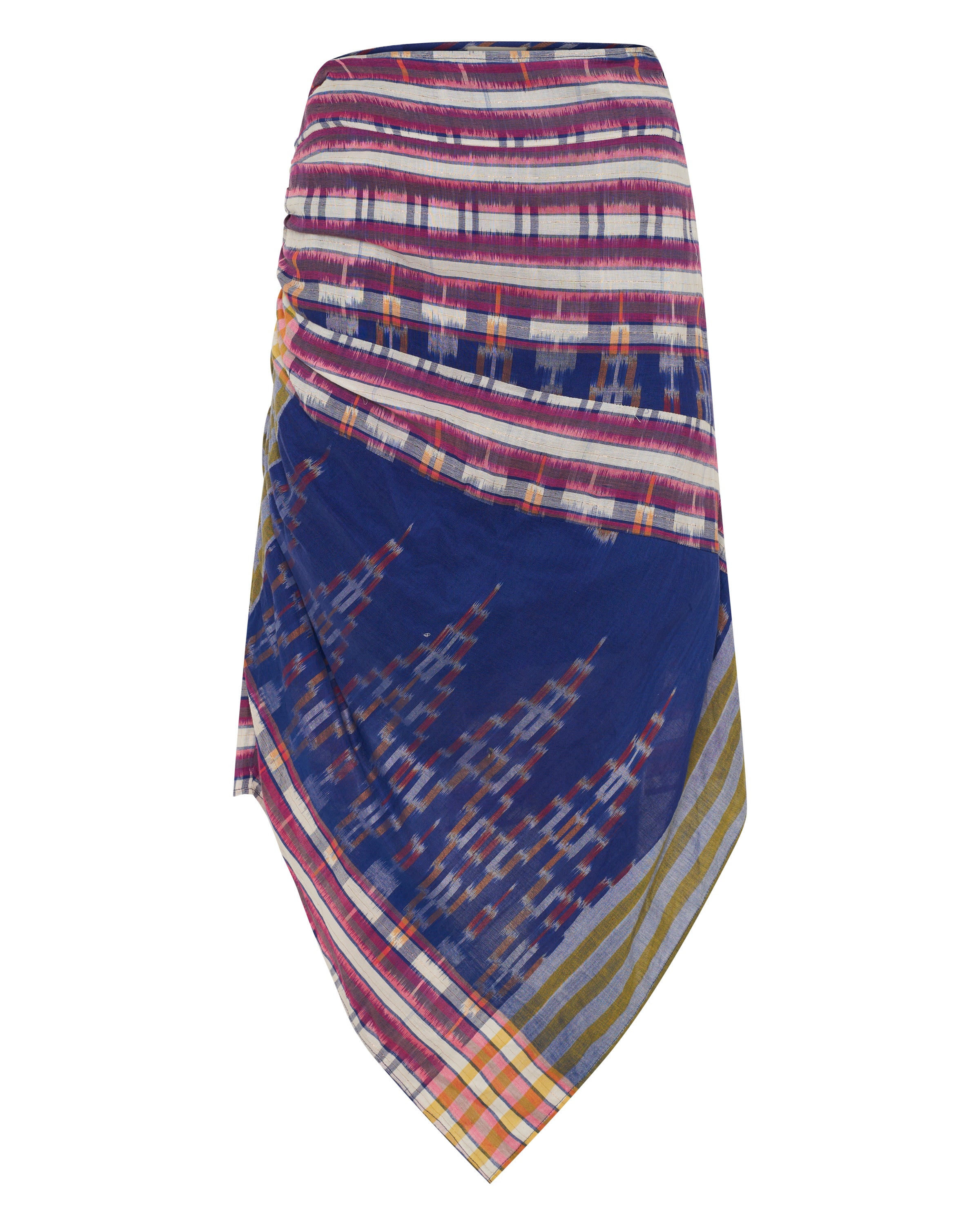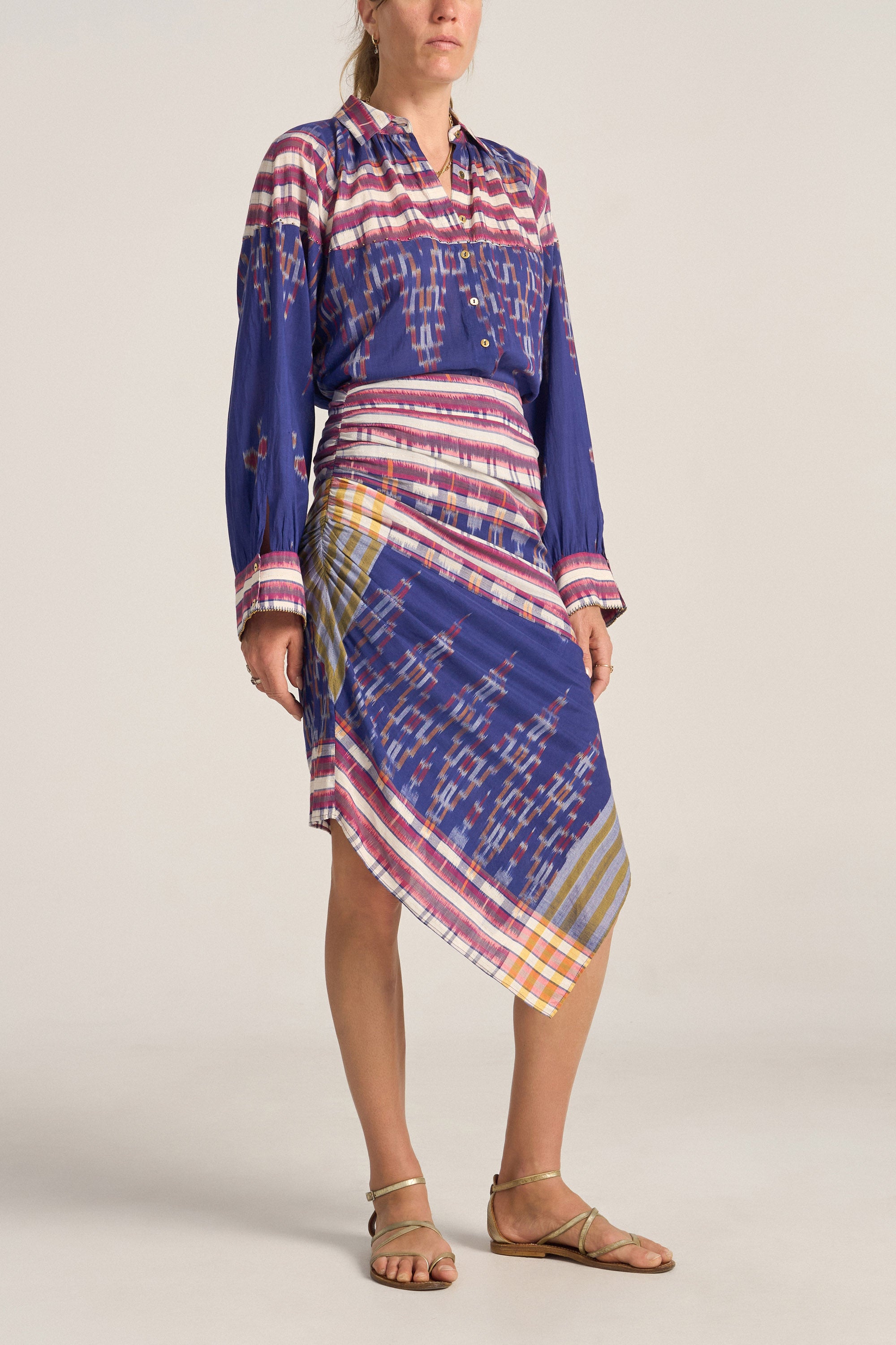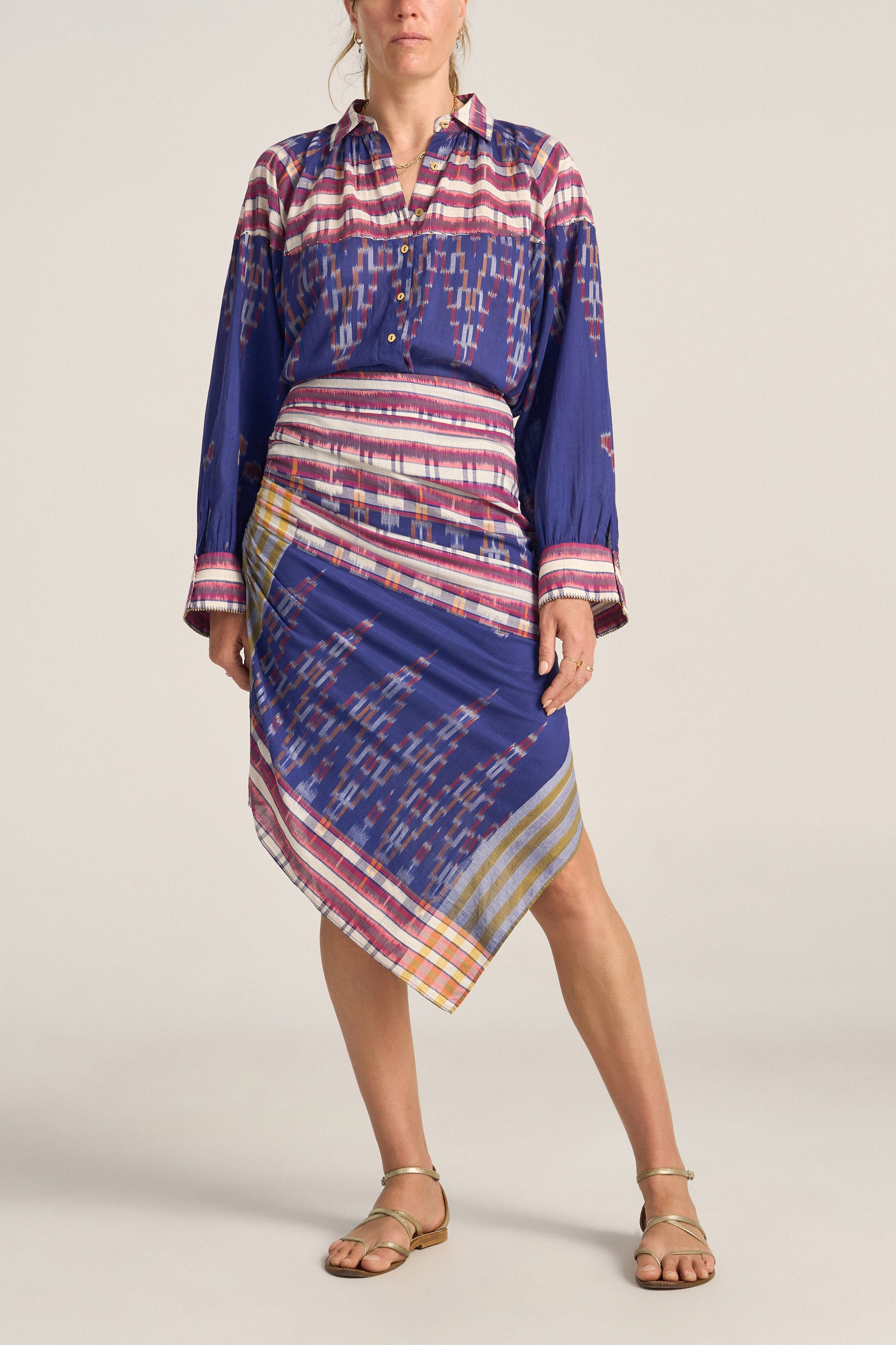 The Aegis Skirt is a graceful statement of effortless elegance. Crafted from lightweight Ikat cotton with gold accents, it is designed to hug the hips like a draped sarong and features a distinctive pointed fabric detail just off centre, adding a subtle twist to its wrapped silhouette. A discreet invisible side zip ensures ease of wear. Light and breathable, the Aegis Skirt blends artisanal craftsmanship with modern everyday comfort. Perfectly versatile, this skirt is a refined piece ideal for both relaxed days and special occasions.