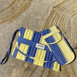 This cute summer set is the perfect holiday accessory and Christmas gift. Made from fabric cut-offs, this quilted envelope and matching sunglass case is crafted by local weavers in India, featuring our signature Xania Stripe with gold accents. The pouch includes a wrist loop for easy carrying and fits perfectly inside any handbag. It’s the ideal size for a pocket-sized book or A5 journal, making it a great beach companion or beauty pouch for your favourite makeup. The sunglass case offers sleek protection for your sunglasses without the bulk of a heavy plastic case.