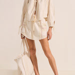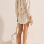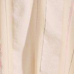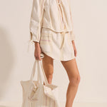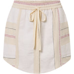 The Abas Skirt in Cream Boucle Stripe features a textured cream stripe with red and black accents. This style has an elastic waistband, a relaxed mini silhouette with a shirt-tail hem and side pockets. Handwoven by artisans in southern India, each skirt takes over a day to weave, highlighting our commitment to sustainable, slow fashion. A perfect, playful piece for summer days.