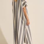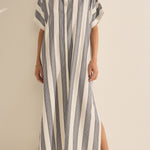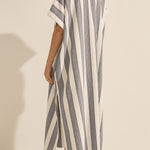The Apollo Caftan is a wardrobe staple, featuring this season's classic Chios Stripe in white and blue. Maxi-length, short sleeves, a chic collar, high side slits and hidden pockets, it exudes effortless elegance. A perfect blend of femininity and simplicity, this timeless piece is as versatile as it is stunning—an essential for every season.