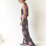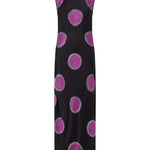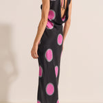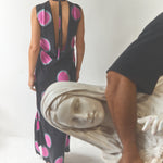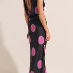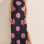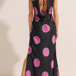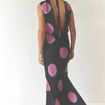 The Archer Kusama Dot Dress is crafted from luxurious silk twill, individually hand-dyed on a regenerative farm in Bengaluru, India. Using an ancient dyeing technique with wood blocks, artisans create stunning motifs throughout the fabric. Inspired by Yayoi Kusama's dot patterns, this long, bias-cut dress skims the body for a flattering silhouette. It features a high neck with a delicate tie detail at the back, revealing a dramatic cowl drape. With side zippers and high side slits, it combines elegance and ease, making it a statement piece.