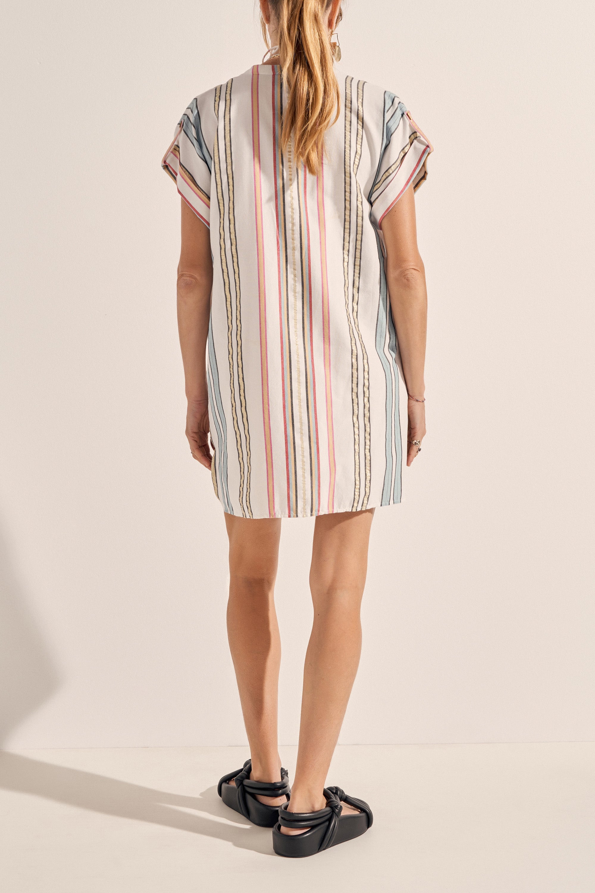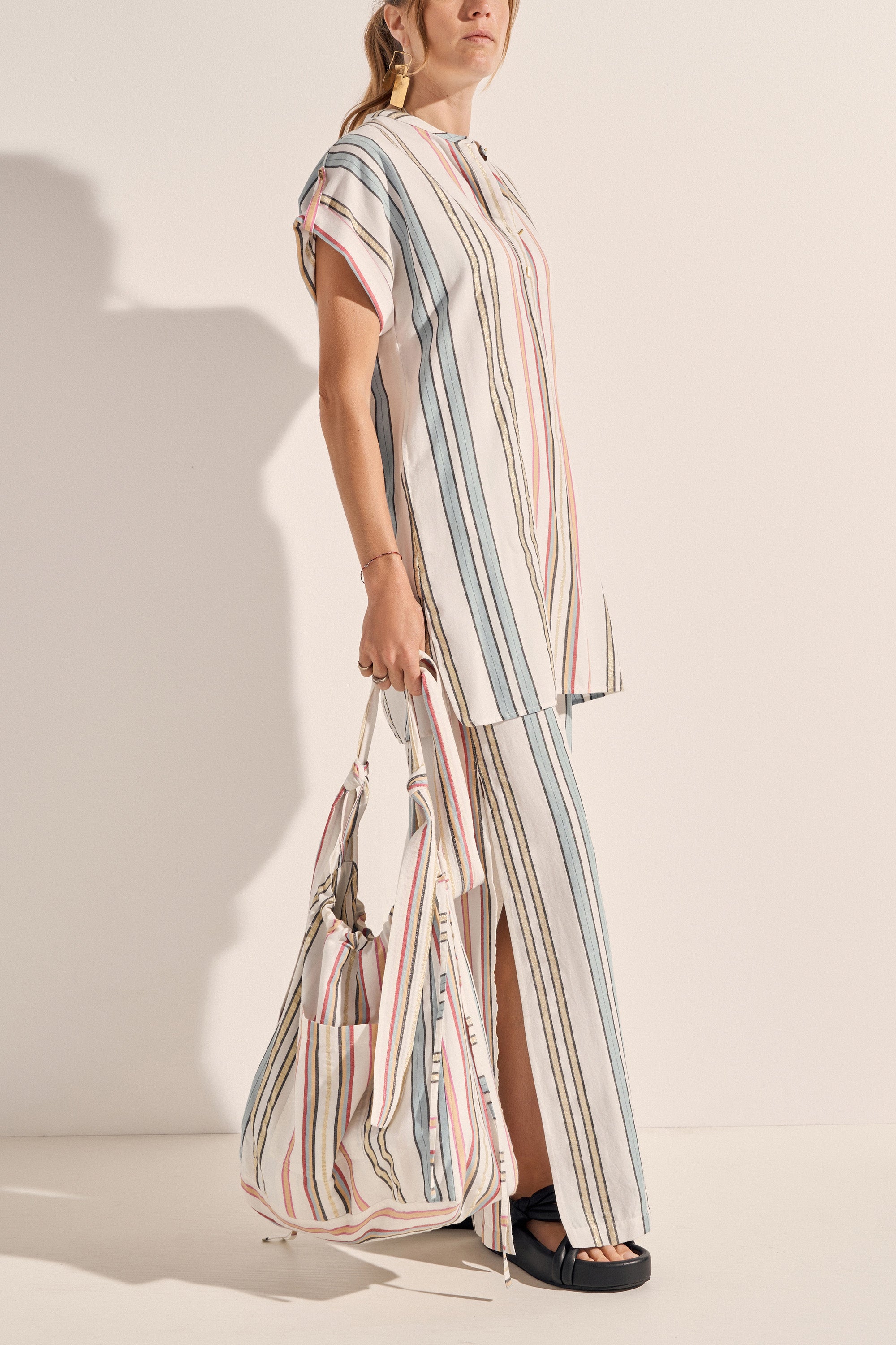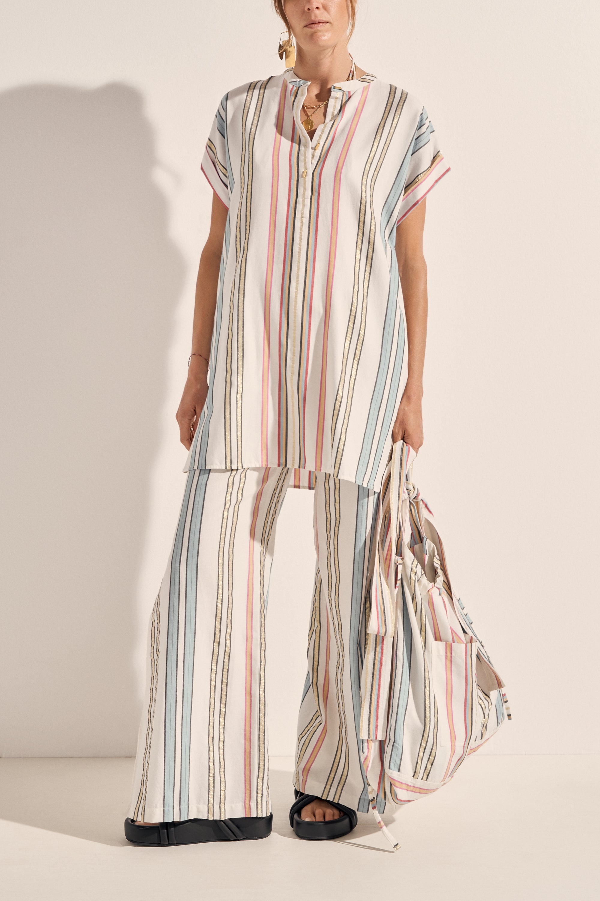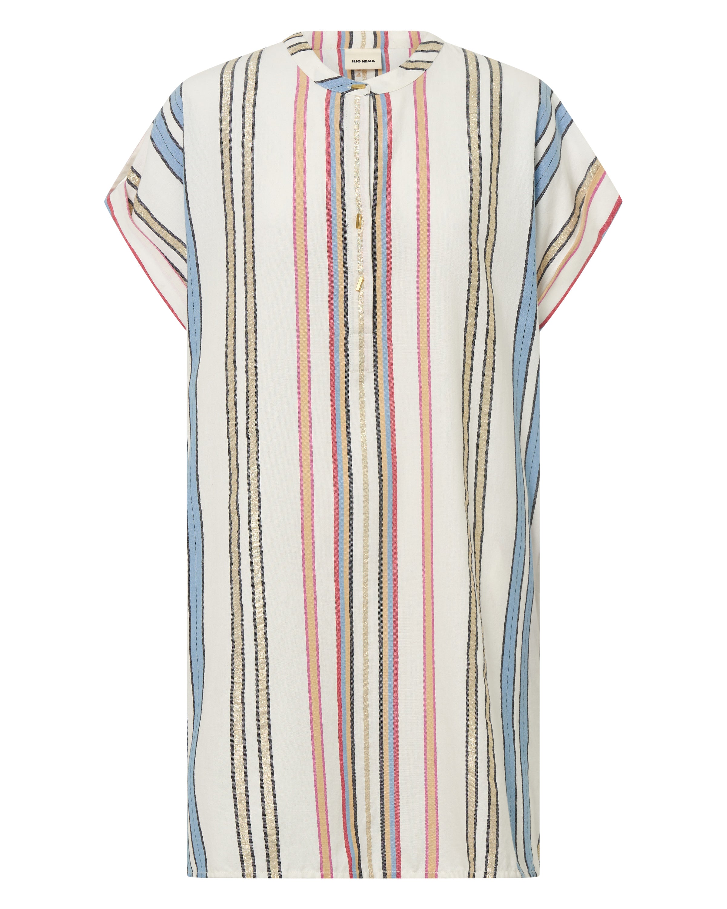 The Athena Tunic is a classic Ilio Nema silhouette. Tailored in this season's multi-colour Byron Stripe featuring gold accents it is a versatile piece to be loved and worn. This easy-to-wear tunic is both feminine yet simple with its straight fit, rolled sleeves, deep neckline and side seam pockets. Embellished with signature gold bar buttons at neckline.