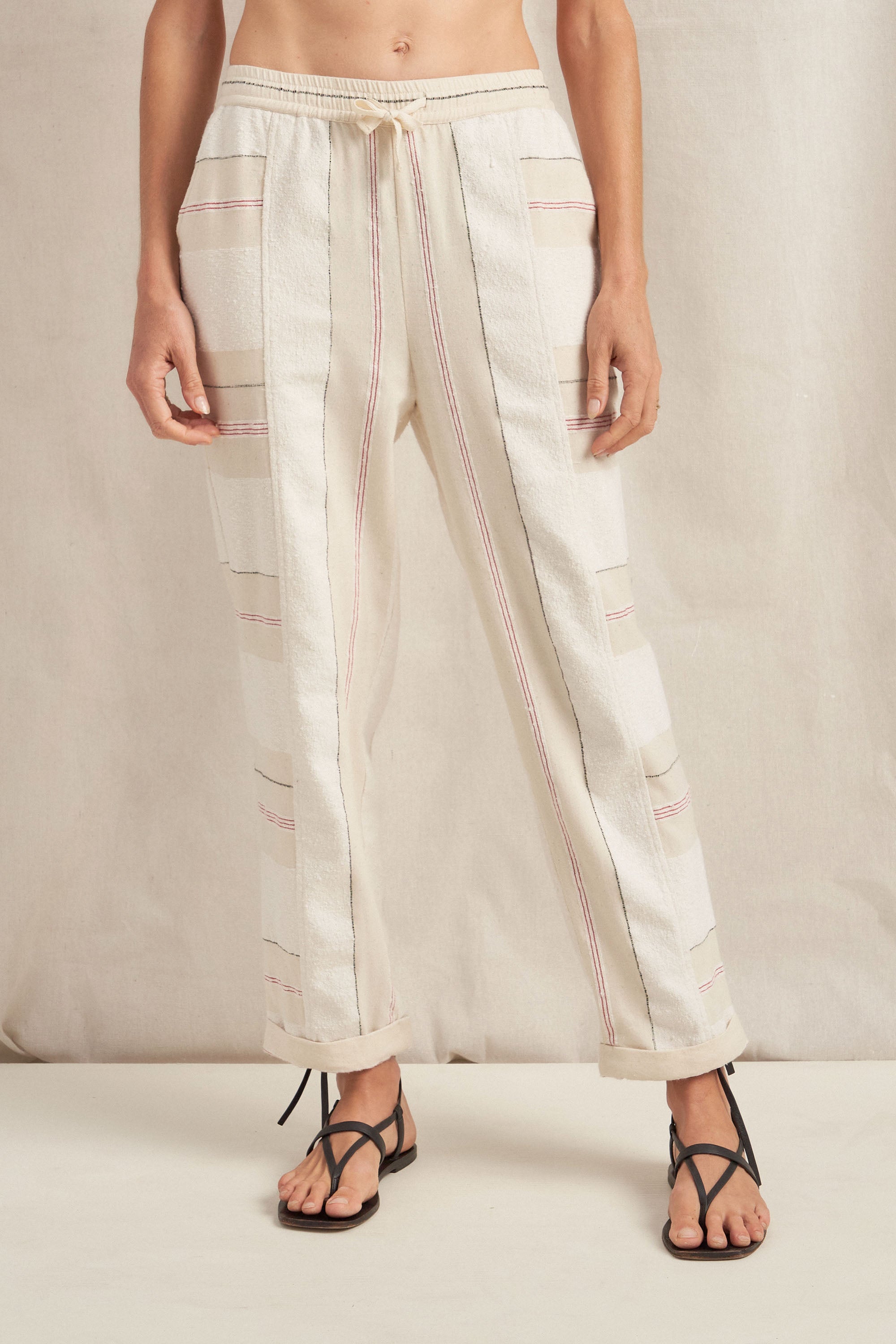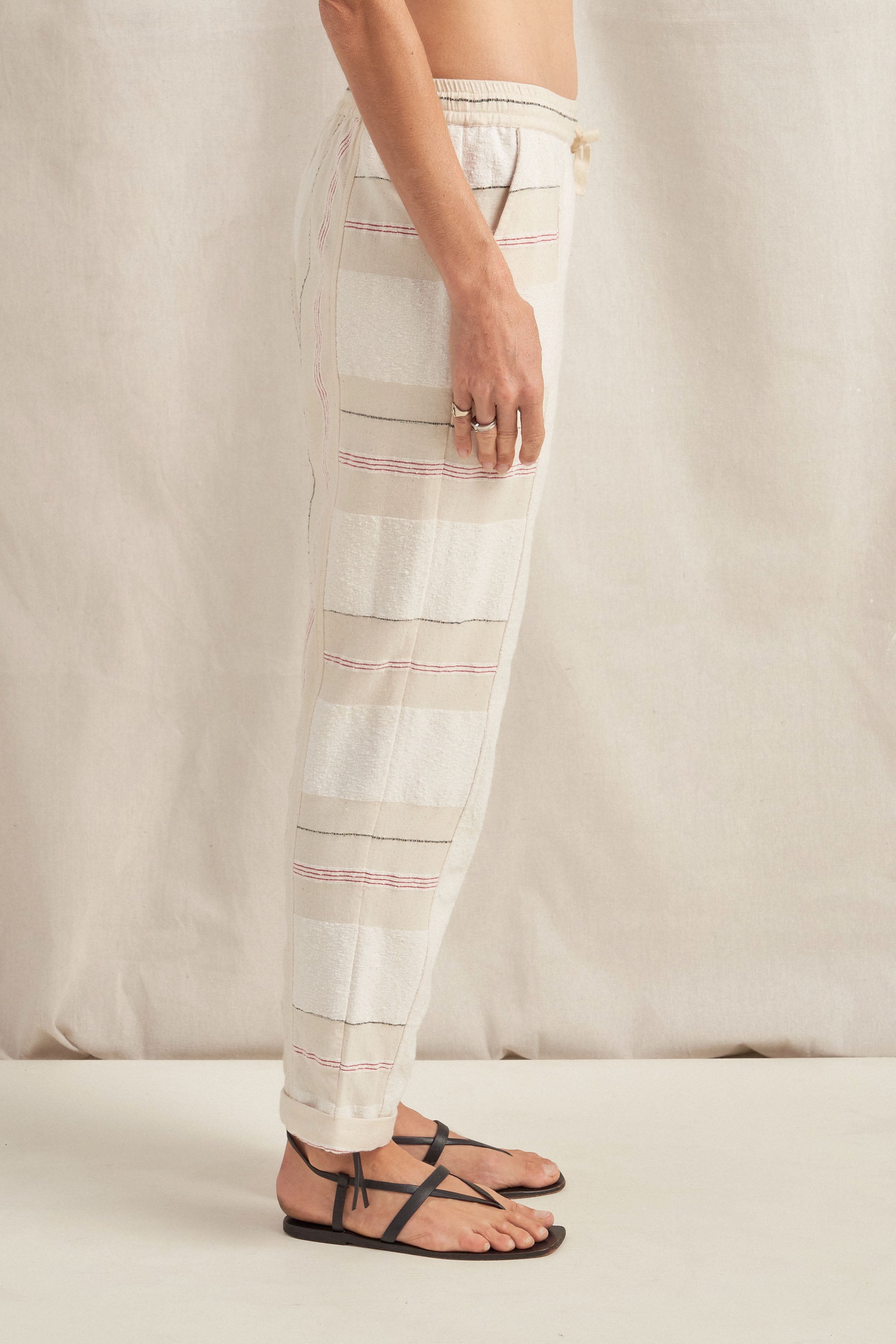 The Cadmus Pants are cut from our signature boucle stripe and feature an elastic waist, drawstring and side pockets. These luxe trousers were woven by hand on traditional handlooms. It takes two days to weave the fabric for one garment. The vertical stripes on the front panel elongate the silhouette. Wear with the Paris Shirt for a matching set.