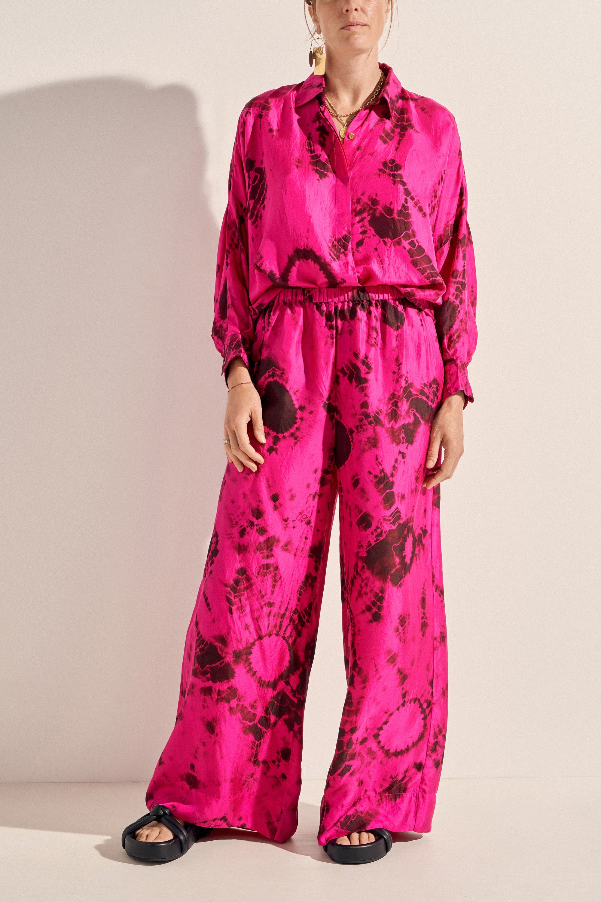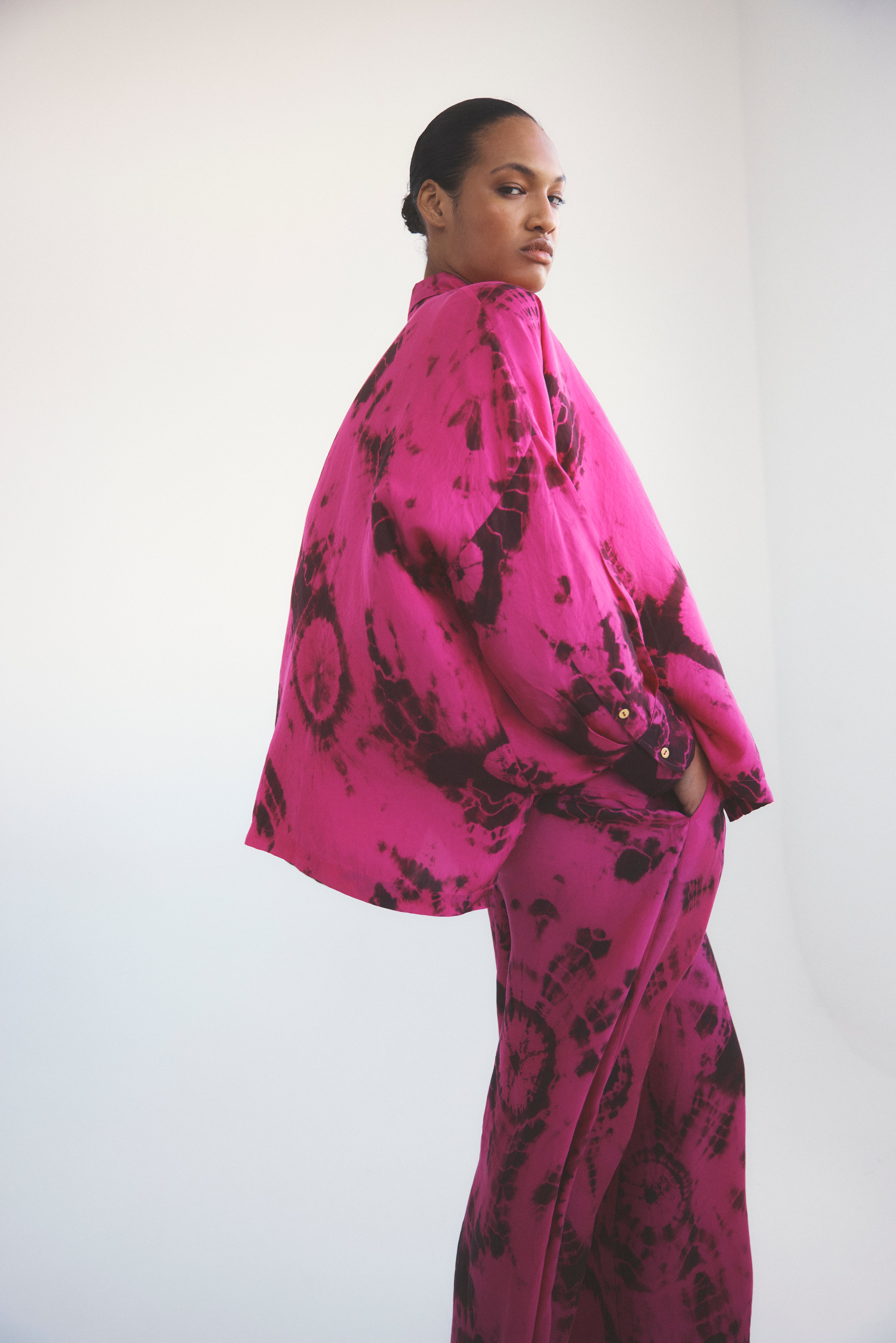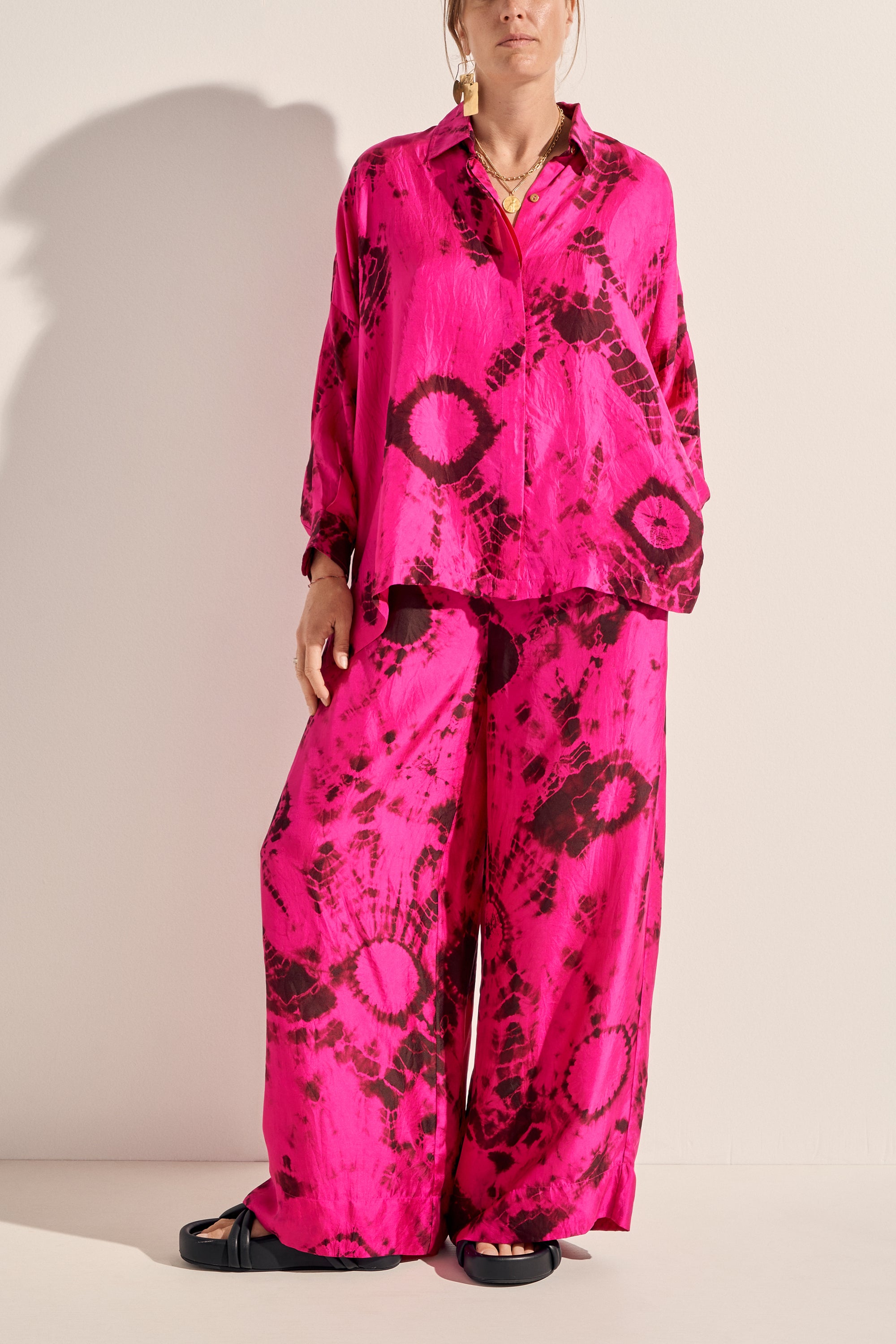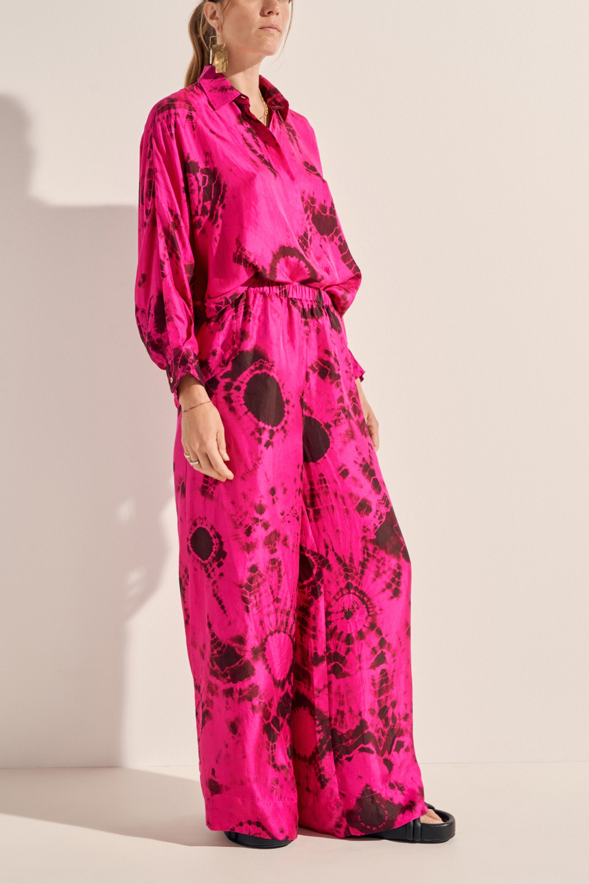 The Clio Pants are crafted in luxurious silk twill and individually hand-dyed in a small regenerative farm in Bengaluru, India. To create this stunning pattern, the artisans use an ancient dyeing technique based on tying the fabric before dyeing to resist the dye which create motifs through out the dye process. These luxe trousers are a guaranteed show stopper! Featuring an elastic waistband and side pockets, they can be worn with the Cronos Shirt for a bold matching set.