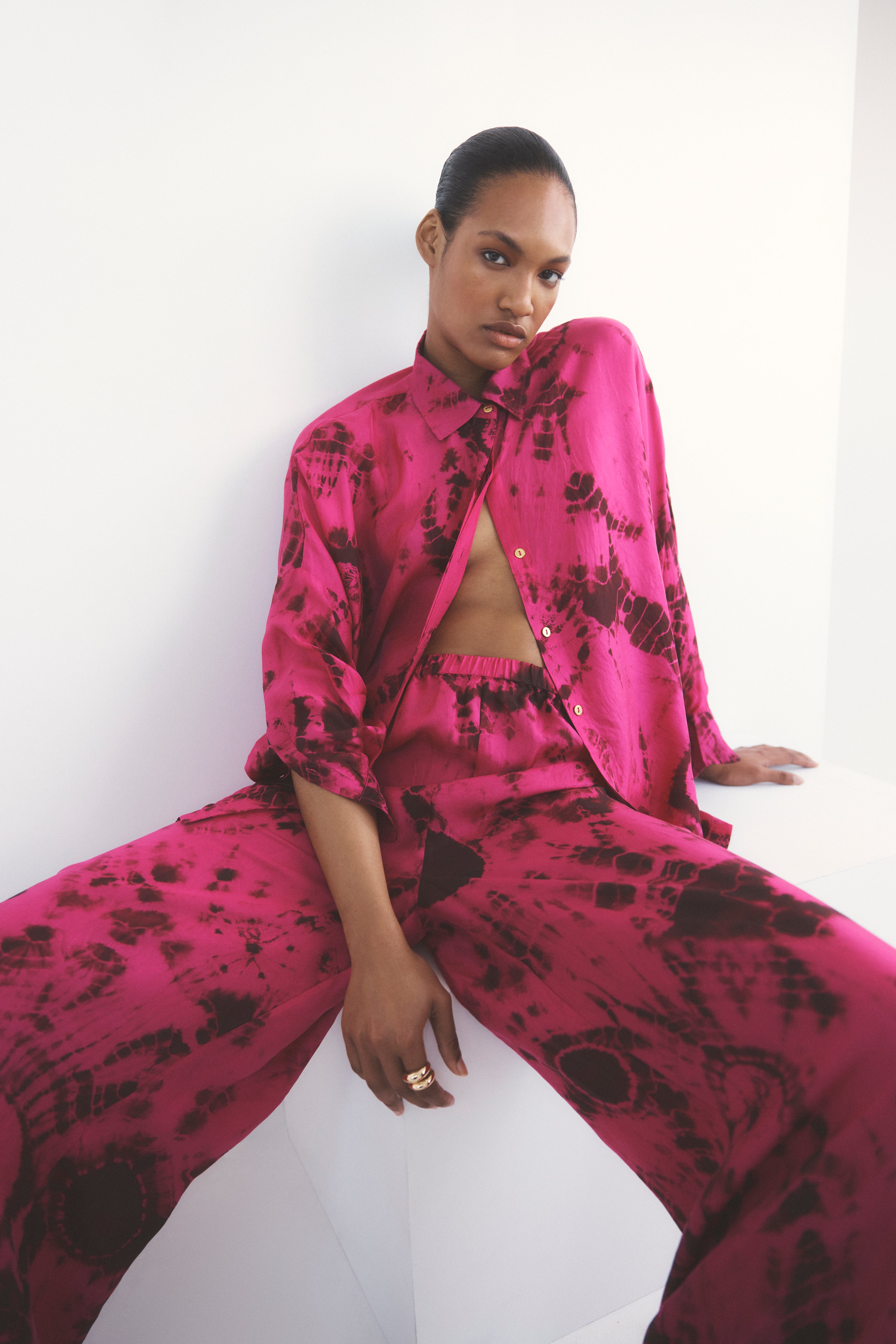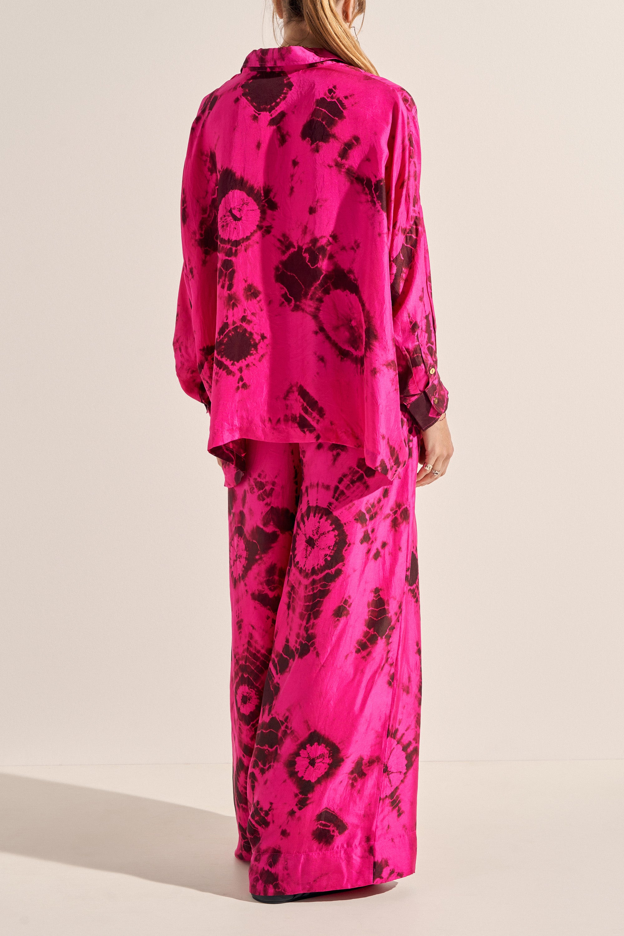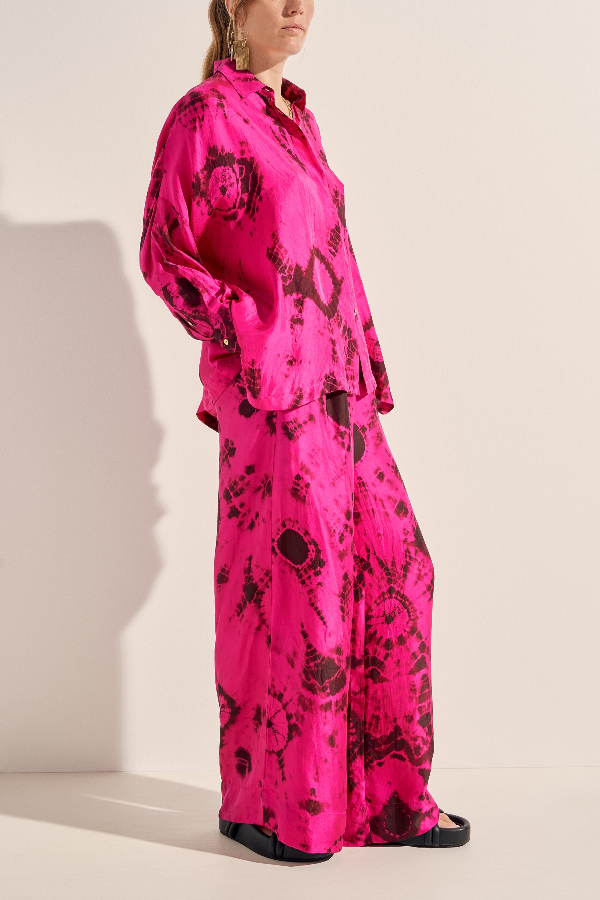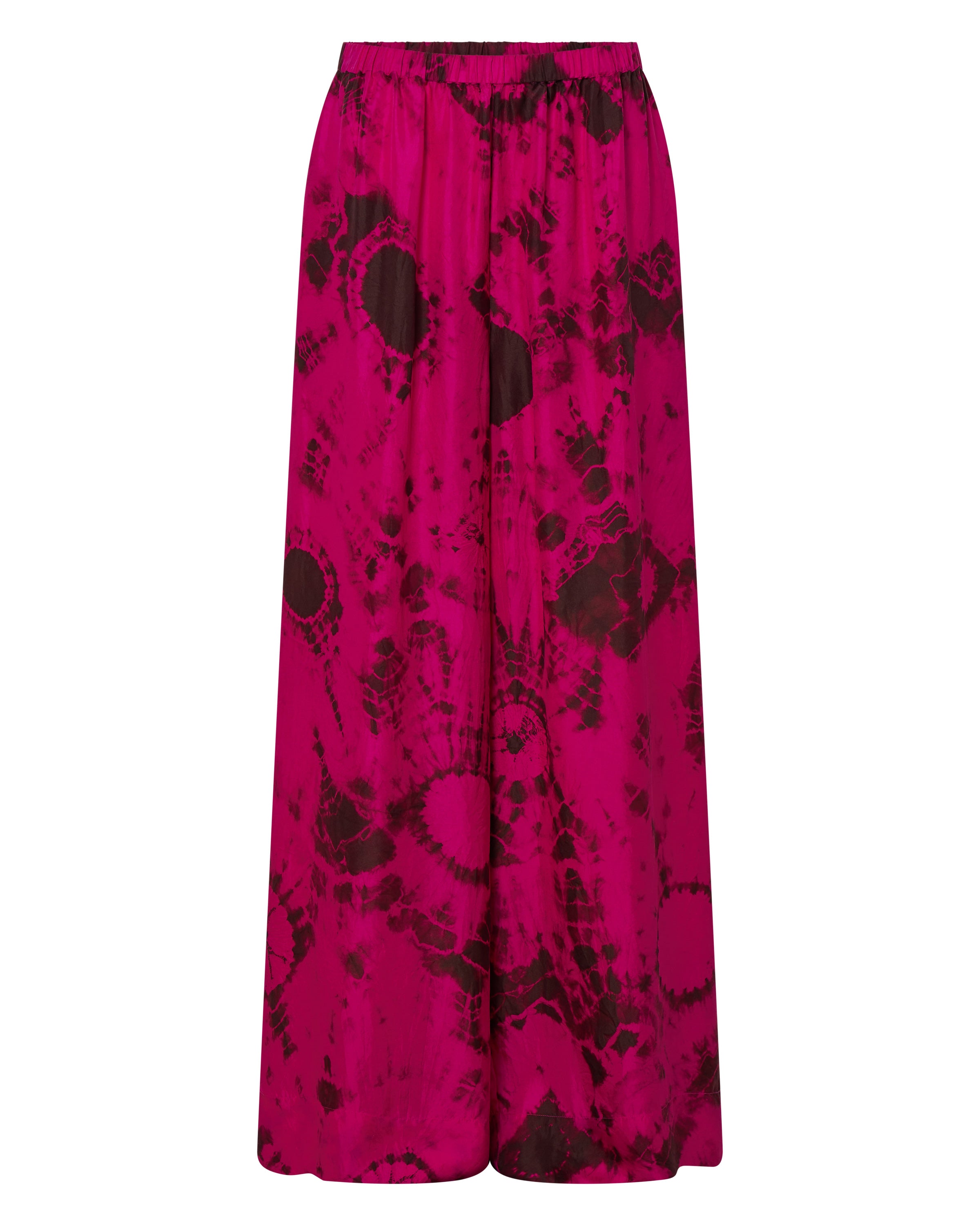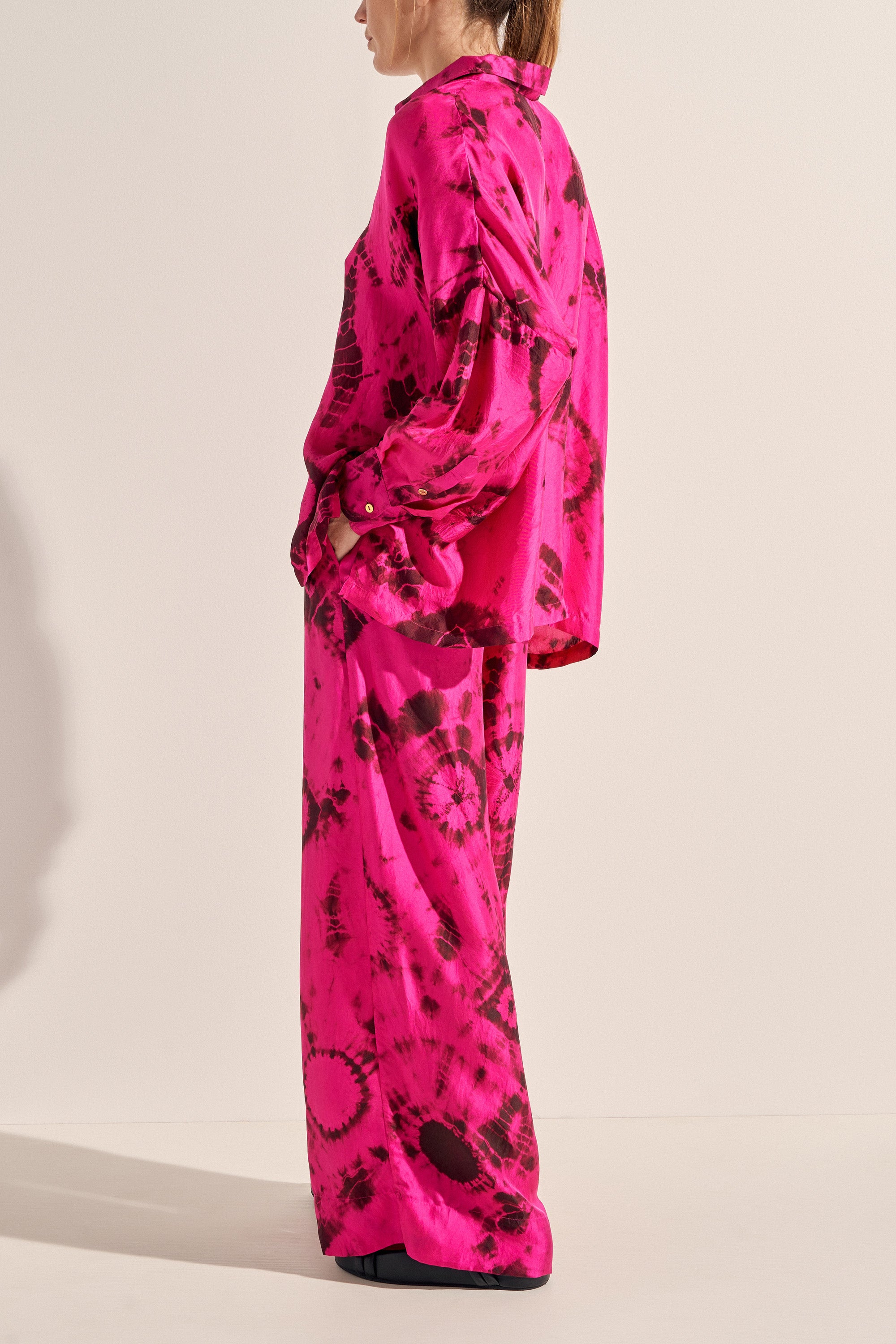 The Clio Pants are crafted in luxurious silk twill and individually hand-dyed in a small regenerative farm in Bengaluru, India. To create this stunning pattern, the artisans use an ancient dyeing technique based on tying the fabric before dyeing to resist the dye which create motifs through out the dye process. These luxe trousers are a guaranteed show stopper! Featuring an elastic waistband and side pockets, they can be worn with the Cronos Shirt for a bold matching set.