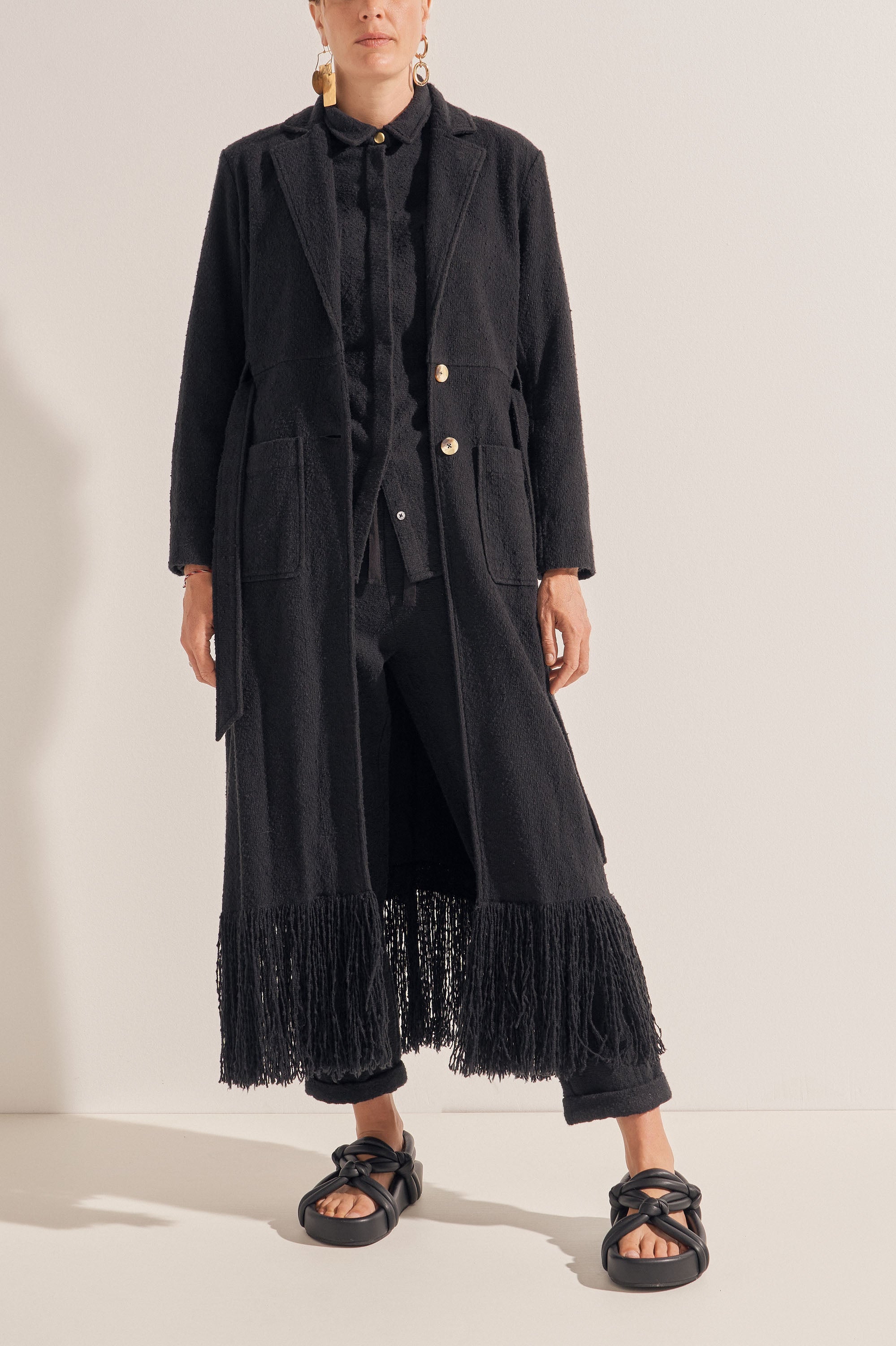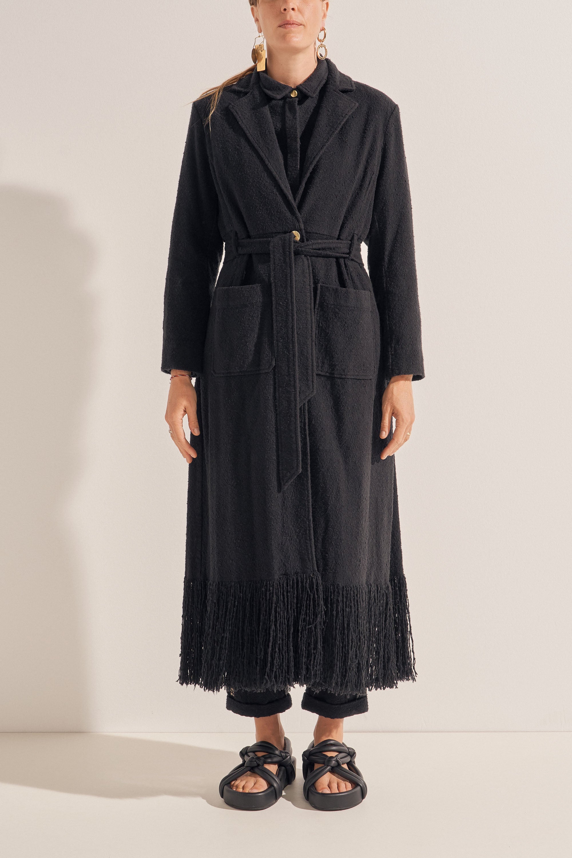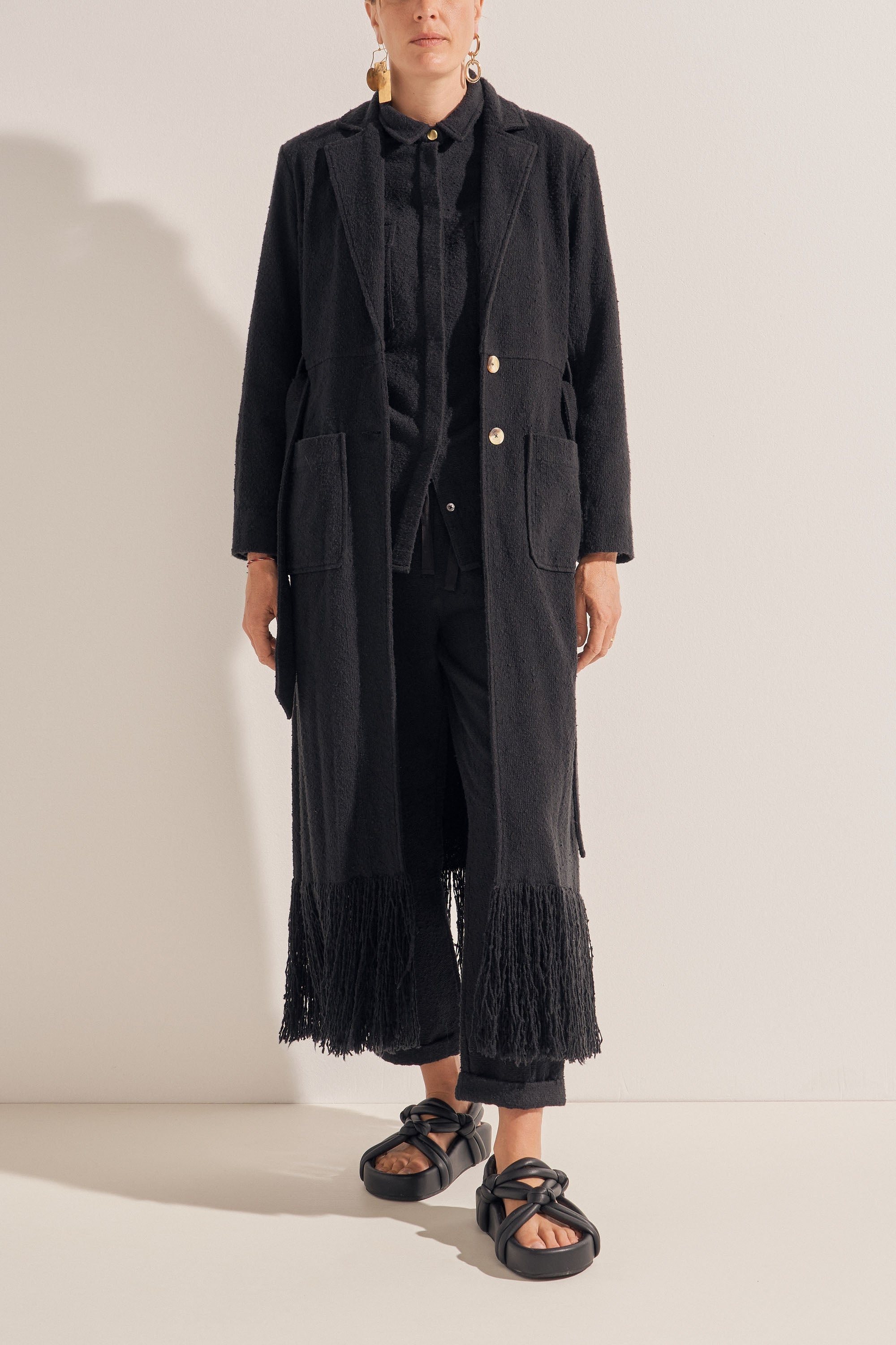The Crius Coat is hand-woven in the dreamiest cotton boucle creating a rich, warm and textured fabric. This piece features a fringed hem which was created by unravelling the fabric by hand, a separate belt and deep pockets. This luxurious coat is a winter favourite and must-have piece!