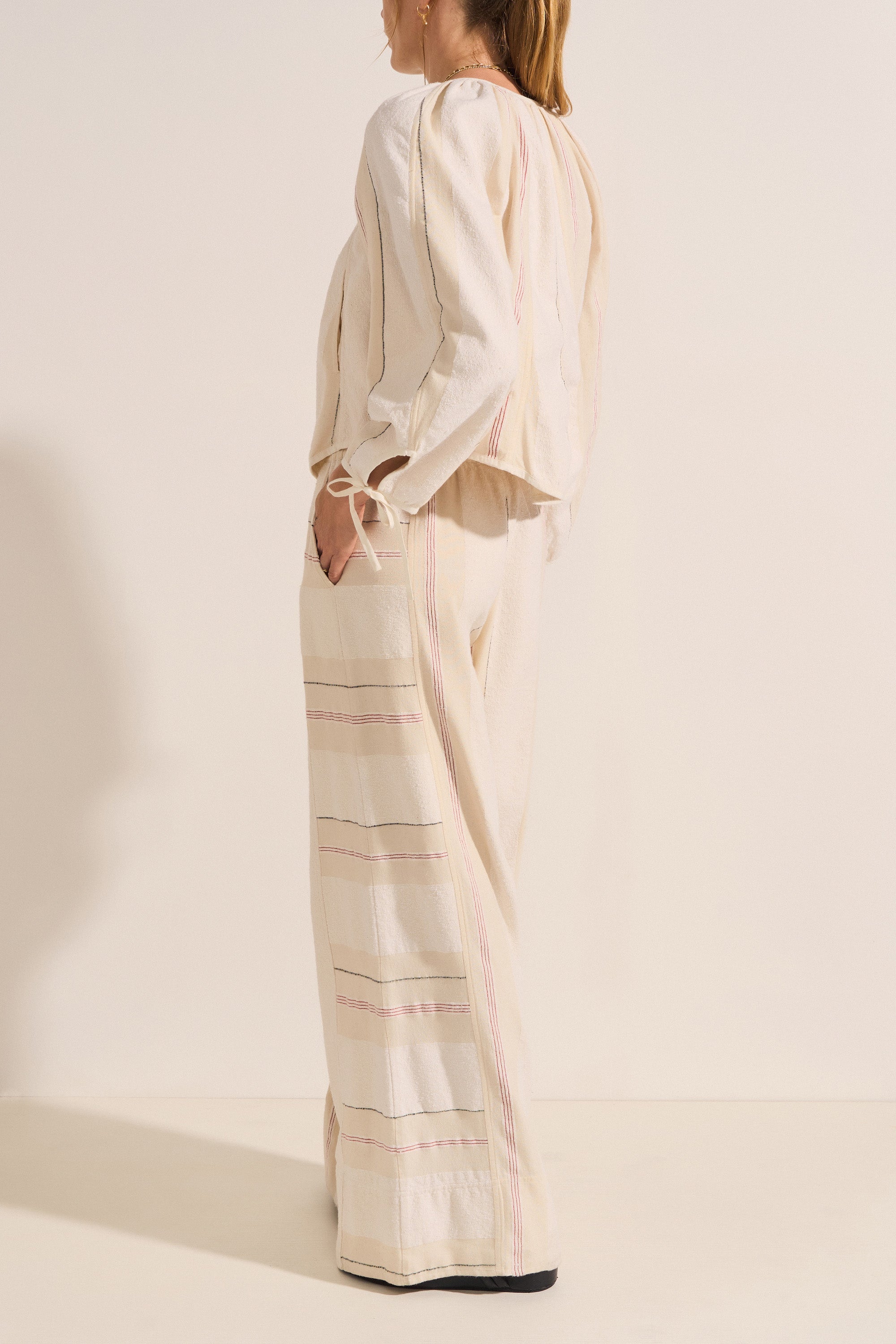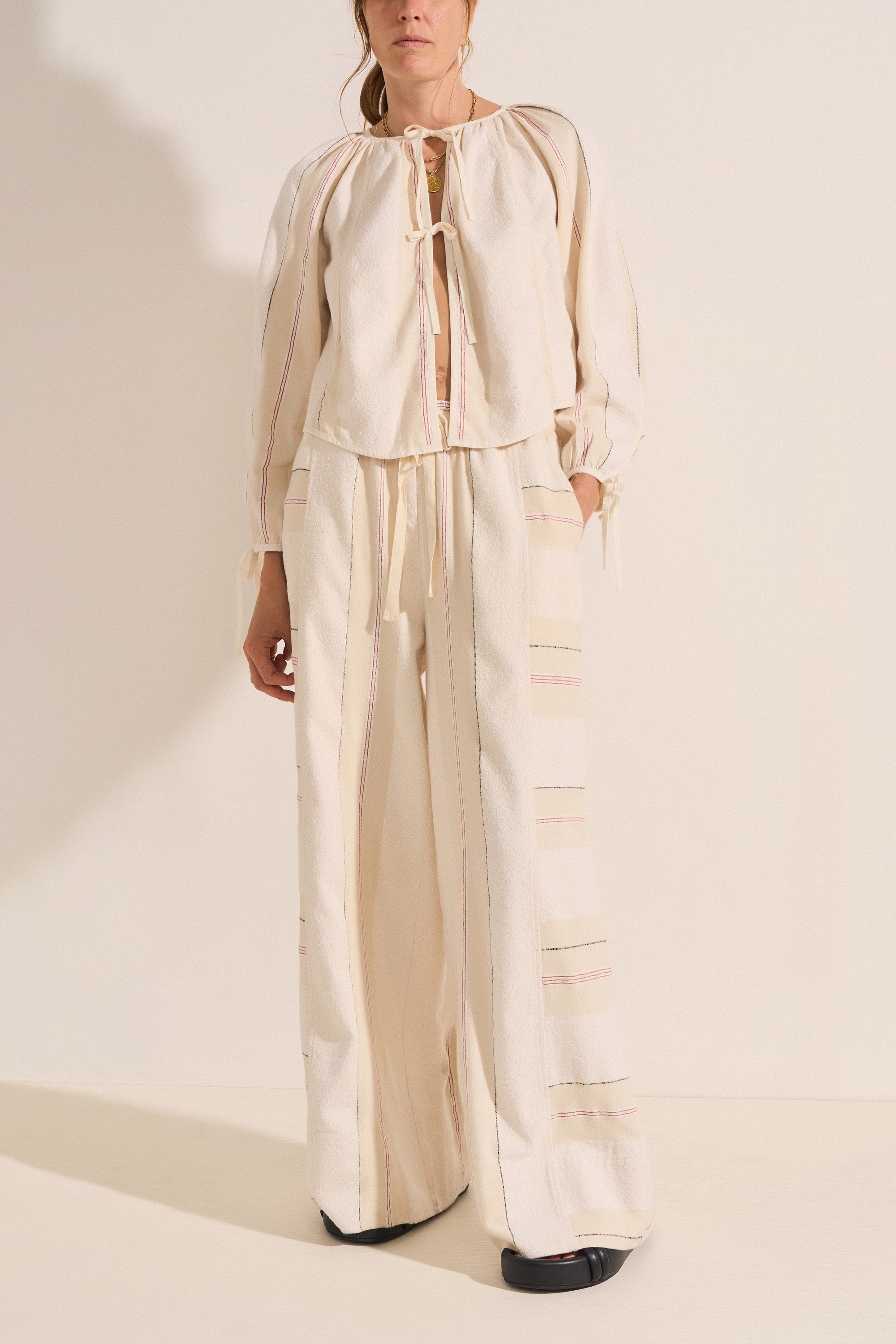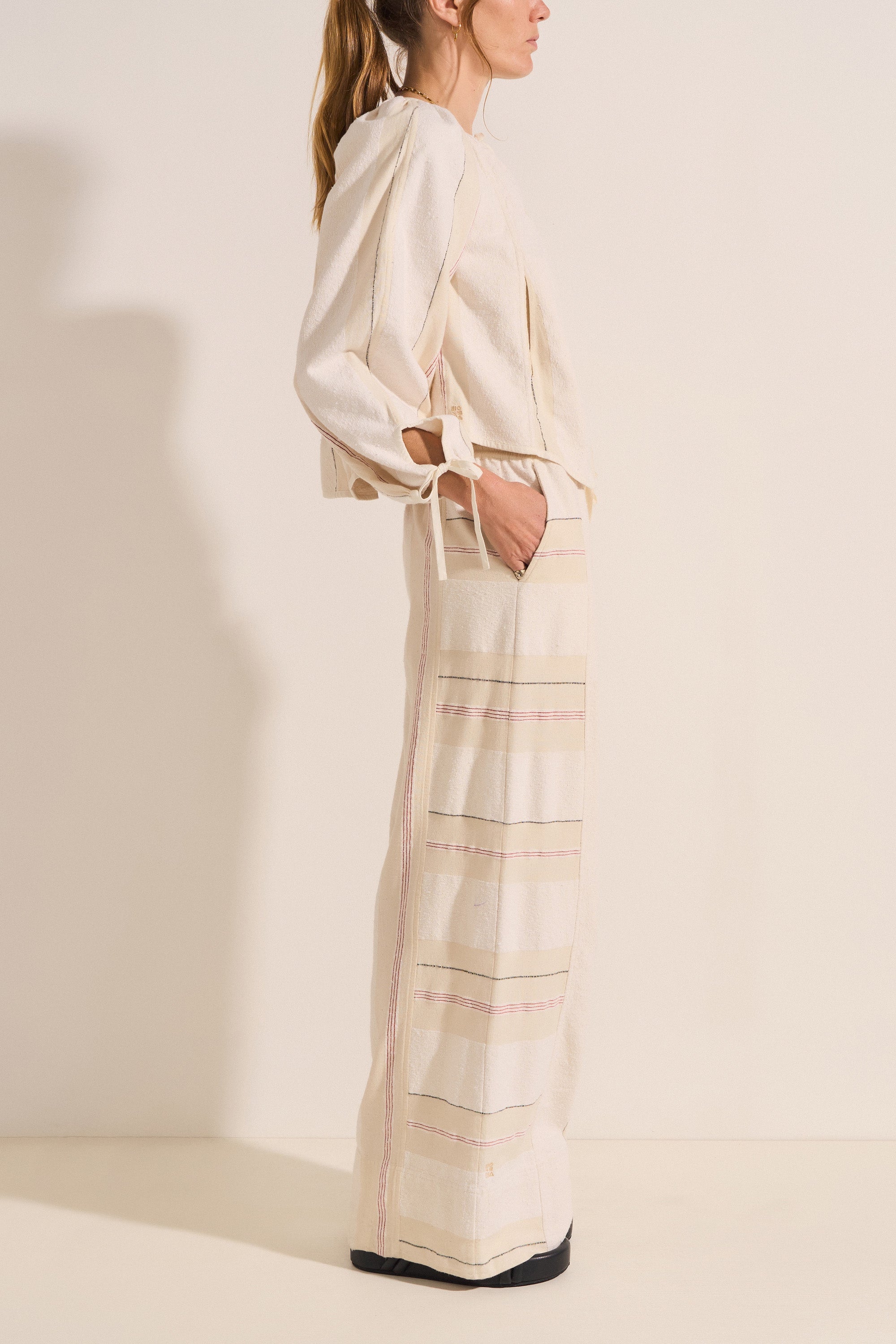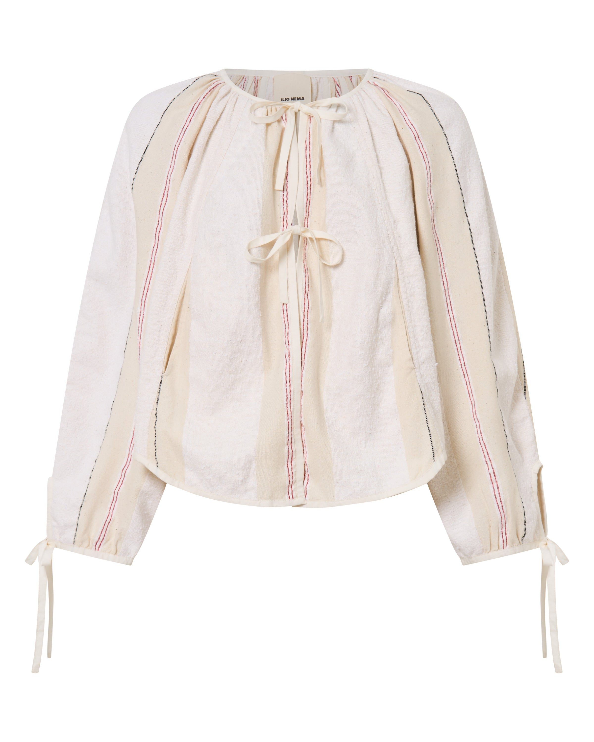 The Delian Jacket in Cream Boucle Stripe is crafted from handwoven fabric with a subtle cream stripe and red and black accents. Made by artisans in southern India, each piece takes over two days to weave, reflecting our commitment to slow, sustainable fashion. This cropped, relaxed-fit jacket features a tie-up front, gathered neckline, bracelet-length sleeves and a shirt-tail hemline. Perfect for layering on cooler summer nights, it pairs beautifully with the matching Clio Pants or Abas Mini Skirt.