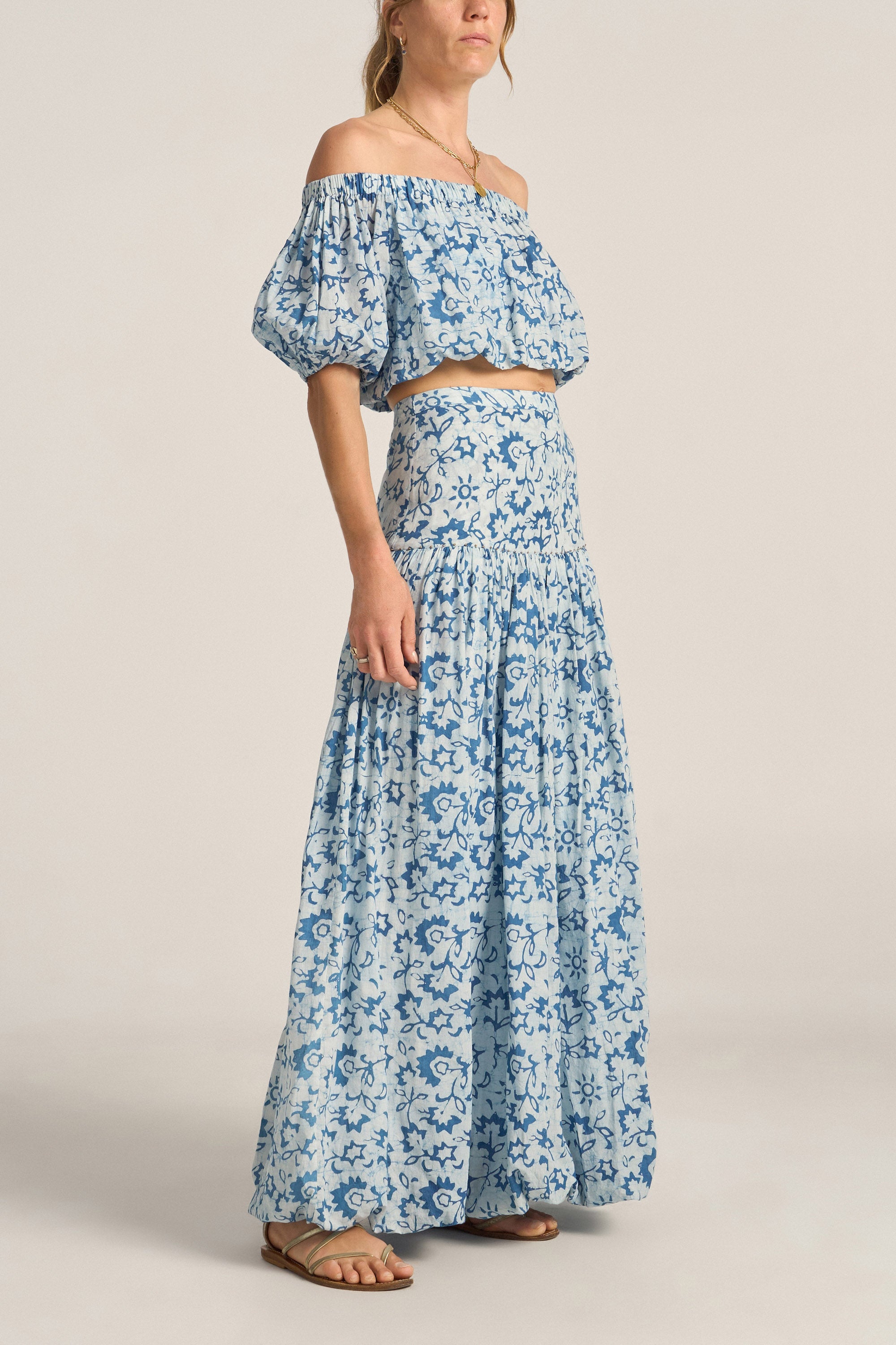 The Elli Top is a playful, summery statement crafted in a soft indigo batik printed voile. Featuring a bubble silhouette with voluminous puff sleeves and a cropped length, this top brings a whimsical touch to any outfits. Perfect for pairing with the Merope Skirt or with jeans, the Elli Top combines a artful feel with timeless artisanal craftsmanship.