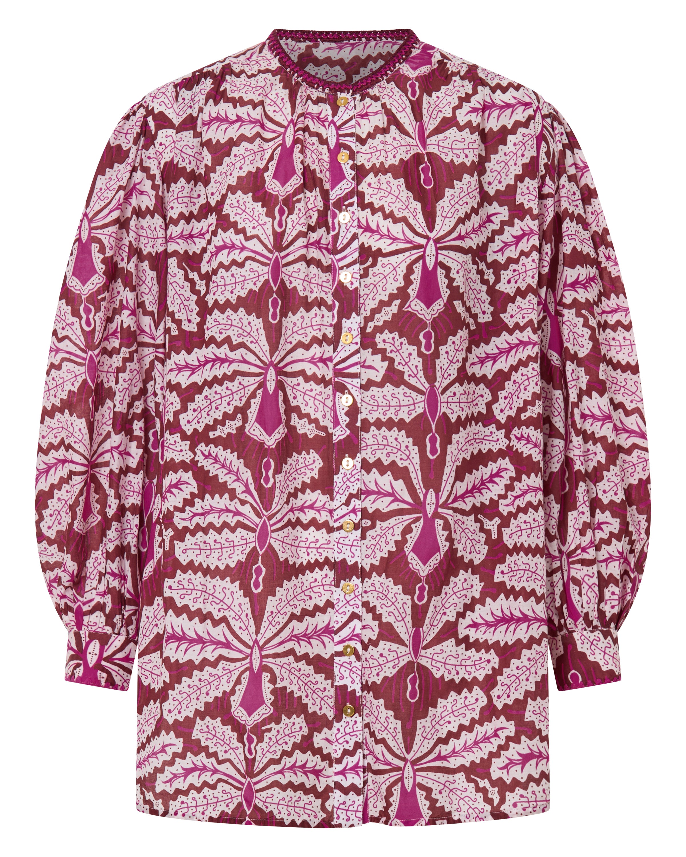 The Enna Blouse in Fuchsia Orchid Print is a chic bohemian piece made from the softest organic cotton voile. With a softly gathered neckline and hand-crochet neckband, it offers effortless style. The long poet sleeves feature buttoned cuffs with hand-crochet details, while the vibrant floral print makes it a perfect light blouse for summer. Pair it with the Asia Skirt for a coordinated, feminine look.