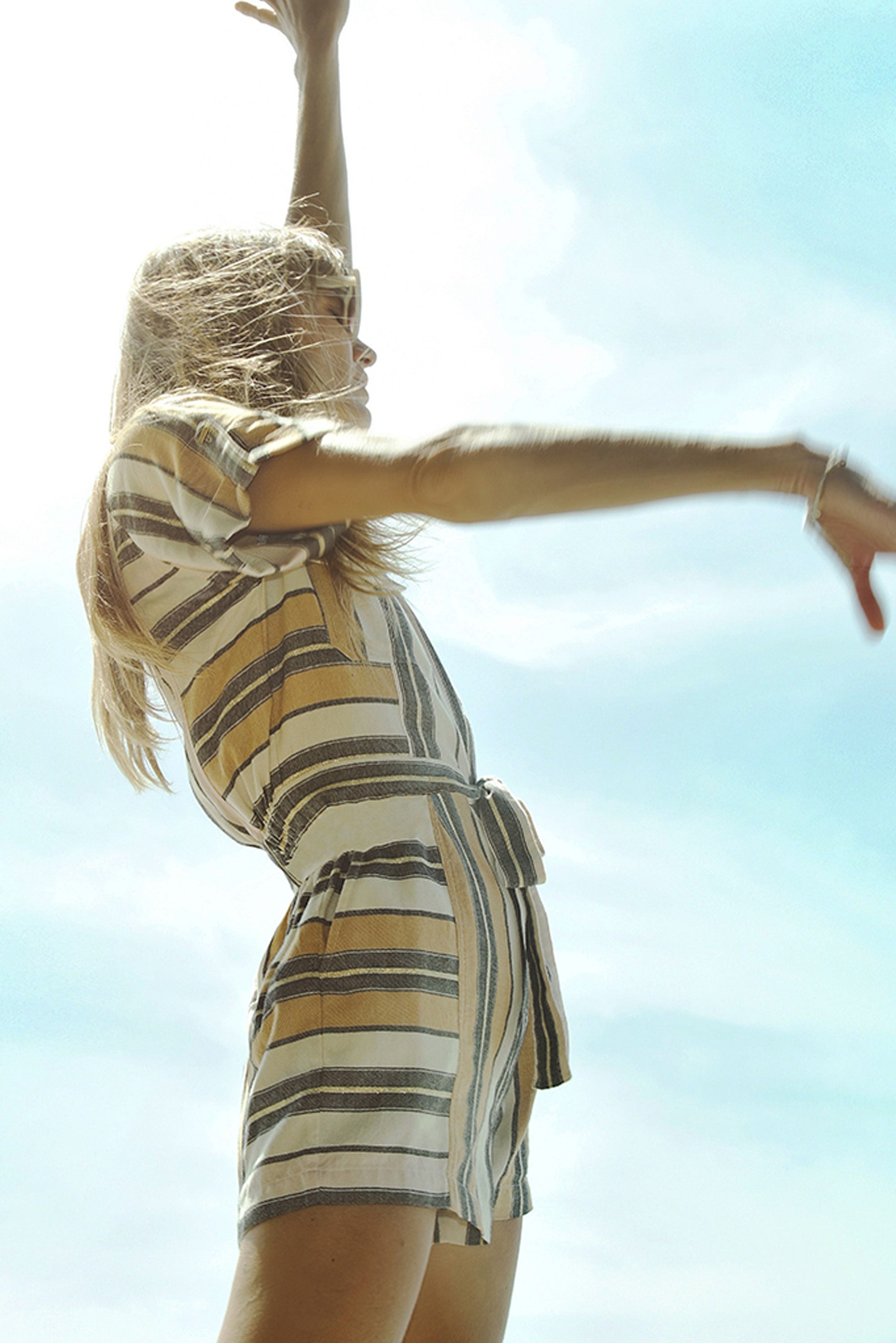 This silhouette is the perfect summer version of our boilersuit. Made in our beautiful hand-woven stripe with luxurious gold lurex accents, this playsuit is a season favourite! It features a centre front zipper, patch pockets, rolled sleeve details and a separate belt to cinch in the waist. Wear it with a basket to the beach or at night with your favourite jewellery.