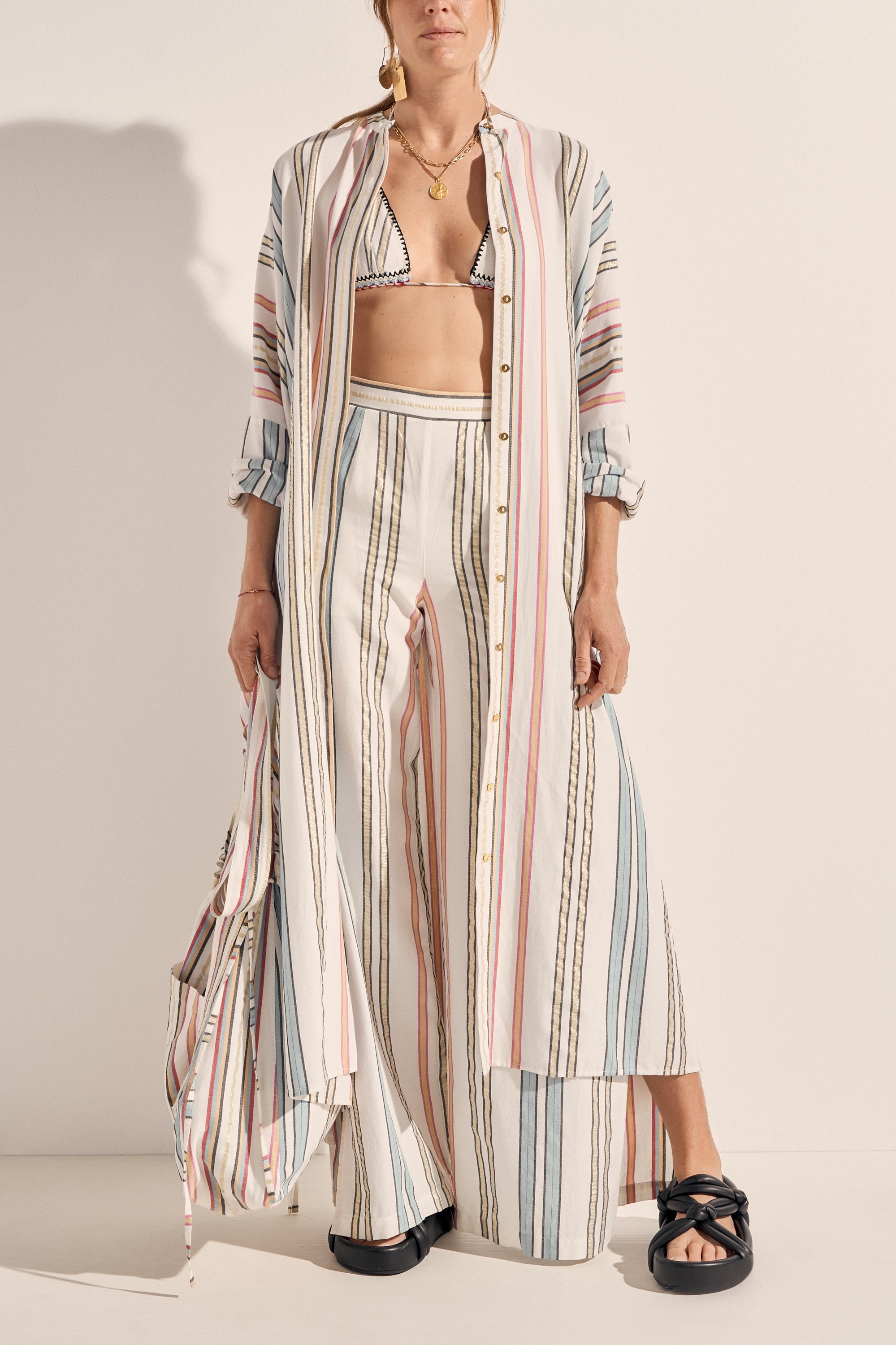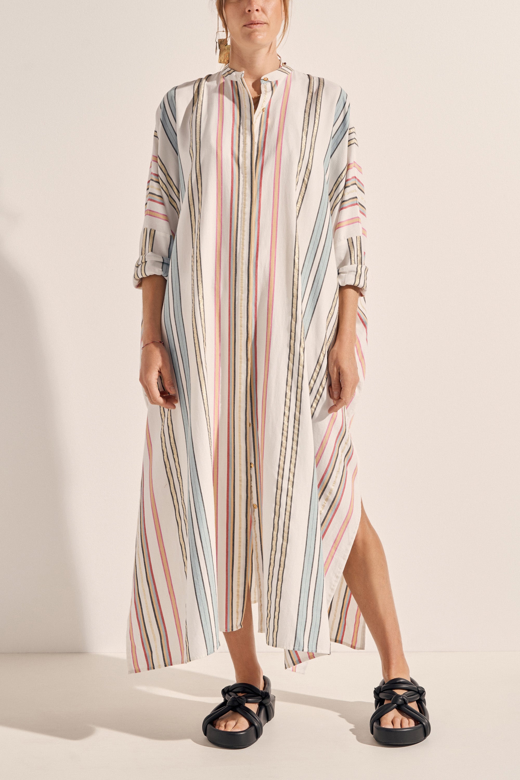 The Pollux Dress is an effortless oversized shirt dress crafted in our multi-colour Byron Stripe featuring gold accents which shimmer in the sunshine. This statement piece is both simple yet feminine. An easy-wear style that is an ultra-cool outfit for a Saturday lunch or for the beach as a cover-up. Perfect as a layering piece and dramatic when worn as a dress on its own!