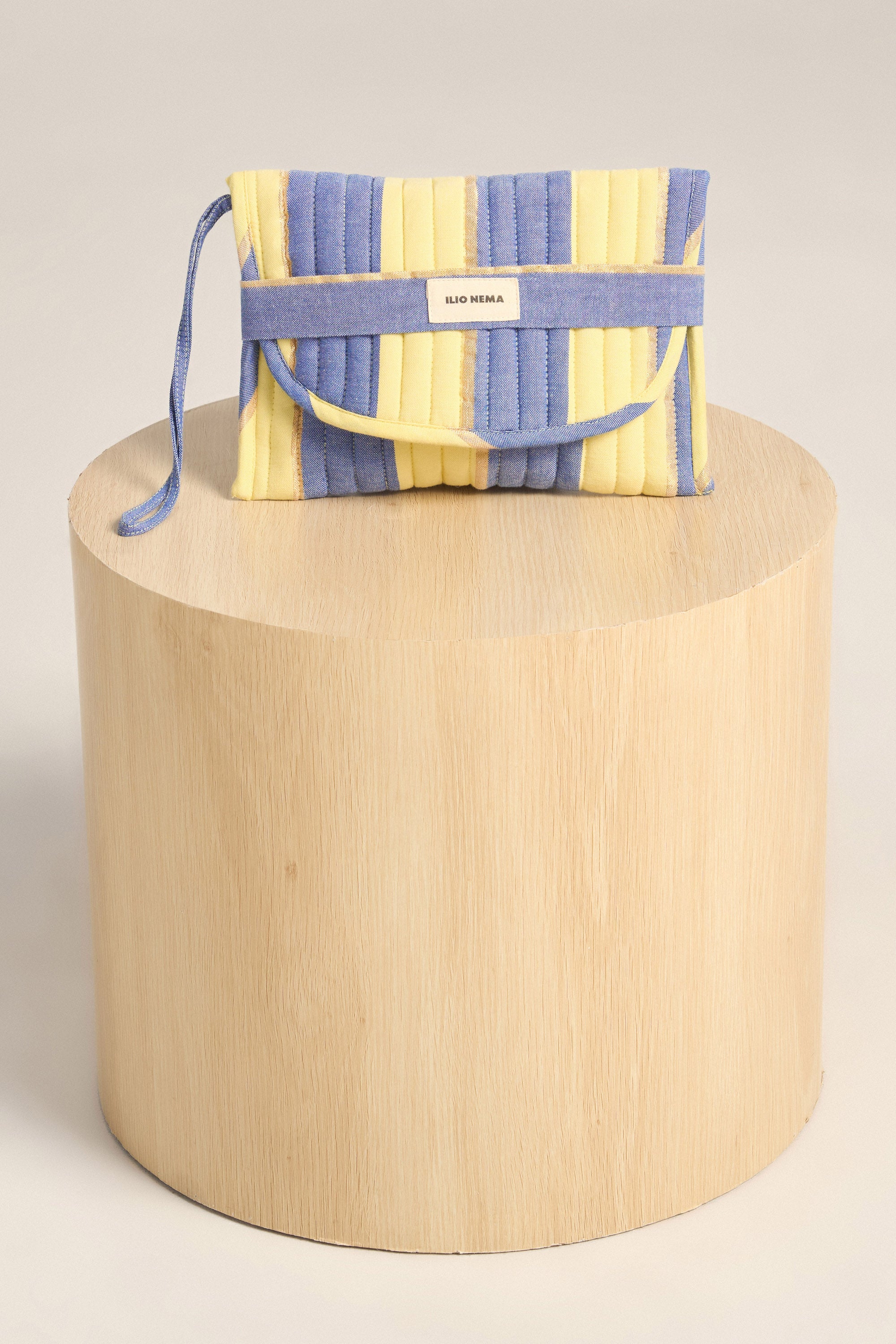 This cute beach pouch is the perfect holiday accessory and Christmas gift. Made from fabric cut-offs, this quilted envelope is crafted by local weavers in India, featuring our signature Xania Stripe with gold accents. The pouch includes a wrist loop for easy carrying and fits perfectly inside any handbag. It’s the ideal size for a pocket-sized book or A5 journal, making it a great beach companion or beauty pouch for your favourite makeup.