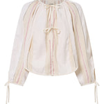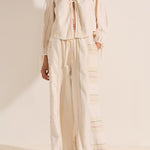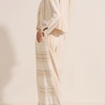 The Delian Jacket in Cream Boucle Stripe is crafted from handwoven fabric with a subtle cream stripe and red and black accents. Made by artisans in southern India, each piece takes over two days to weave, reflecting our commitment to slow, sustainable fashion. This cropped, relaxed-fit jacket features a tie-up front, gathered neckline, bracelet-length sleeves and a shirt-tail hemline. Perfect for layering on cooler summer nights, it pairs beautifully with the matching Clio Pants or Abas Mini Skirt.