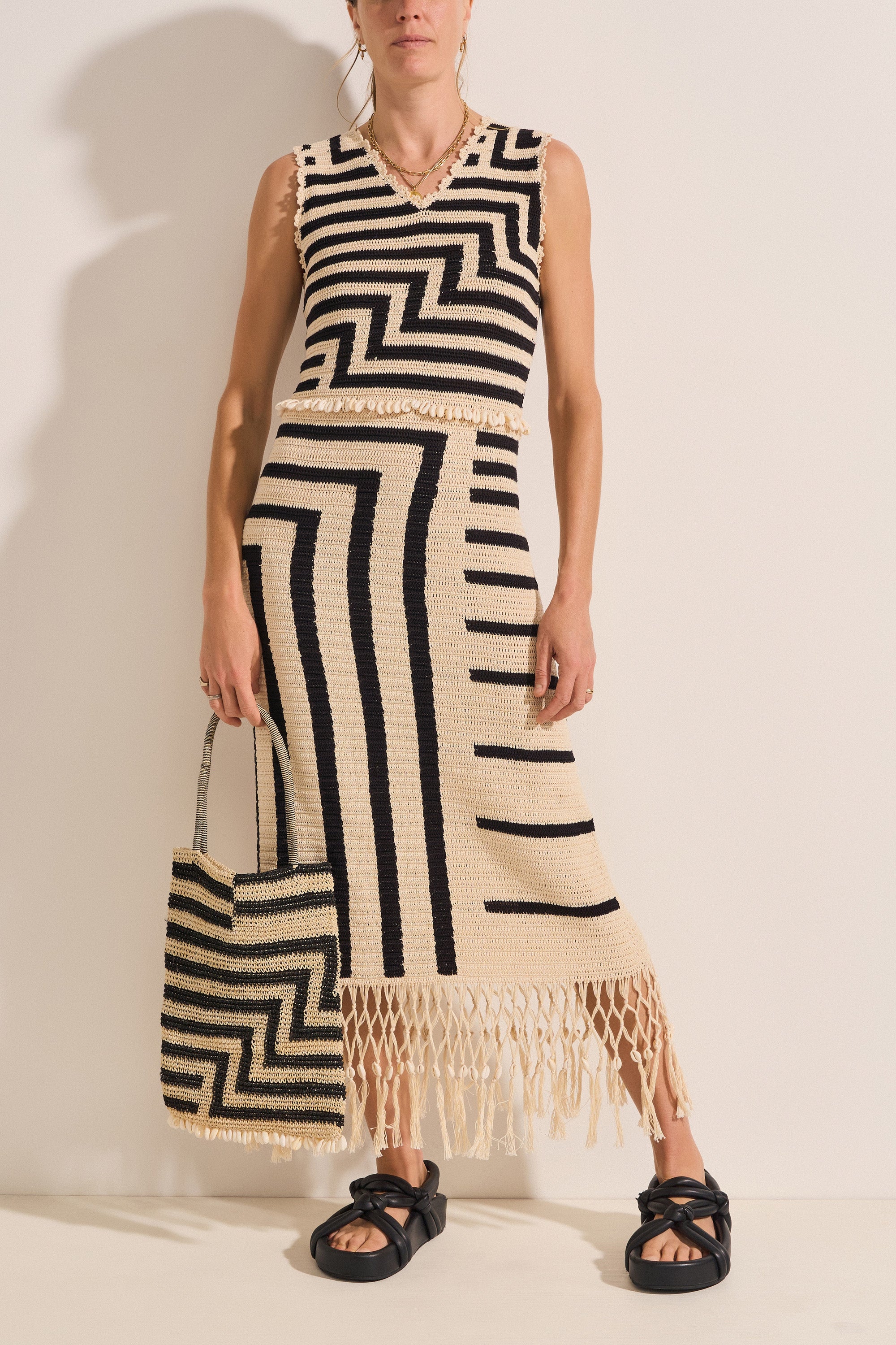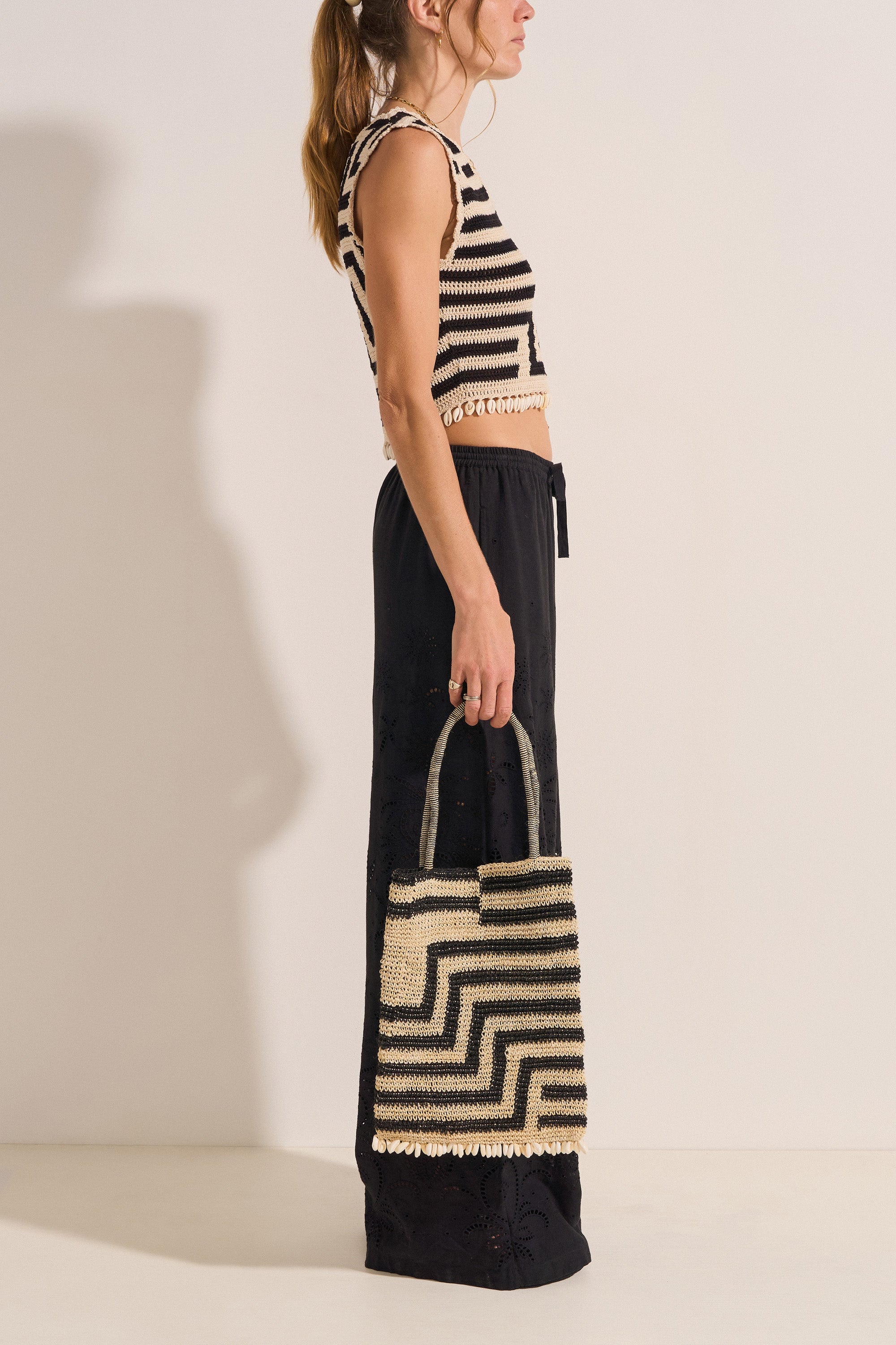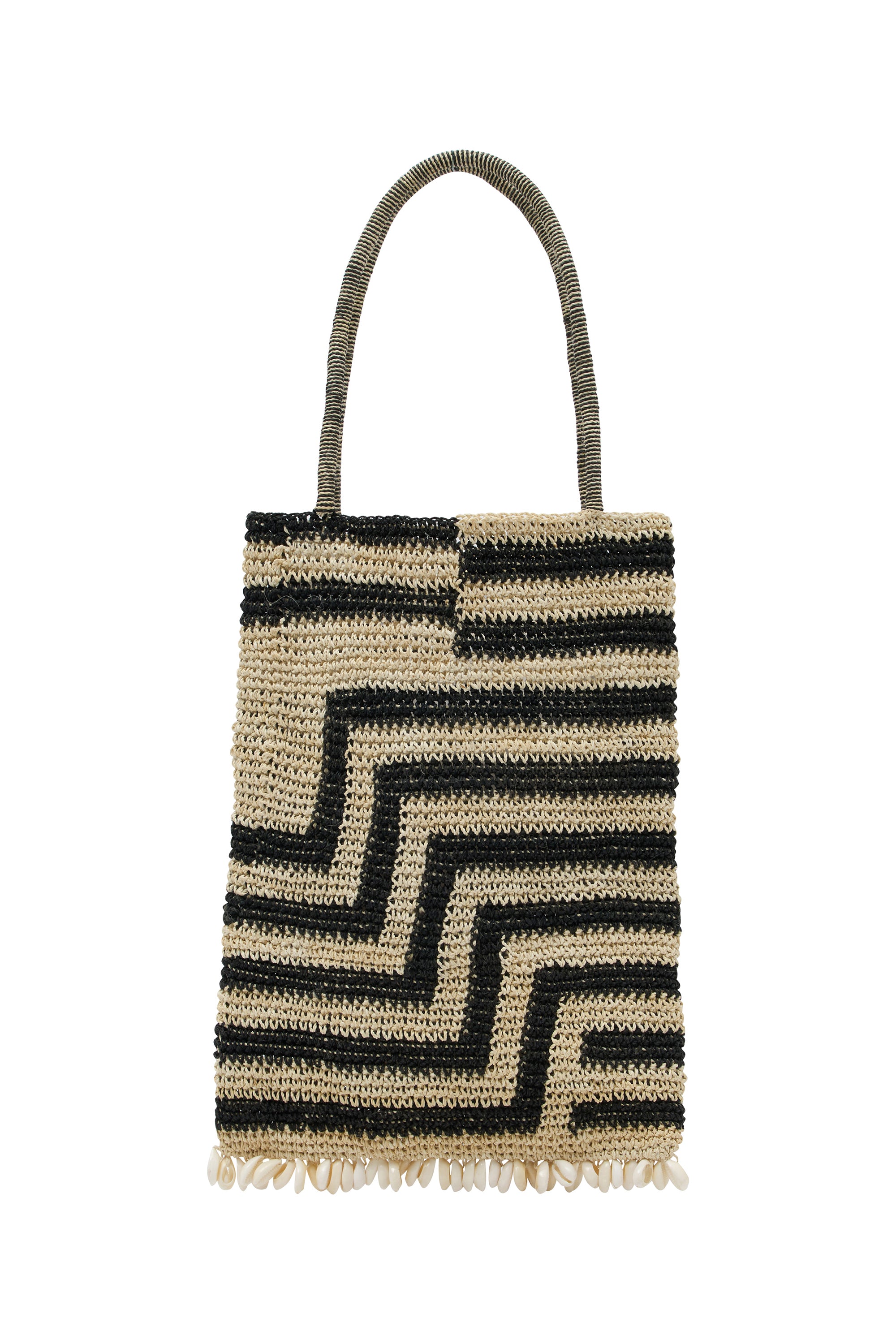 The Icarus Chambira Tote in black and white features an asymmetrical stripe design, handwoven and adorned with seashells. Made from Chambira, a palm native to the Amazon Rainforest, it showcases exceptional Peruvian craftsmanship. The fibre is naturally dyed with local plants and hand-crocheted for a unique finish. Perfect as a statement piece with jeans or paired with the Calais Top or Camilla Dress for a coordinated look.