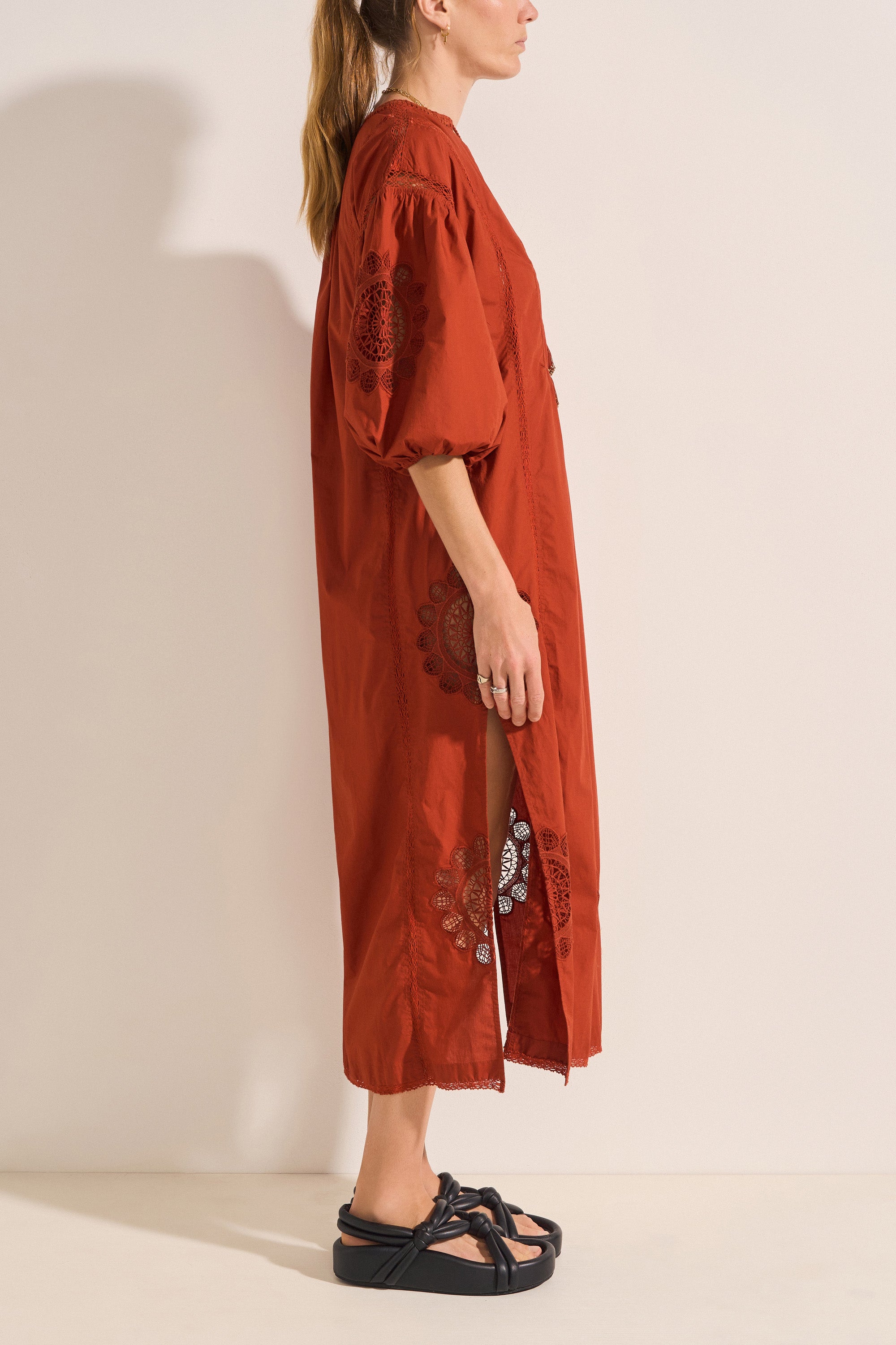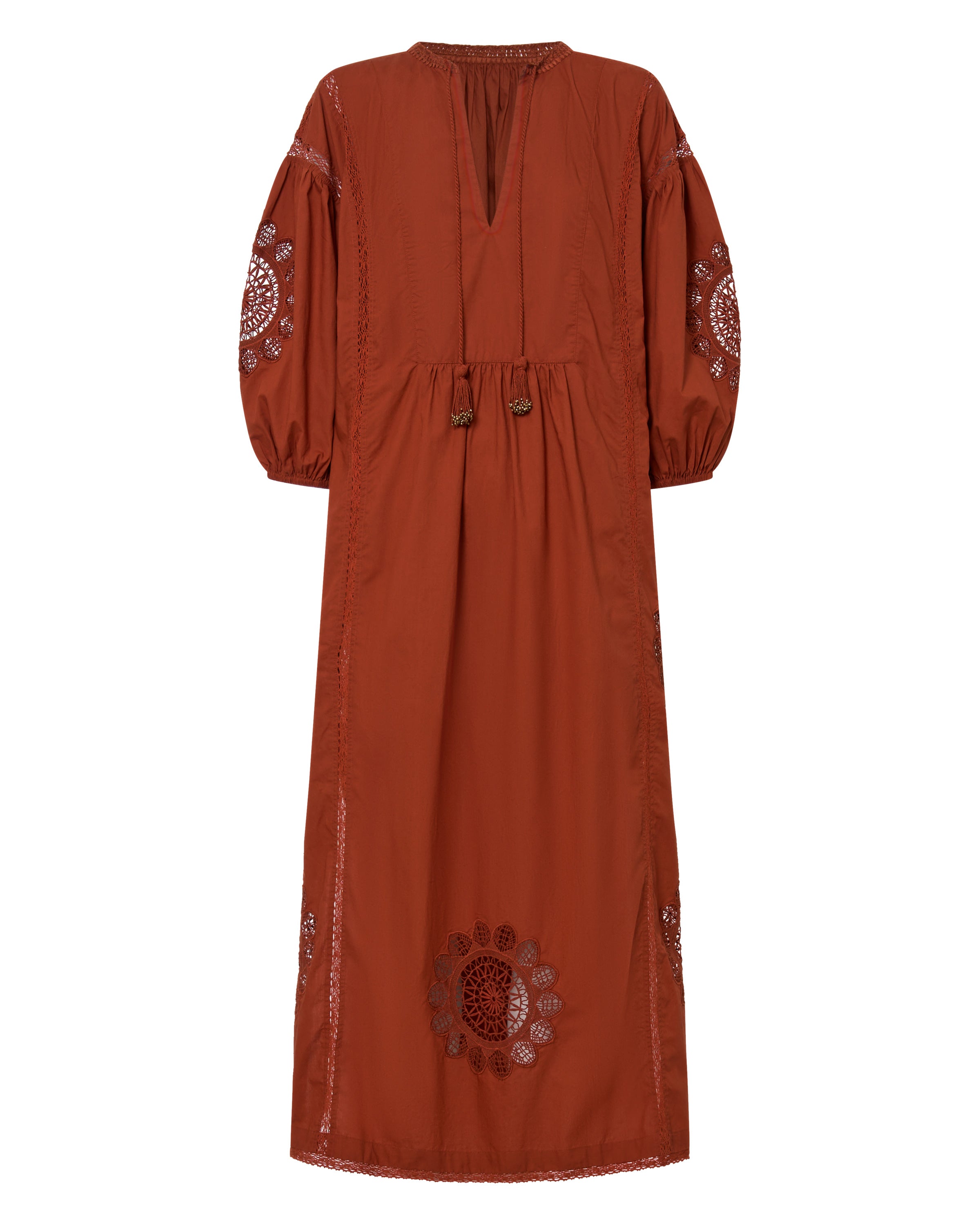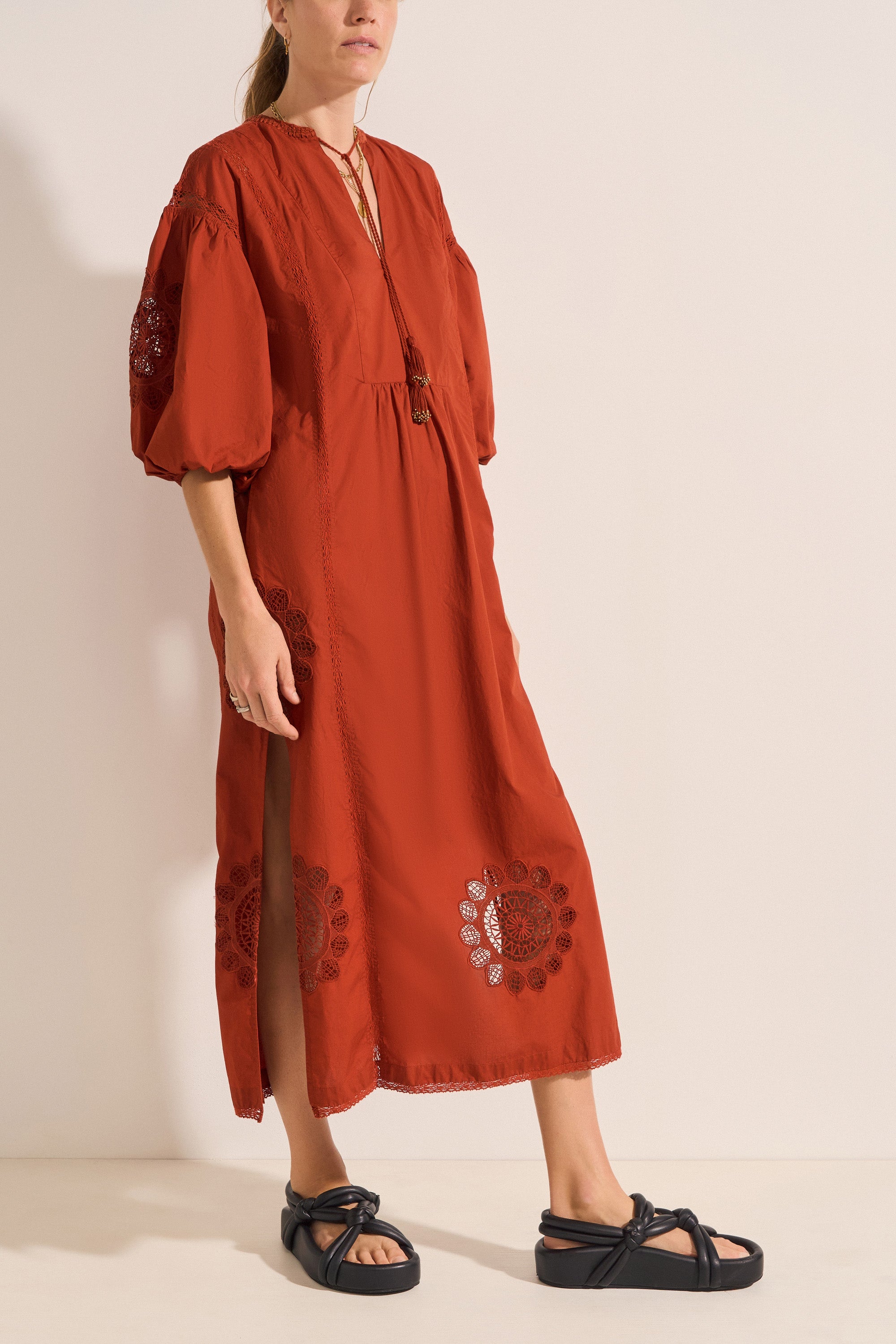 The Circe Dress is a feminine piece crafted from cotton poplin. Adorned with delicate lace appliqué at the sleeves and hemline, and intricate cotton lace detailing throughout, it exudes effortless charm. The dress features a flattering V-neckline with hand-crochet detail and tassels, 3-quarter puff sleeves, and side slits. With its loose silhouette and maxi length, it’s the perfect choice for a summer soirée, blending elegance and ease in a single, stunning design.