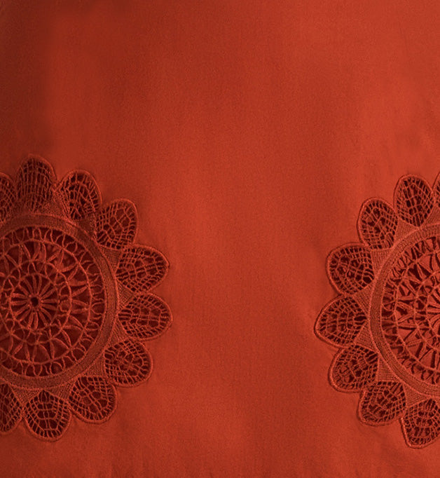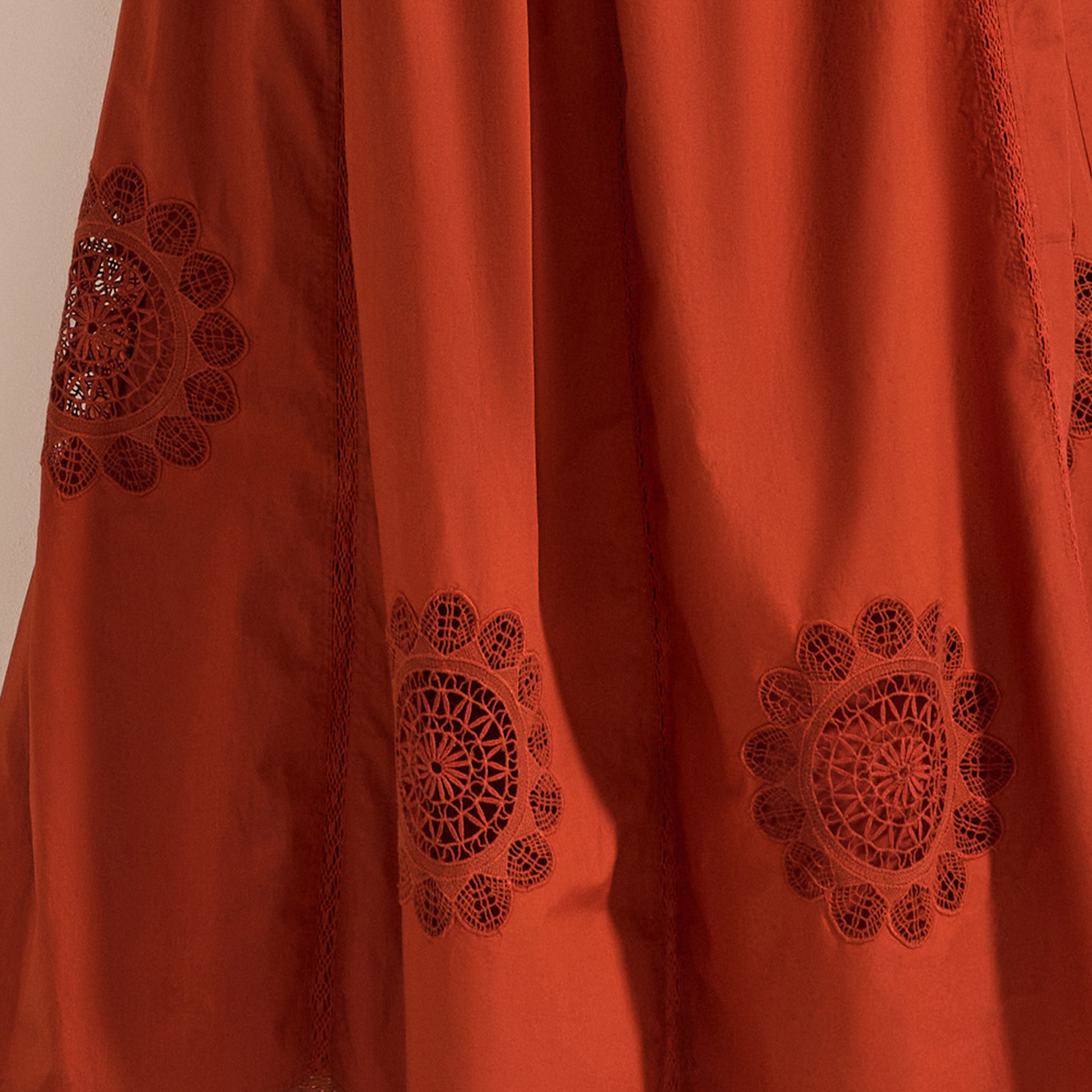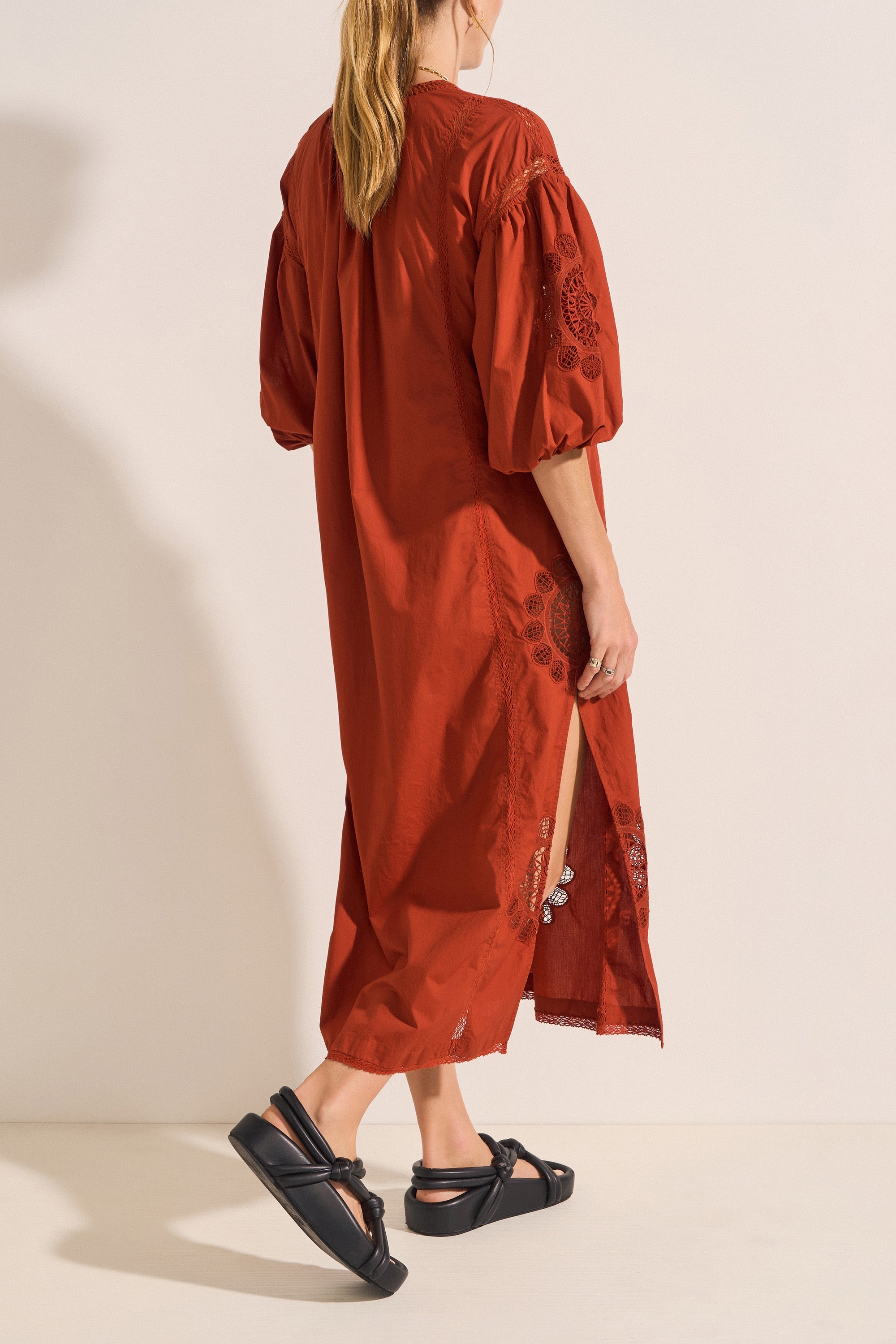 The Circe Dress is a feminine piece crafted from cotton poplin. Adorned with delicate lace appliqué at the sleeves and hemline, and intricate cotton lace detailing throughout, it exudes effortless charm. The dress features a flattering V-neckline with hand-crochet detail and tassels, 3-quarter puff sleeves, and side slits. With its loose silhouette and maxi length, it’s the perfect choice for a summer soirée, blending elegance and ease in a single, stunning design.