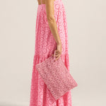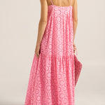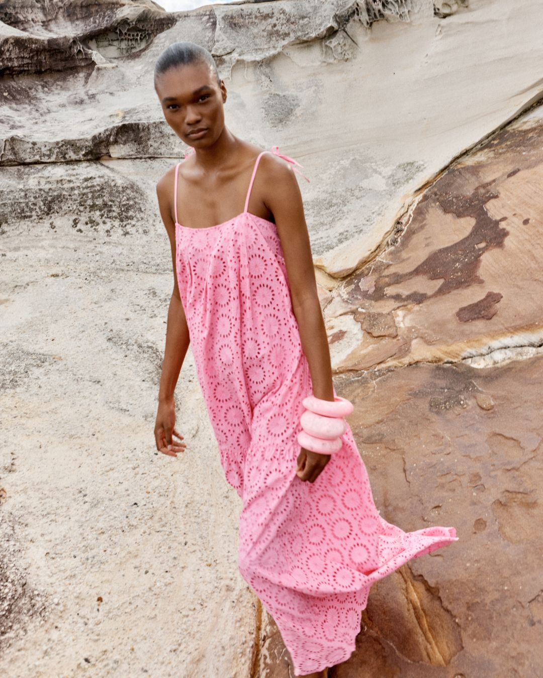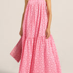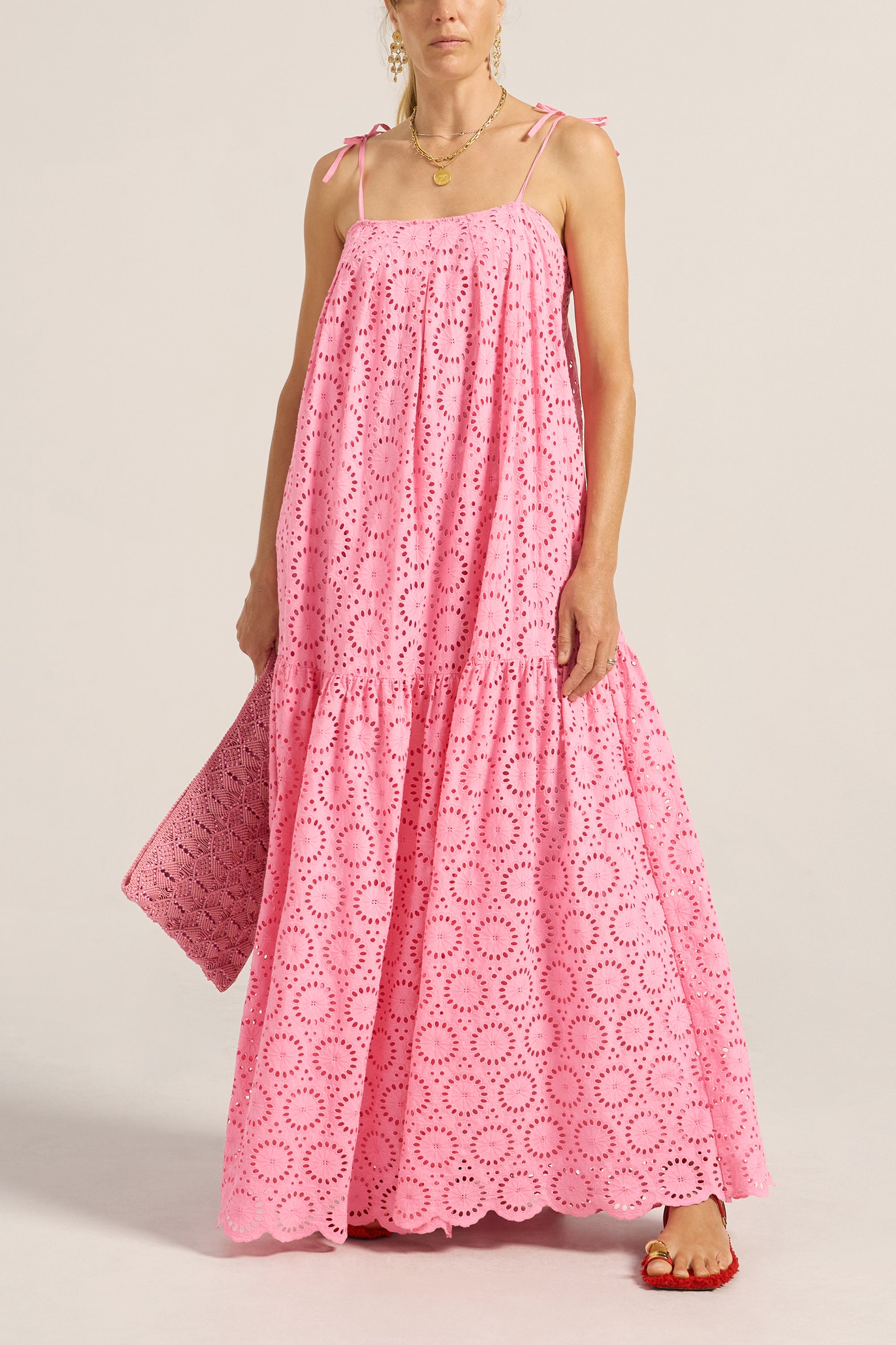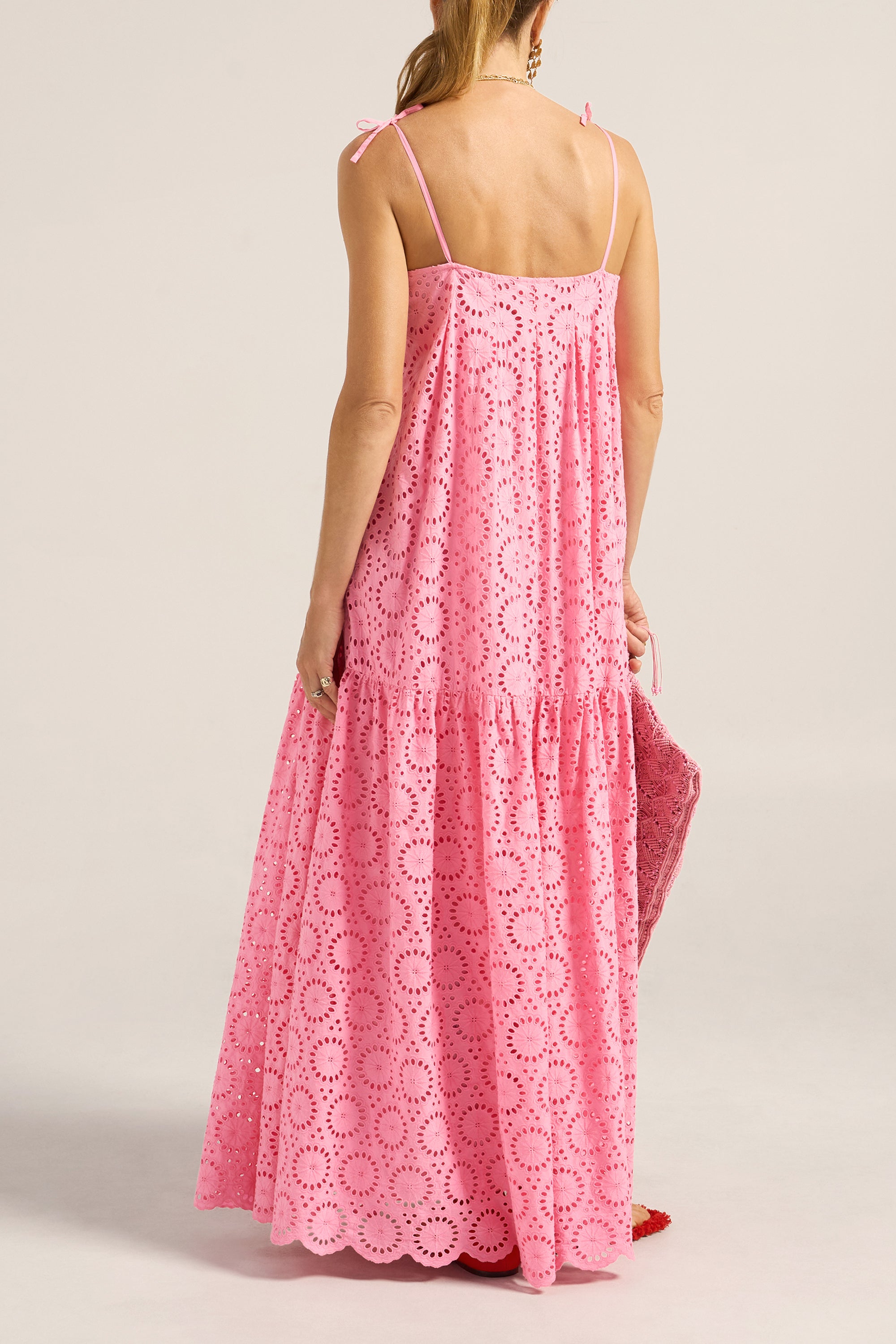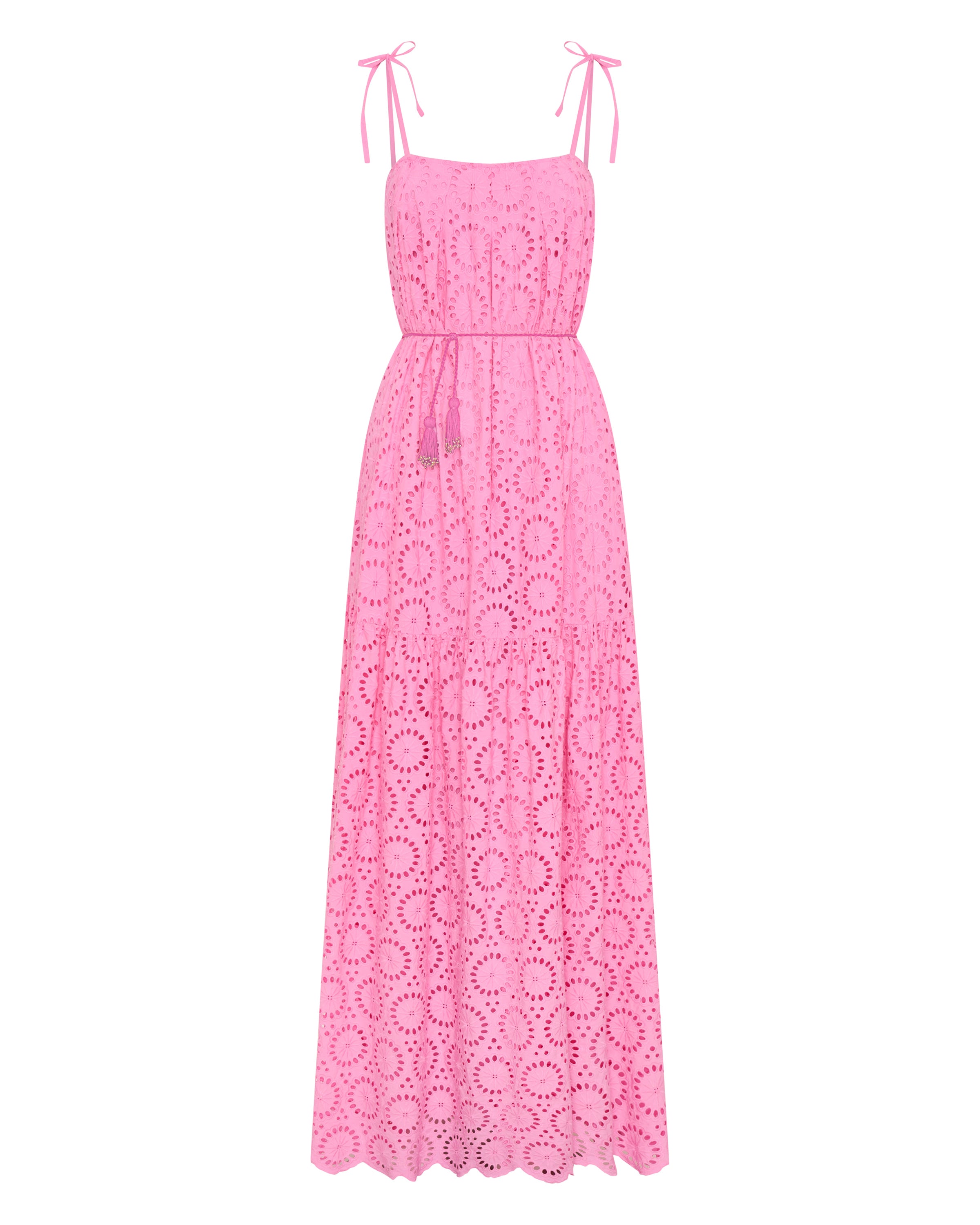 The Ammon Dress is a stunning maxi silhouette crafted from crispy pink cotton eyelet. This show stopping piece features graceful thin shoulder straps and a beautifully tiered design that begins mid-thigh, creating luxurious volume and movement with every step. The feminine silhouette is perfectly balanced by a waist rope that defines and flatters, while a discreet side zipper ensures an elegant, seamless finish. The intricate eyelet detailing brings an artisanal quality to this timeless dress, making it equally suited to sun-drenched garden parties and balmy evening celebrations.