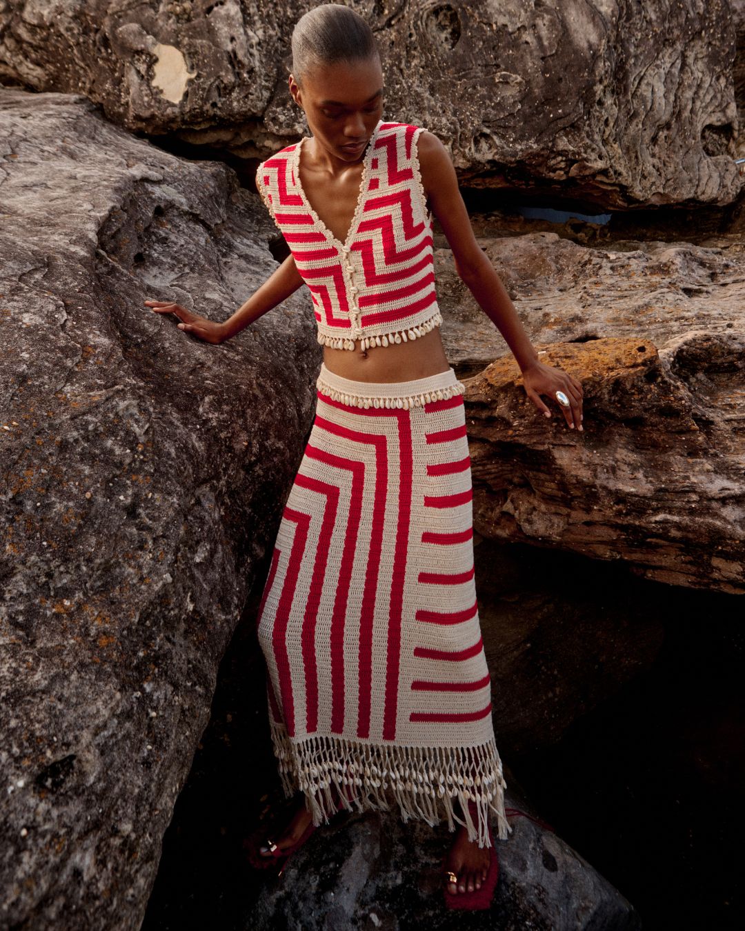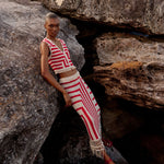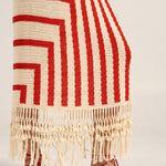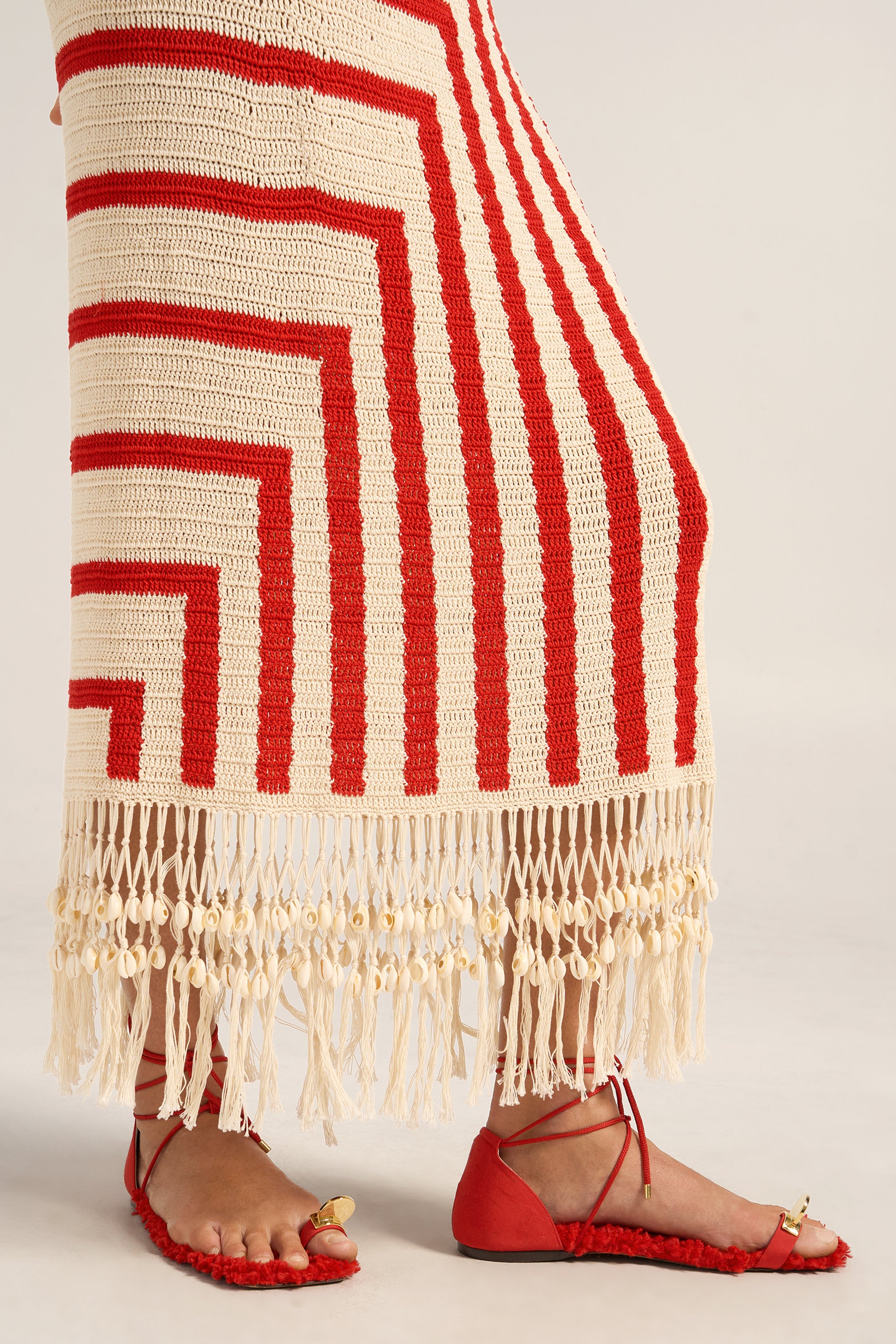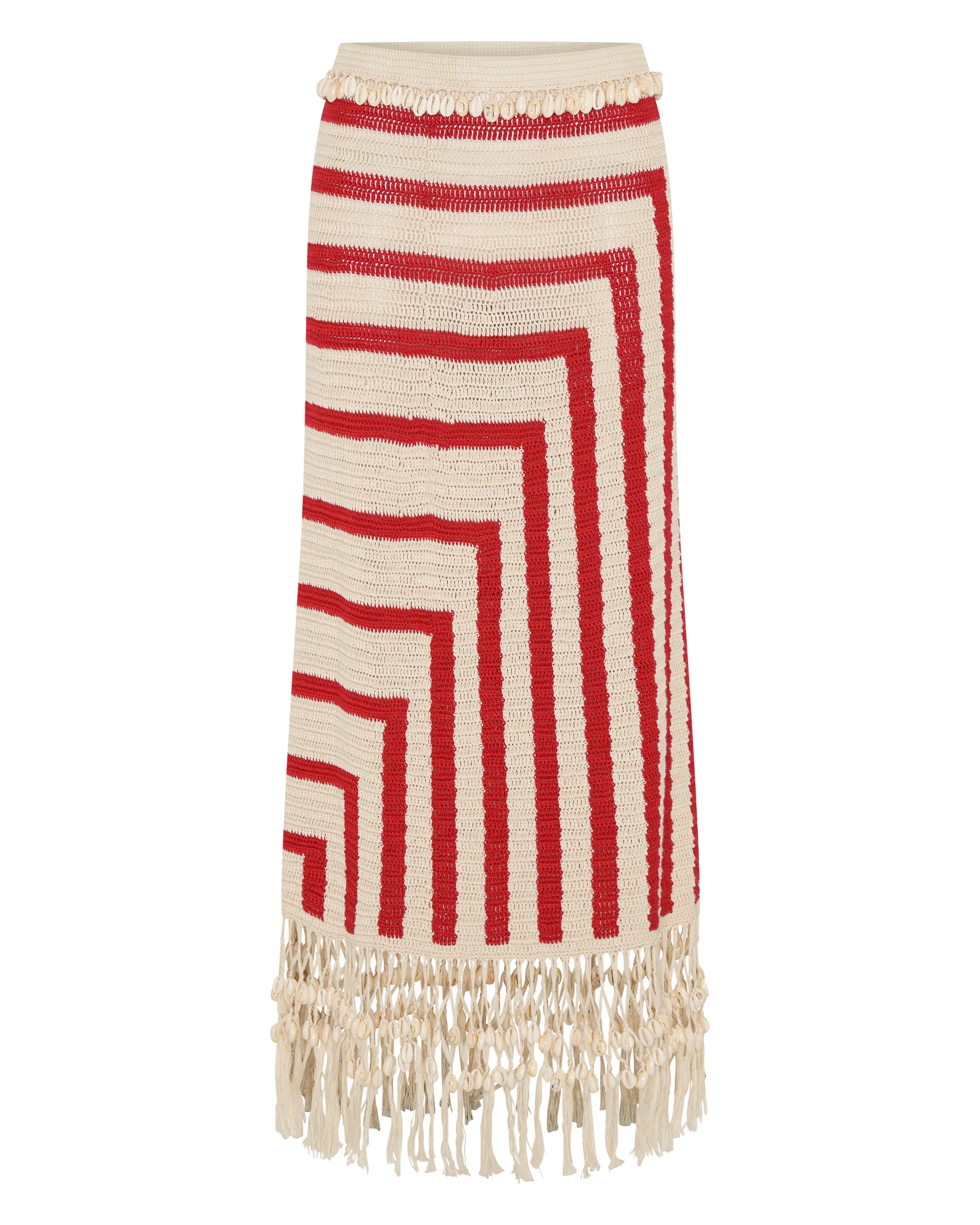 The Camilla Skirt is crafted from hand-crocheted cotton in a bold red and cream geometric pattern. Entirely handmade, this pieces showcases beautifully Peru's artisanal craftsmanship. Falling to a flattering midi length, it features shells along the waistband and a tassel-trimmed hem with shells interwoven for subtle texture and movement. Versatile, the Camilla Skirt pairs beautifully with the Clythie Vest or other relaxed tops, creating a coordinated, sun-ready ensemble with handcrafted detail.