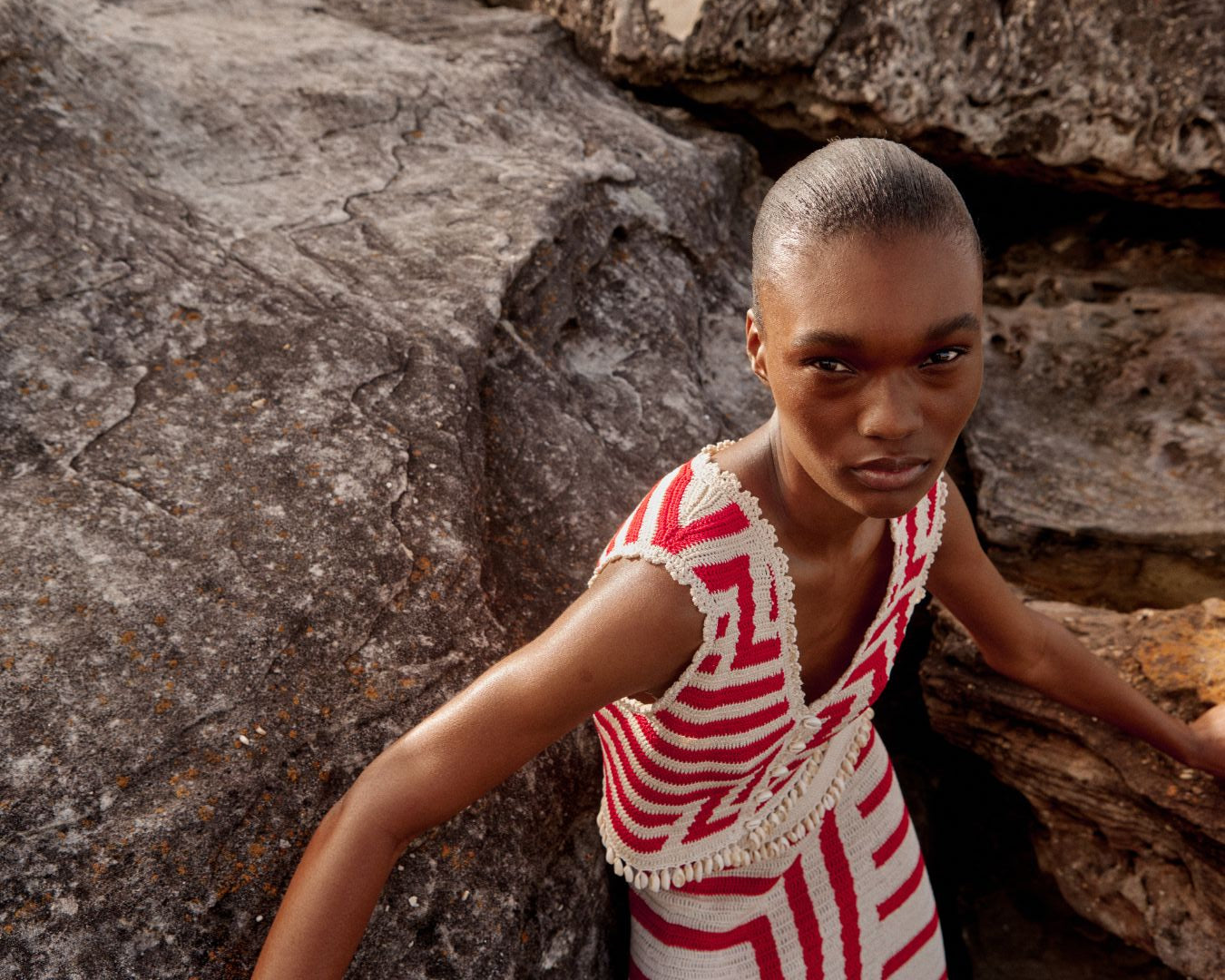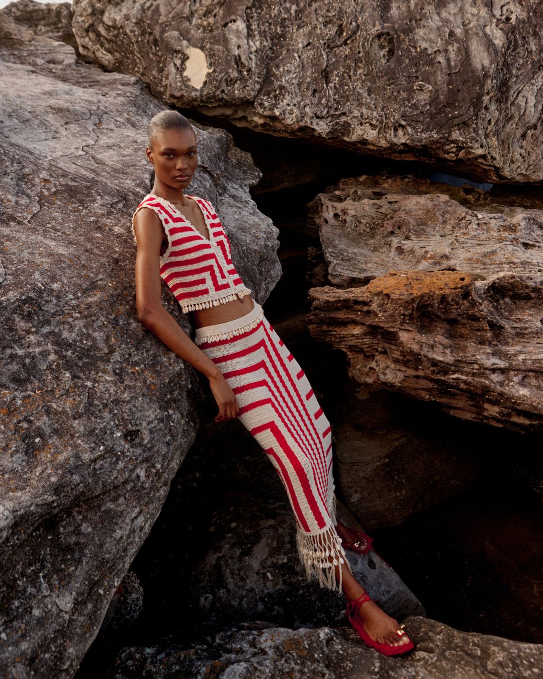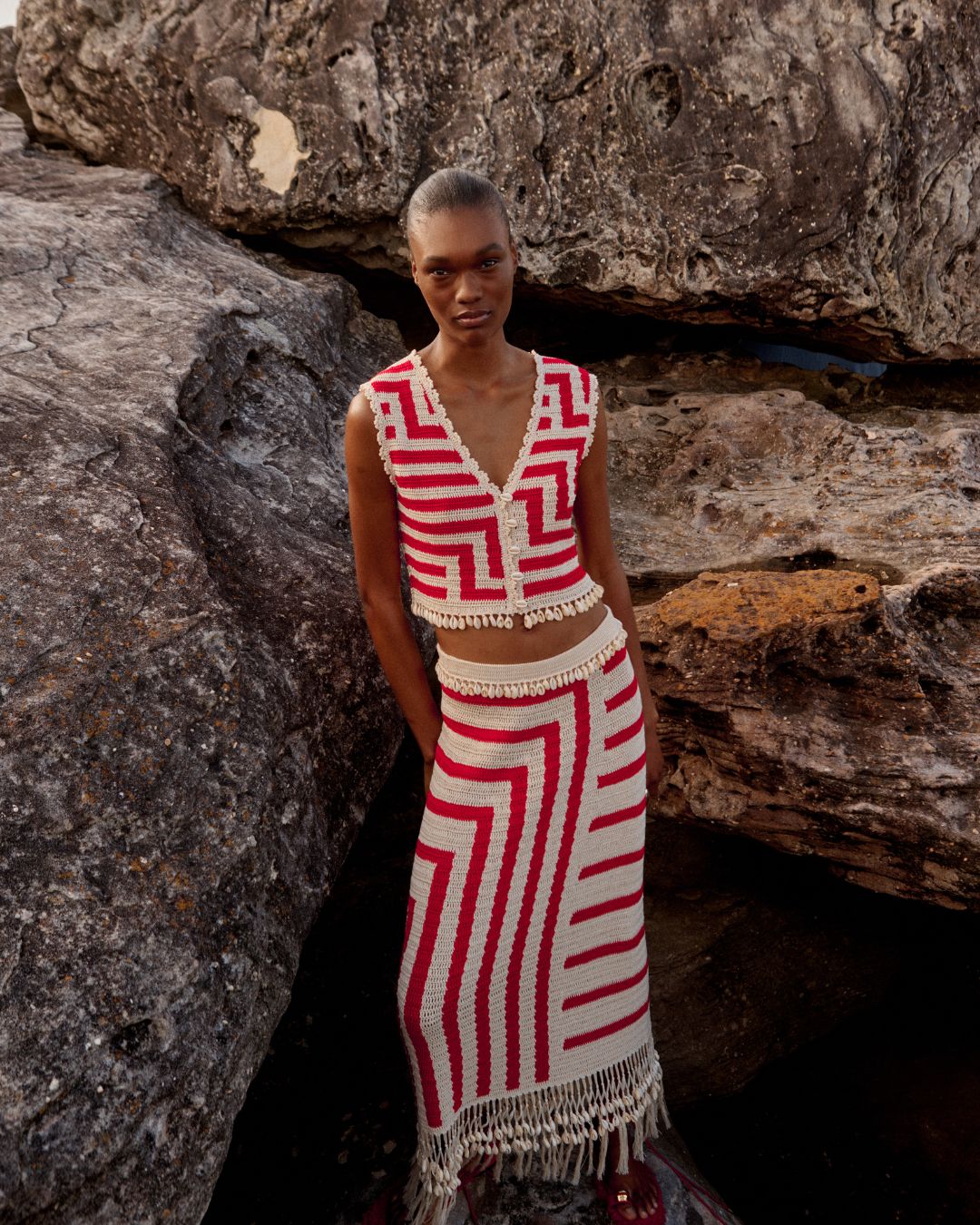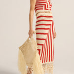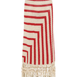The Camilla Skirt is crafted from hand-crocheted cotton in a bold red and cream geometric pattern. Entirely handmade, this pieces showcases beautifully Peru's artisanal craftsmanship. Falling to a flattering midi length, it features shells along the waistband and a tassel-trimmed hem with shells interwoven for subtle texture and movement. Versatile, the Camilla Skirt pairs beautifully with the Clythie Vest or other relaxed tops, creating a coordinated, sun-ready ensemble with handcrafted detail.