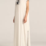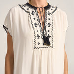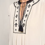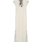 The Luna Caftan is an sumptuous maxi-length, crafted from luxurious white silk crepe, beautifully detailed with intricate black embroidery. Black crochet accents frame the neckline, capped sleeves, and hem, adding artisanal texture and depth. Finished with delicate tassels that bring a playful yet refined touch, this caftan combines timeless sophistication with handcrafted charm—perfect for graceful days and evenings alike.