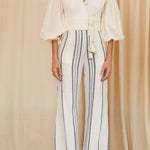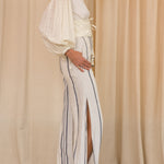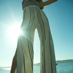 The Hades Pants is high waisted with a flat front and high slits on each leg. Tailored in Morocco using traditional handloom, the placement stripe is effortlessly chic. It is our favourite pants for all occasions.