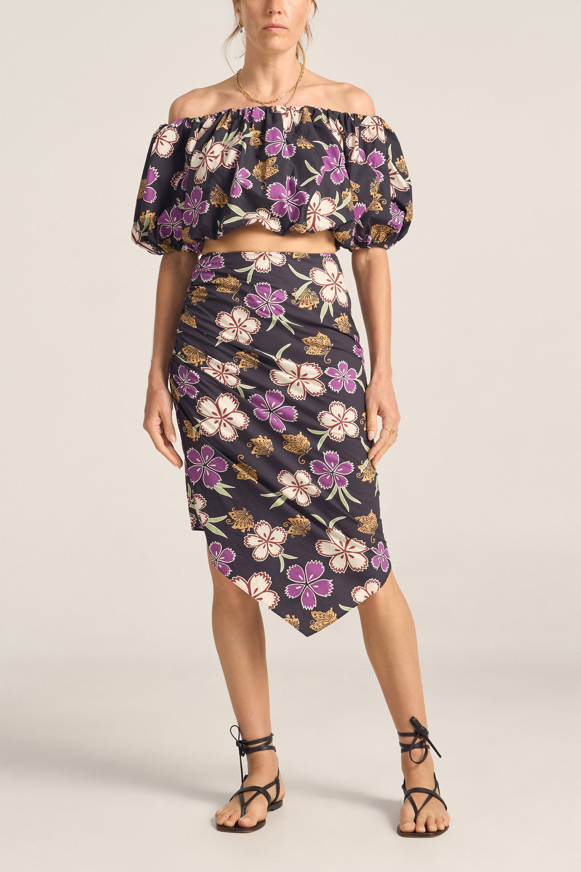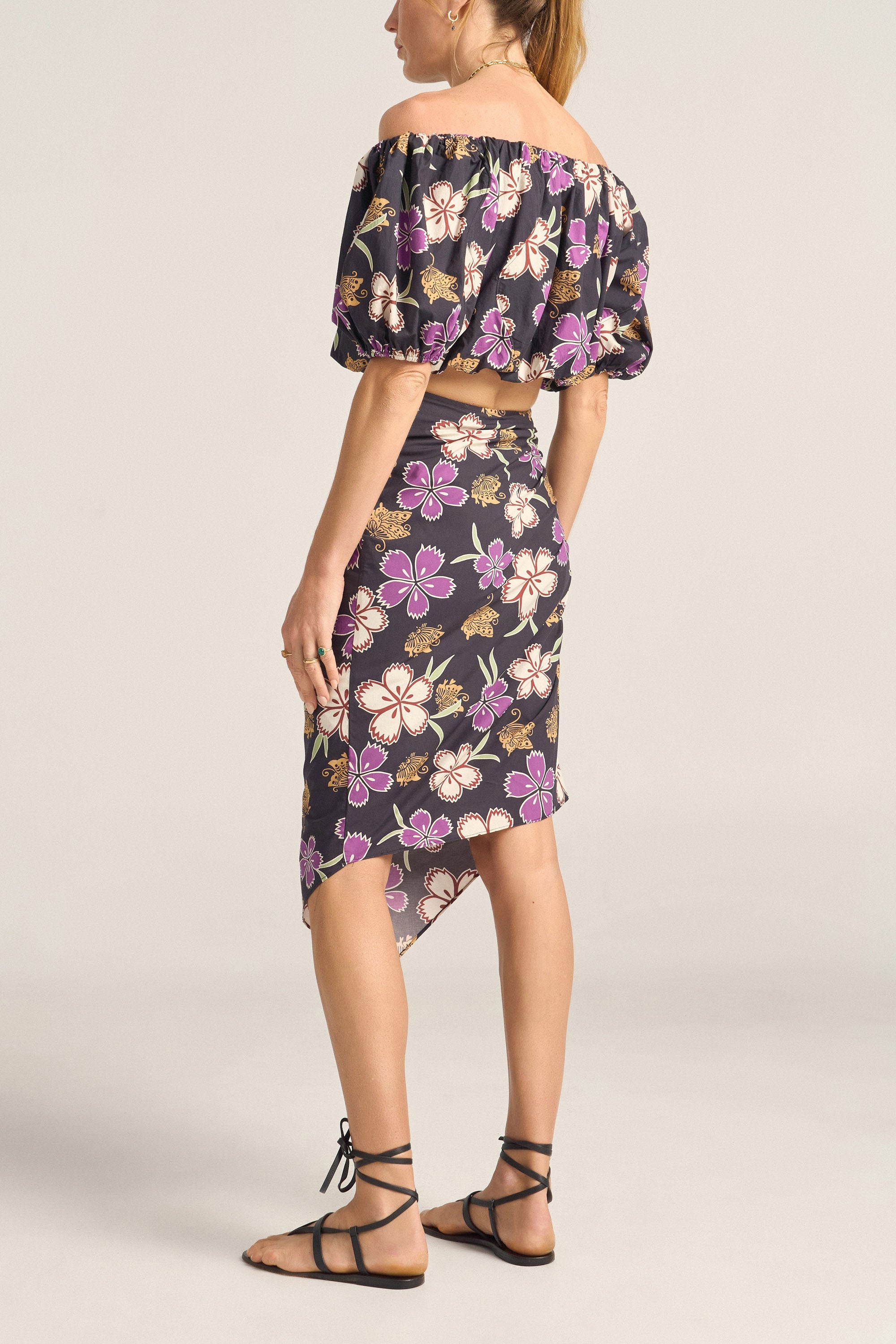 The Aegis Skirt is a statement of effortless elegance, crafted in a rich dark hibiscus printed cotton poplin featuring delicate purple and cream florals. Designed to hug the hips like a draped sarong, its asymmetrical shape adds a subtle twist to the wrapped silhouette. A discreet invisible zip at the back ensures ease of wear, while the light, breathable fabric moves gracefully, making the Aegis Skirt a versatile piece for both relaxed days and special occasions.