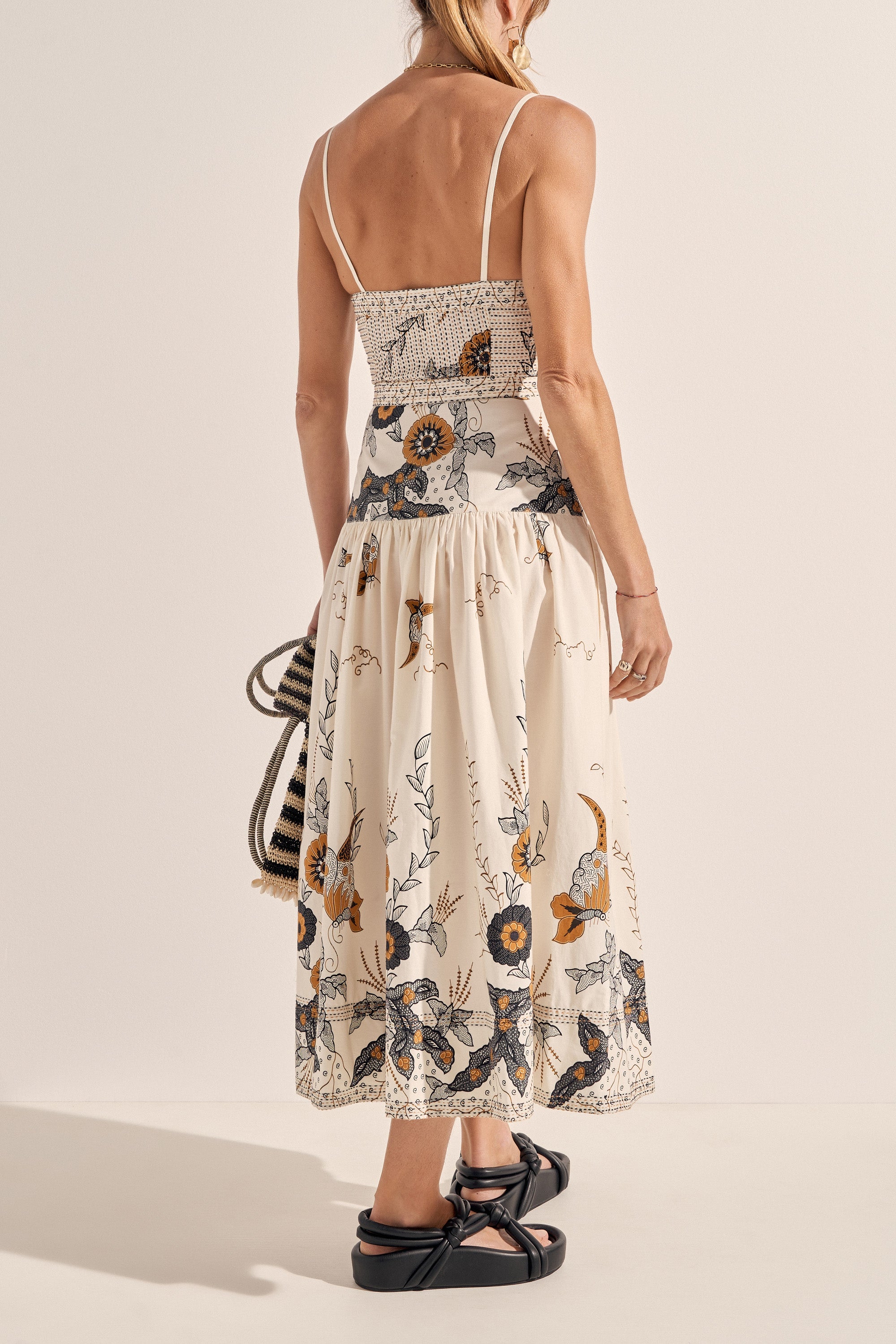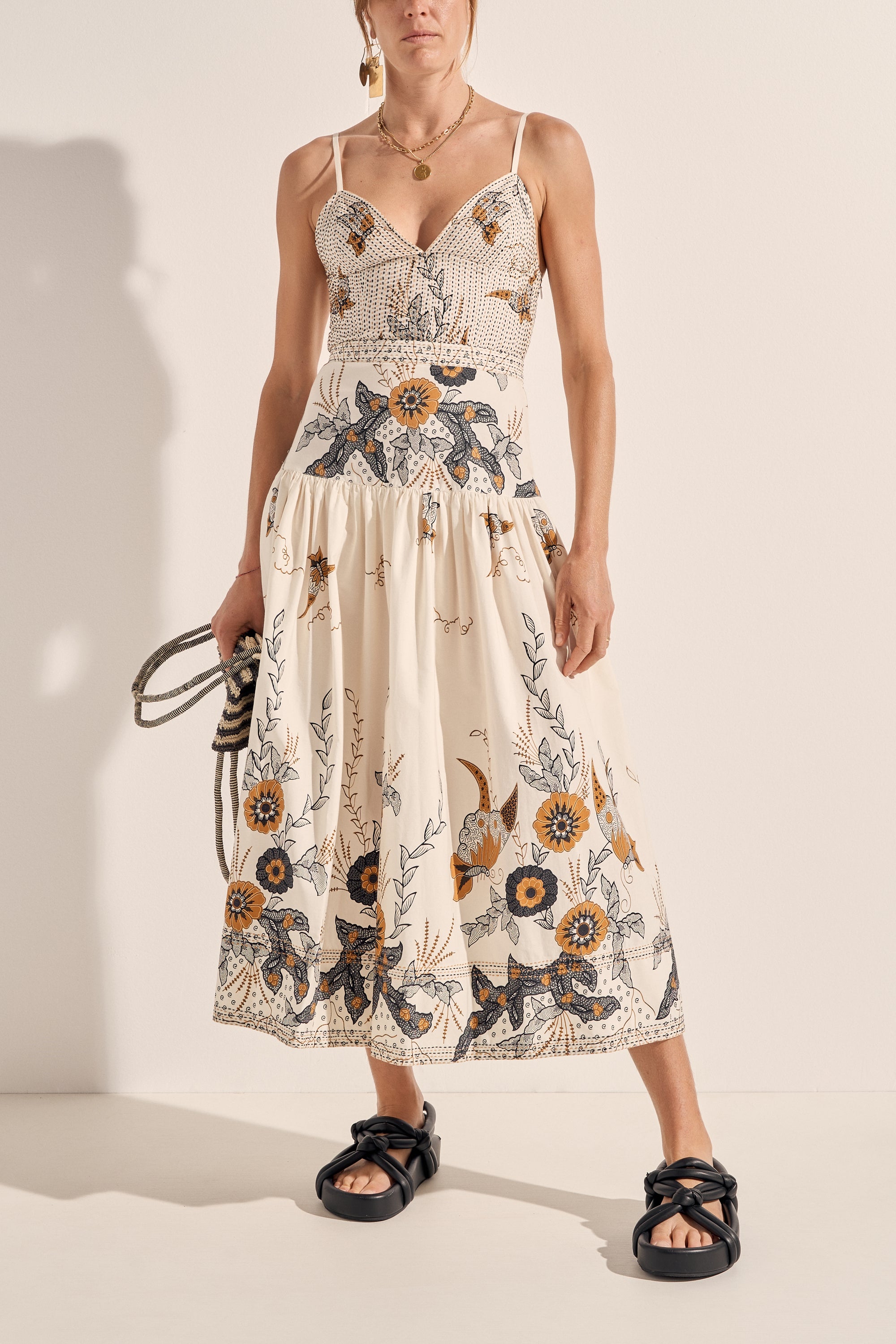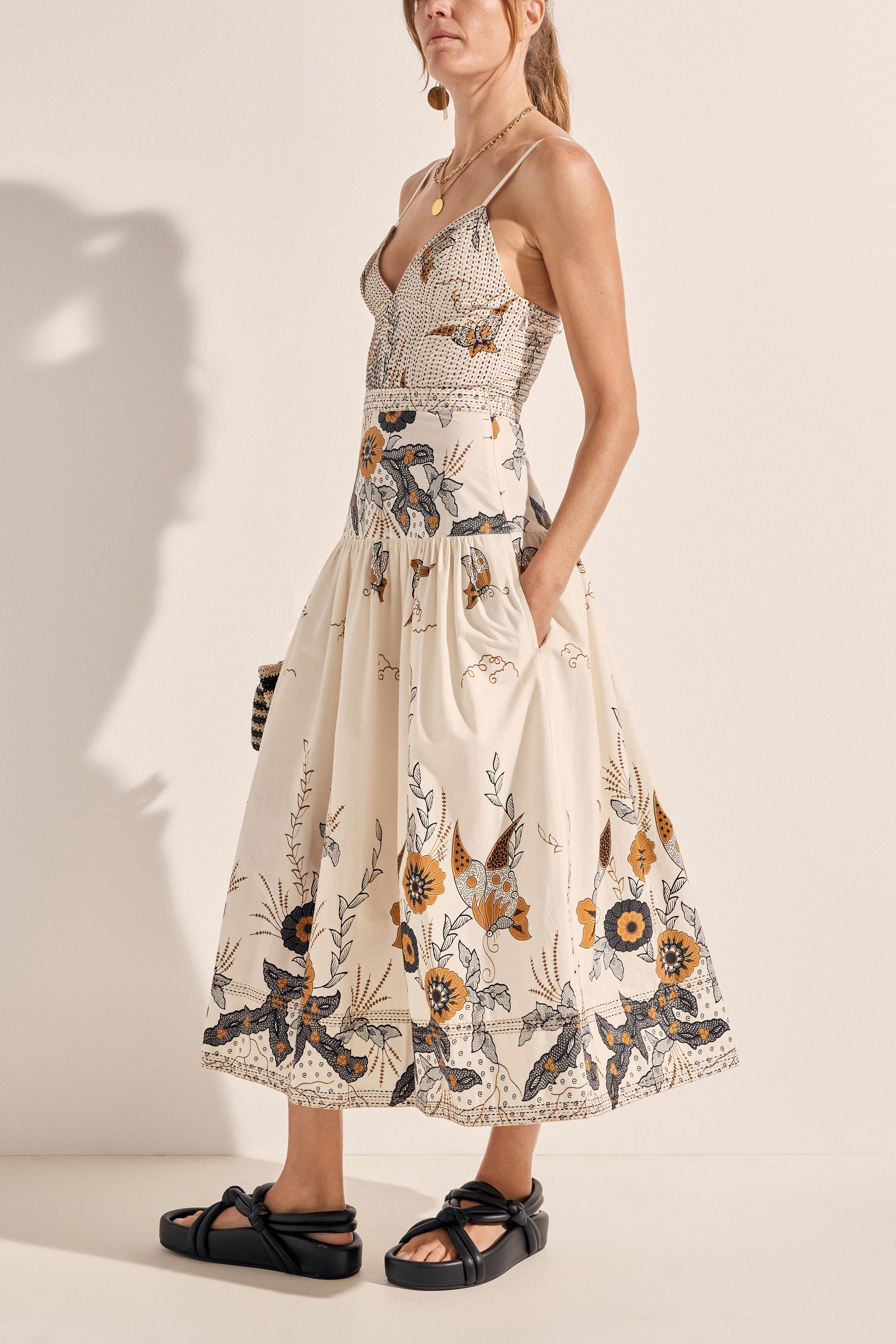 The Aphrodite Dress is new silhouette made from crisp cotton poplin adorned with our beautiful vintage inspired Cream Batik Print. Featuring thin straps, a romantic v-neckline, gorgeous hand-stitched bodice, a fitted hip yoke with a richly gathered skirt. This style has side pockets and fastens with side zipper. The perfect dress to shine on any occasion.