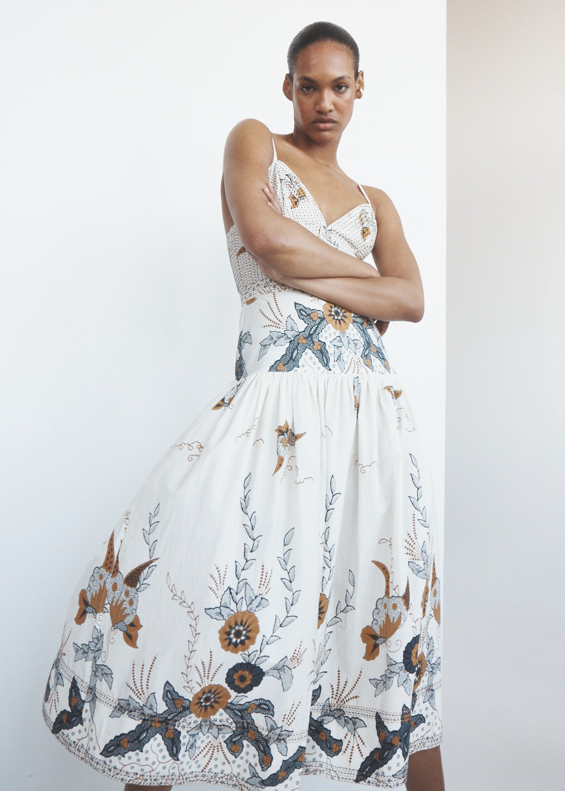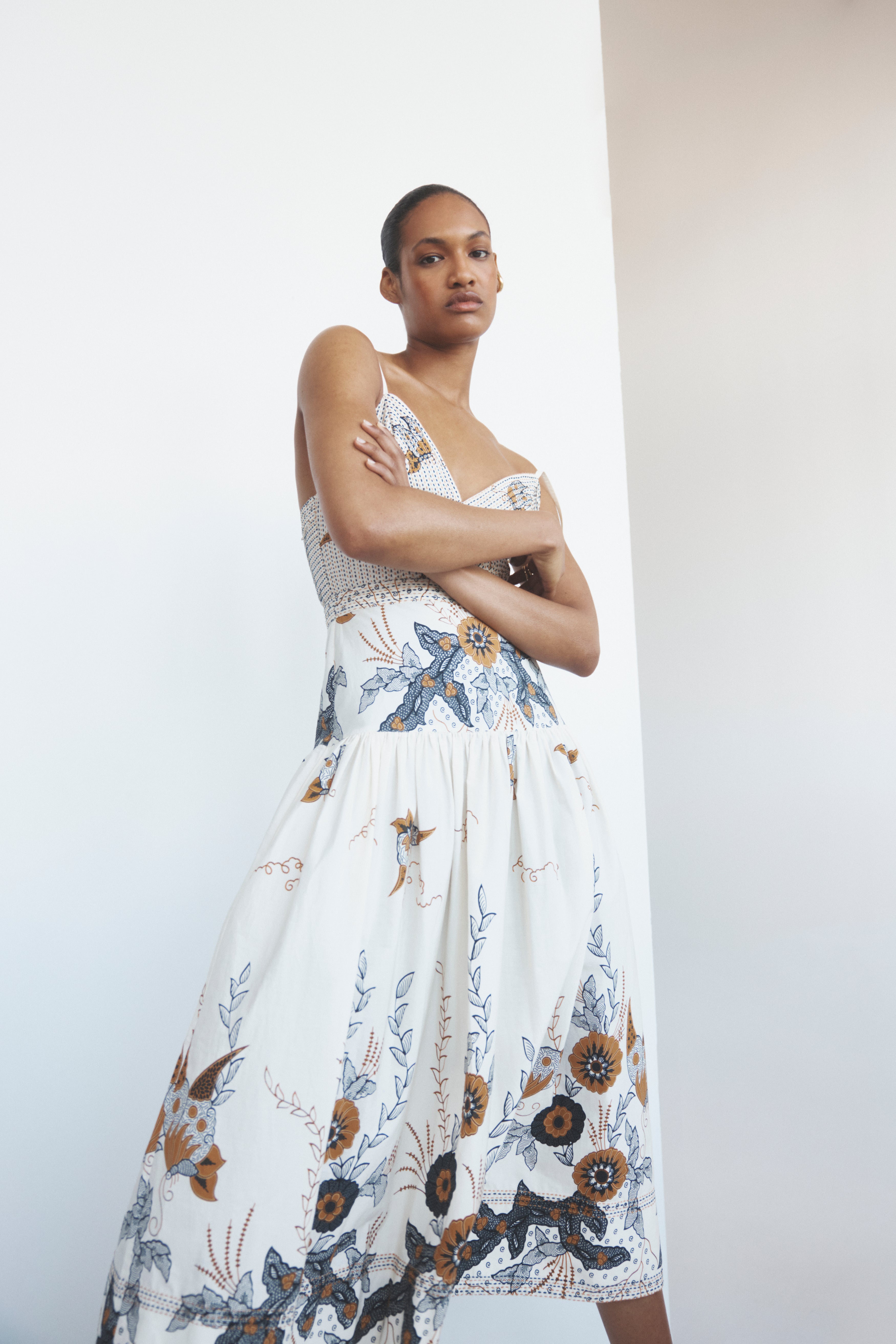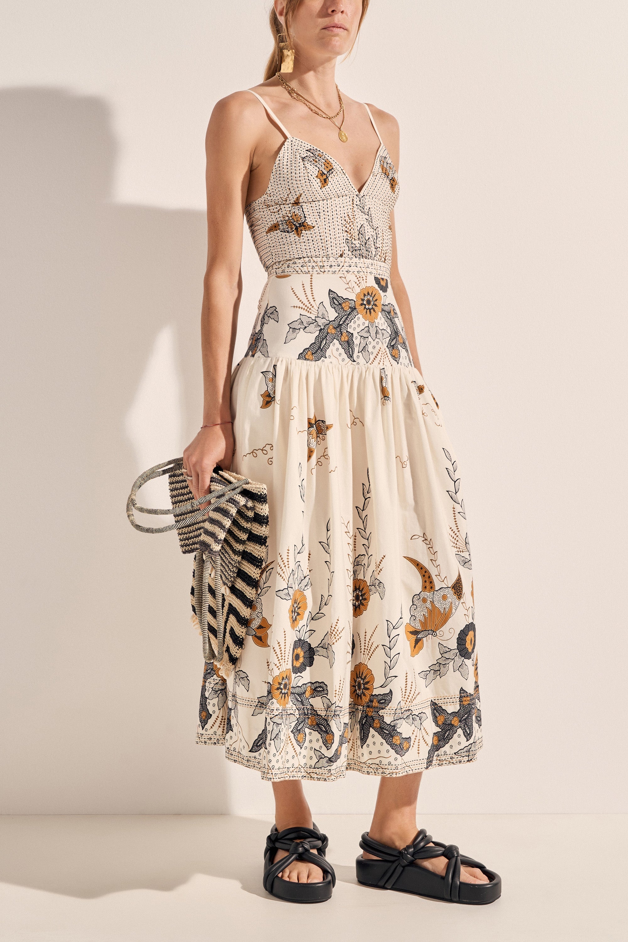 The Aphrodite Dress is new silhouette made from crisp cotton poplin adorned with our beautiful vintage inspired Cream Batik Print. Featuring thin straps, a romantic v-neckline, gorgeous hand-stitched bodice, a fitted hip yoke with a richly gathered skirt. This style has side pockets and fastens with side zipper. The perfect dress to shine on any occasion.