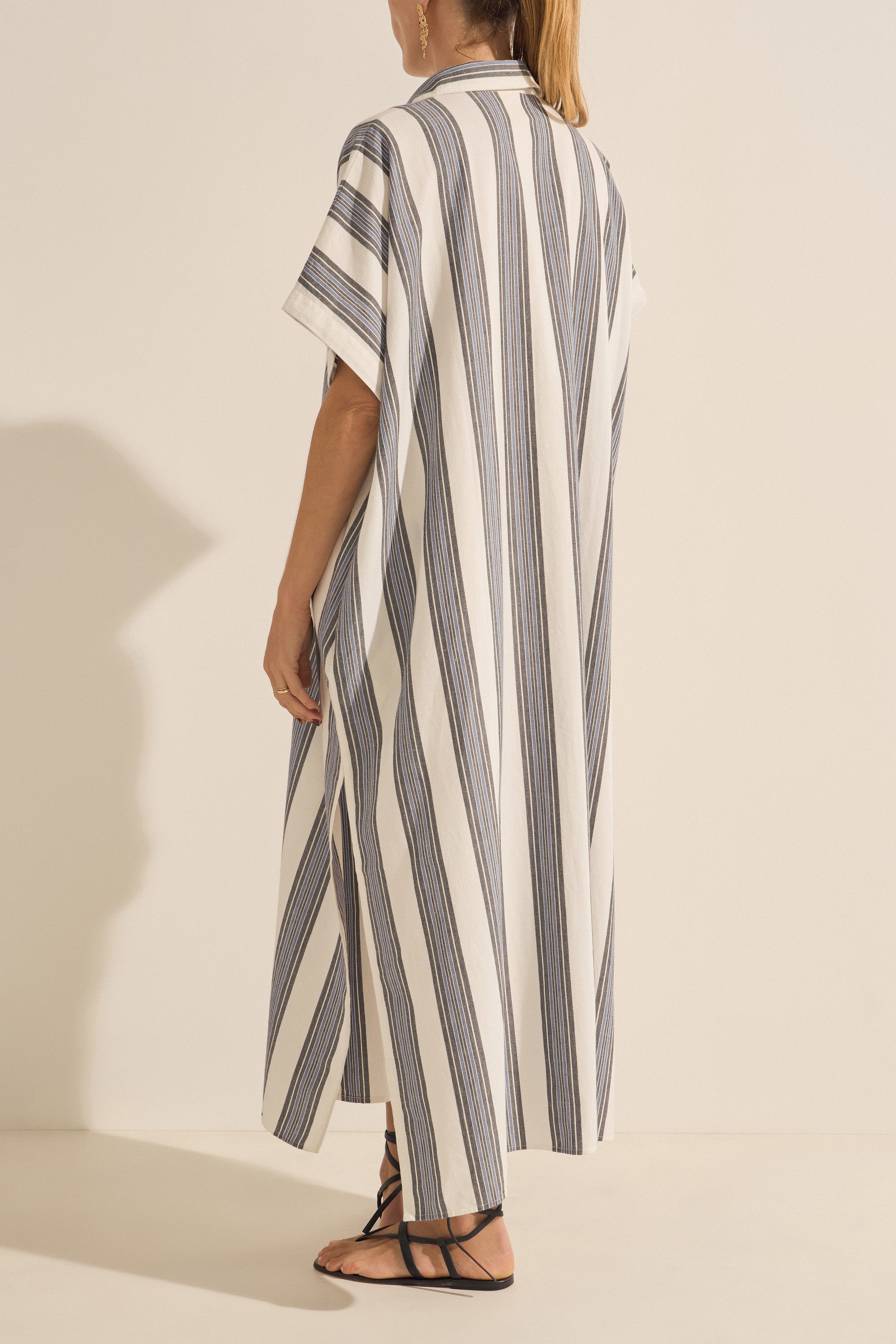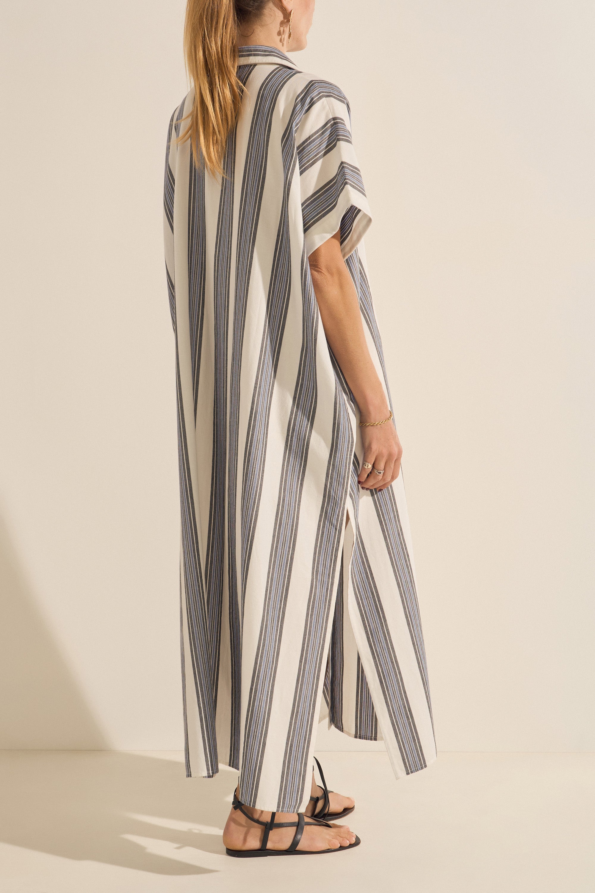 The Apollo Caftan is a wardrobe staple, featuring this season's classic Chios Stripe in white and blue. Maxi-length, short sleeves, a chic collar, high side slits and hidden pockets, it exudes effortless elegance. A perfect blend of femininity and simplicity, this timeless piece is as versatile as it is stunning—an essential for every season.