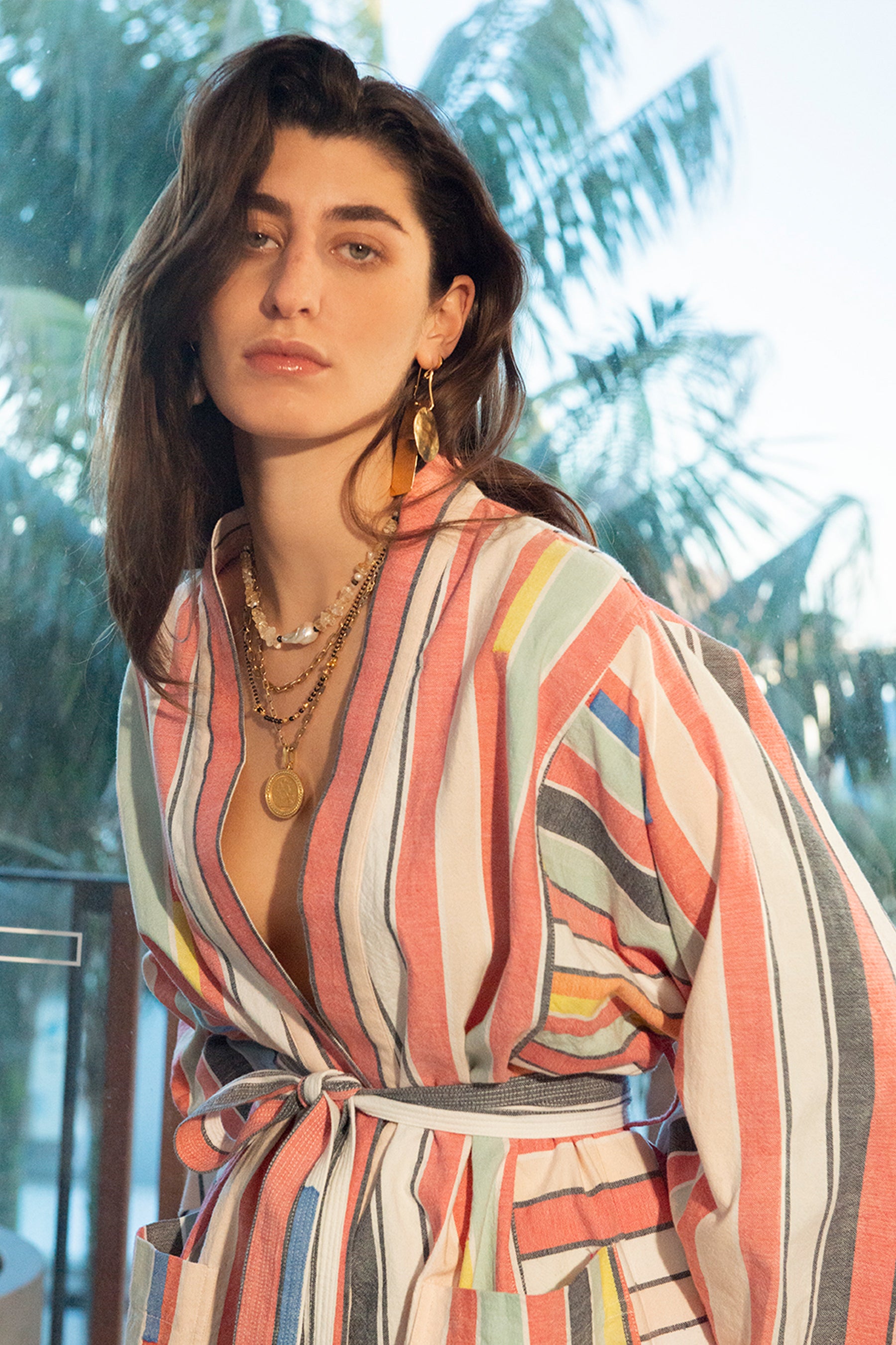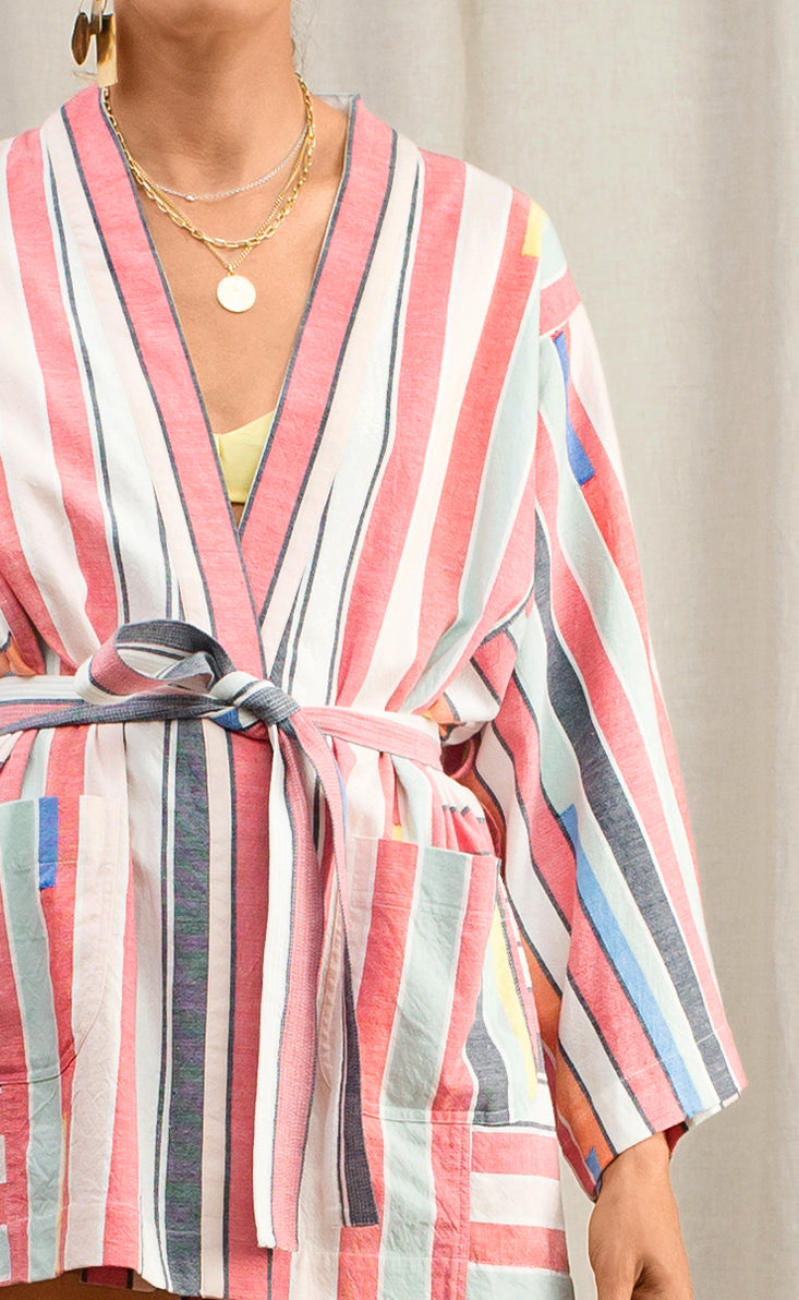 The Ariane Robe is a favourite new silhouette - an effortless robe, crafted in our dynamic multi-coloured broken stripe. The Bazaar Stripe takes three days to weave on a hand-loom by local weavers in India making this piece simultaneously unique and striking. It features an intricate broken stripe design; small blocks of colour of varying lengths within one stripe. To create this the weaver has to stop and change colours every time the colour changes within the one stripe which is extremely time consuming.