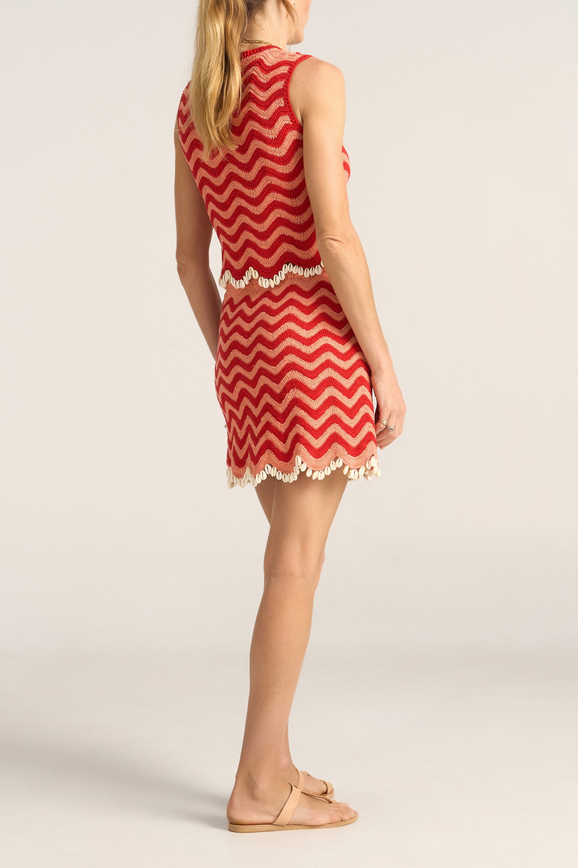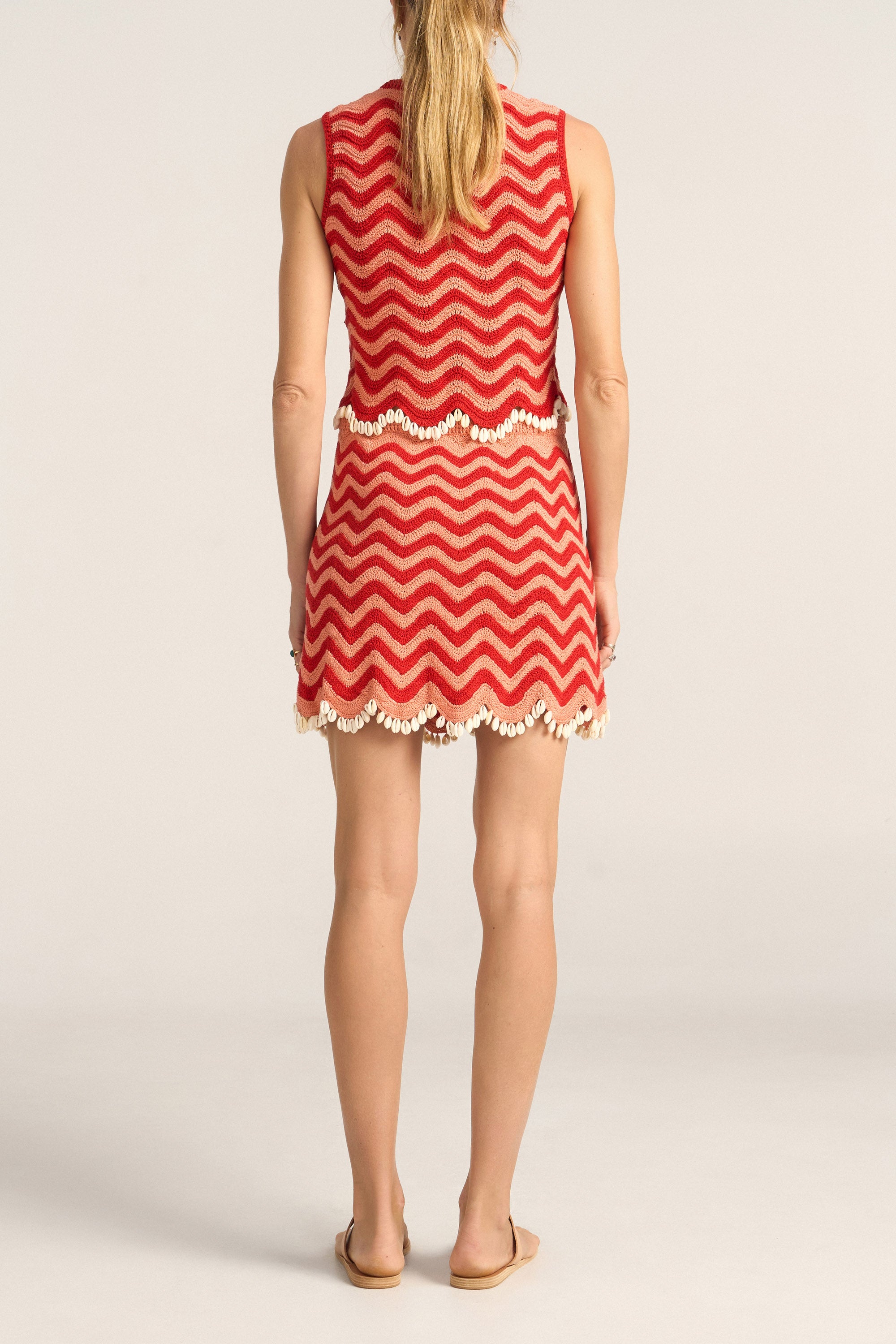 The Delphi Skirt is a hand-crocheted mini, crafted in vibrant red and pink wave-like stripes. Entirely hand made in Peru, in the finest Pima cotton, with a lightweight and textured finish, this piece offers a refined and playful take on artisanal craft. Cowrie shells adorn the hemline, adding a tactile tropical touch to this playful silhouette. Rich in texture and artisanal detail, this piece pairs perfectly with the Cynthia Top for a coordinated summer set. A celebration of colour and craft, the Delphi Skirt brings effortless charm to warm days and coastal escapes.
