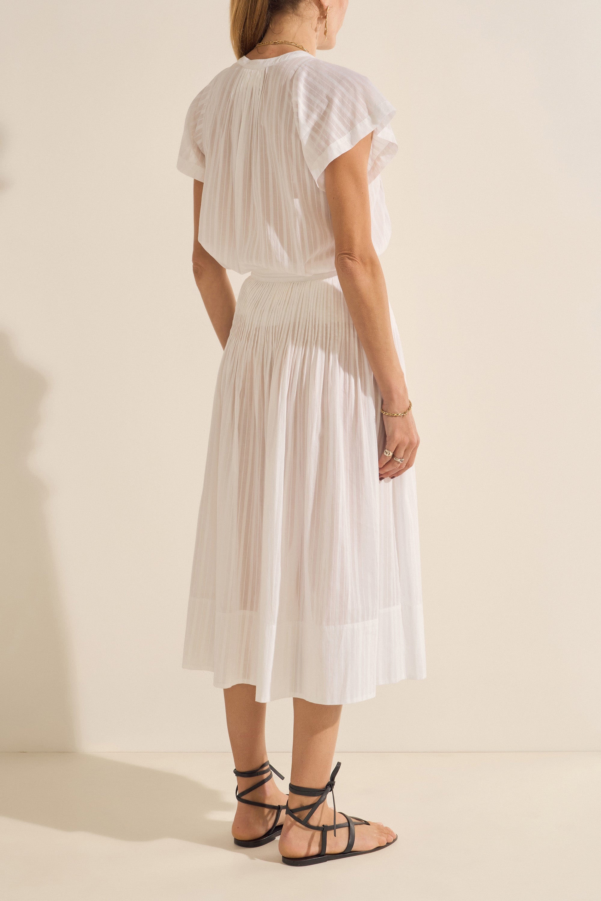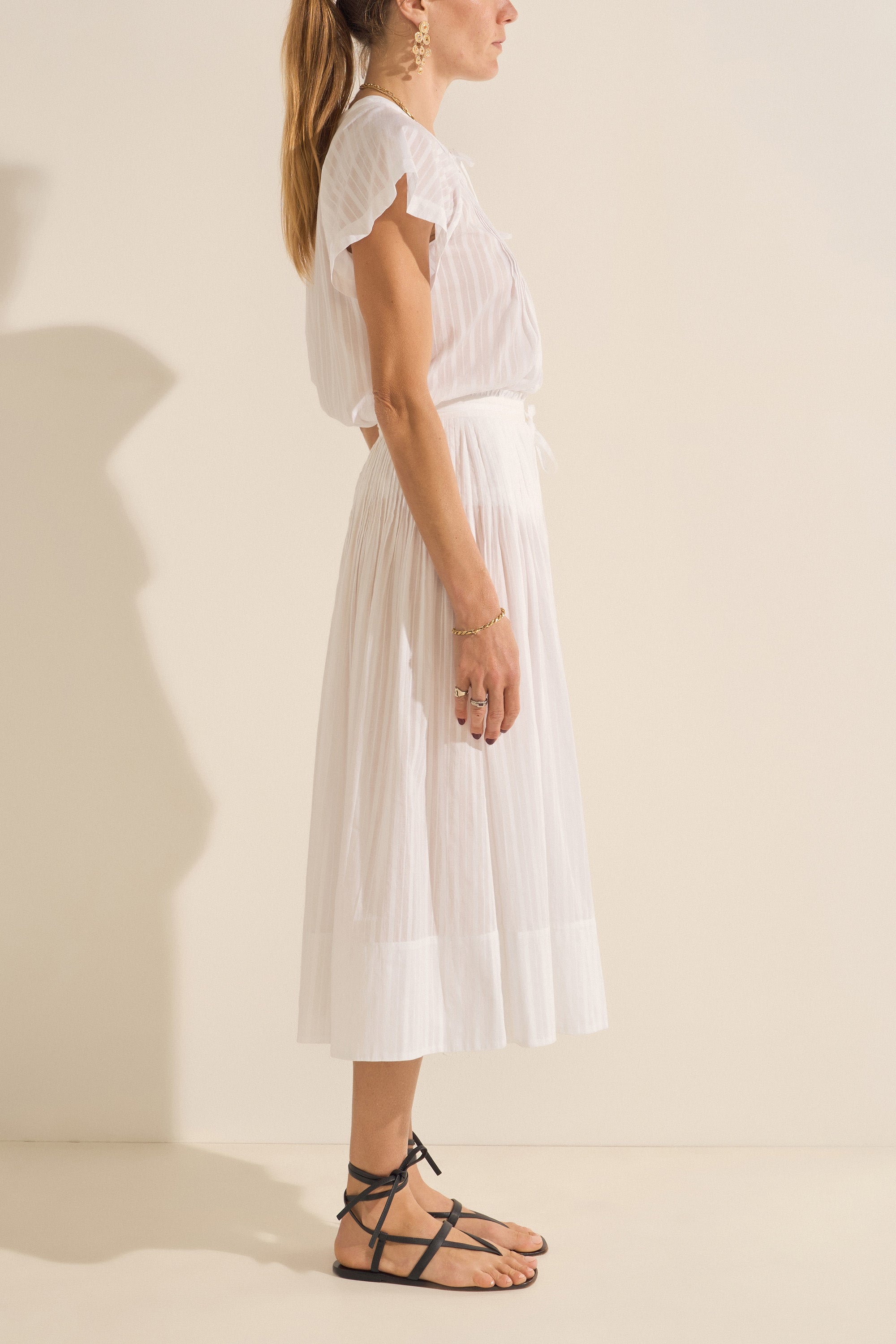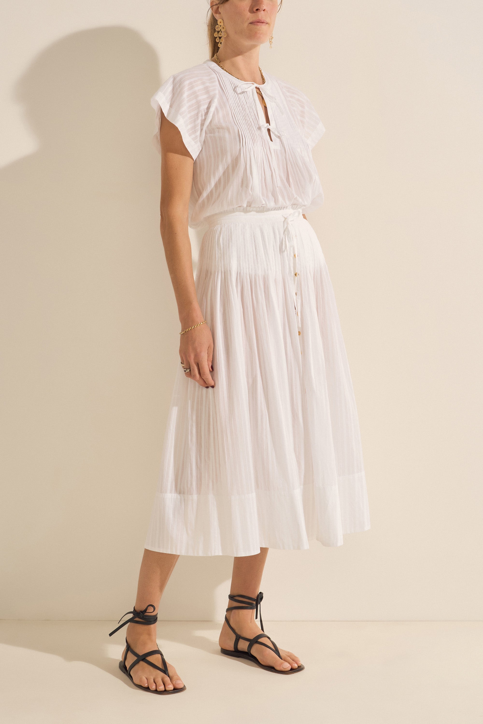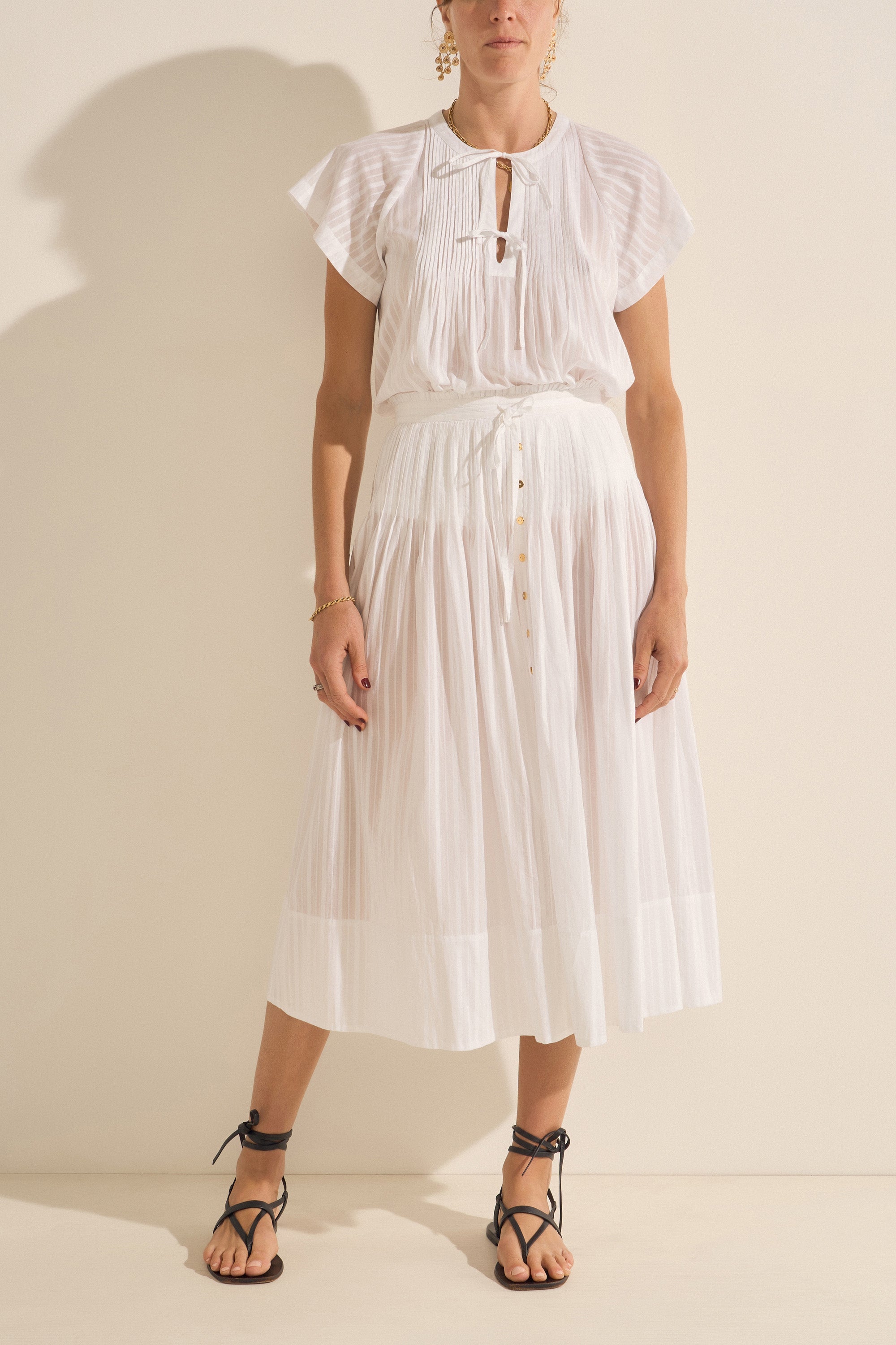 This graceful midi skirt is all about timeless femininity. Crafted from the softest organic cotton, it features delicate pintucks at the waist, elegant gold buttons, and a flattering, flowy silhouette. The side seam zipper ensures a smooth fit, and it's fully lined for comfort and ease. Pair it with the Zeus Top for a refined, matching set that transitions beautifully from day to night.