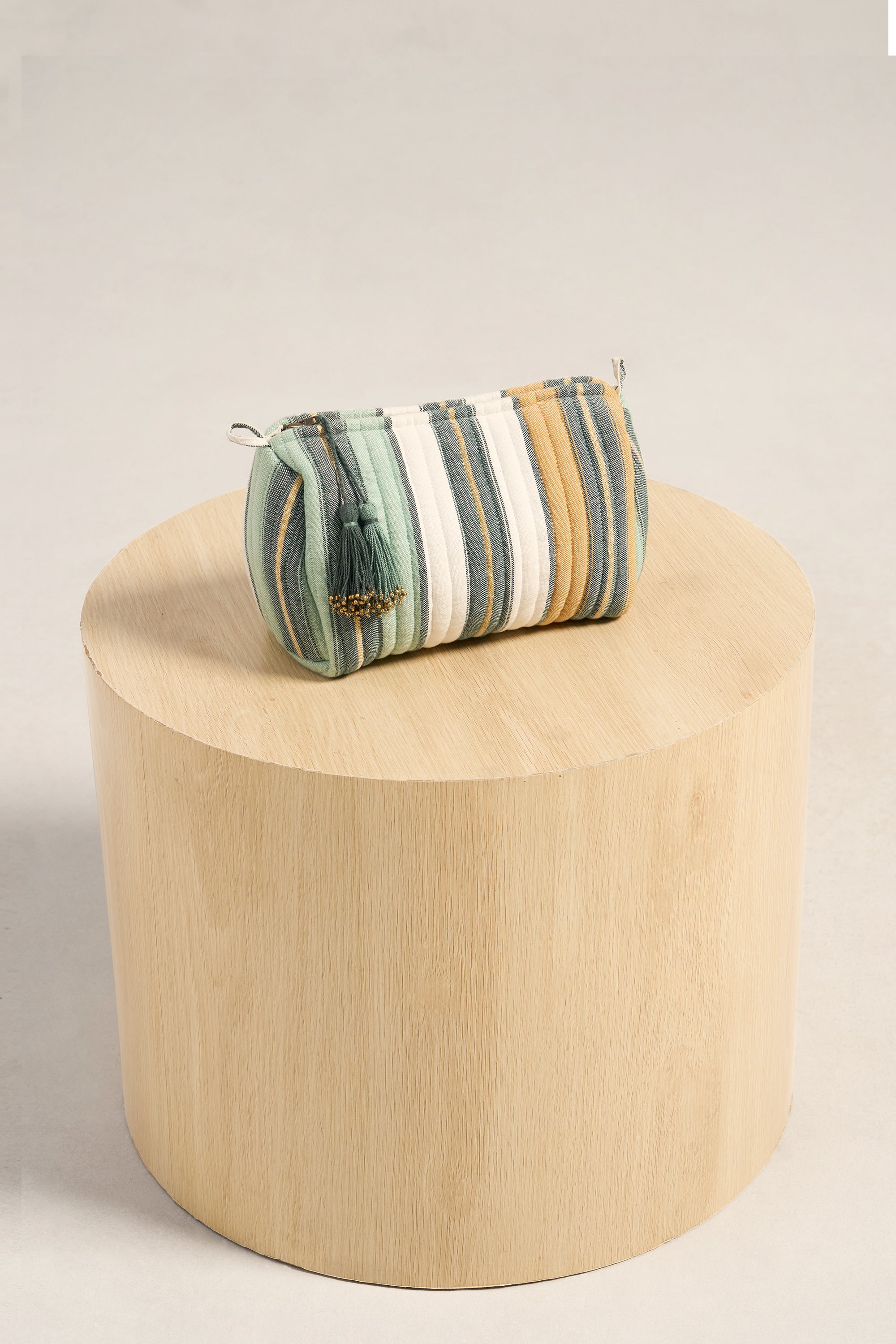 Our toiletries bag is crafted by local weavers in India in our signature handwoven fabric. It is lightly padded and quilted and features our hand-made tassels. In keeping with our commitment to minimise waste, it is made from our fabric offcuts.