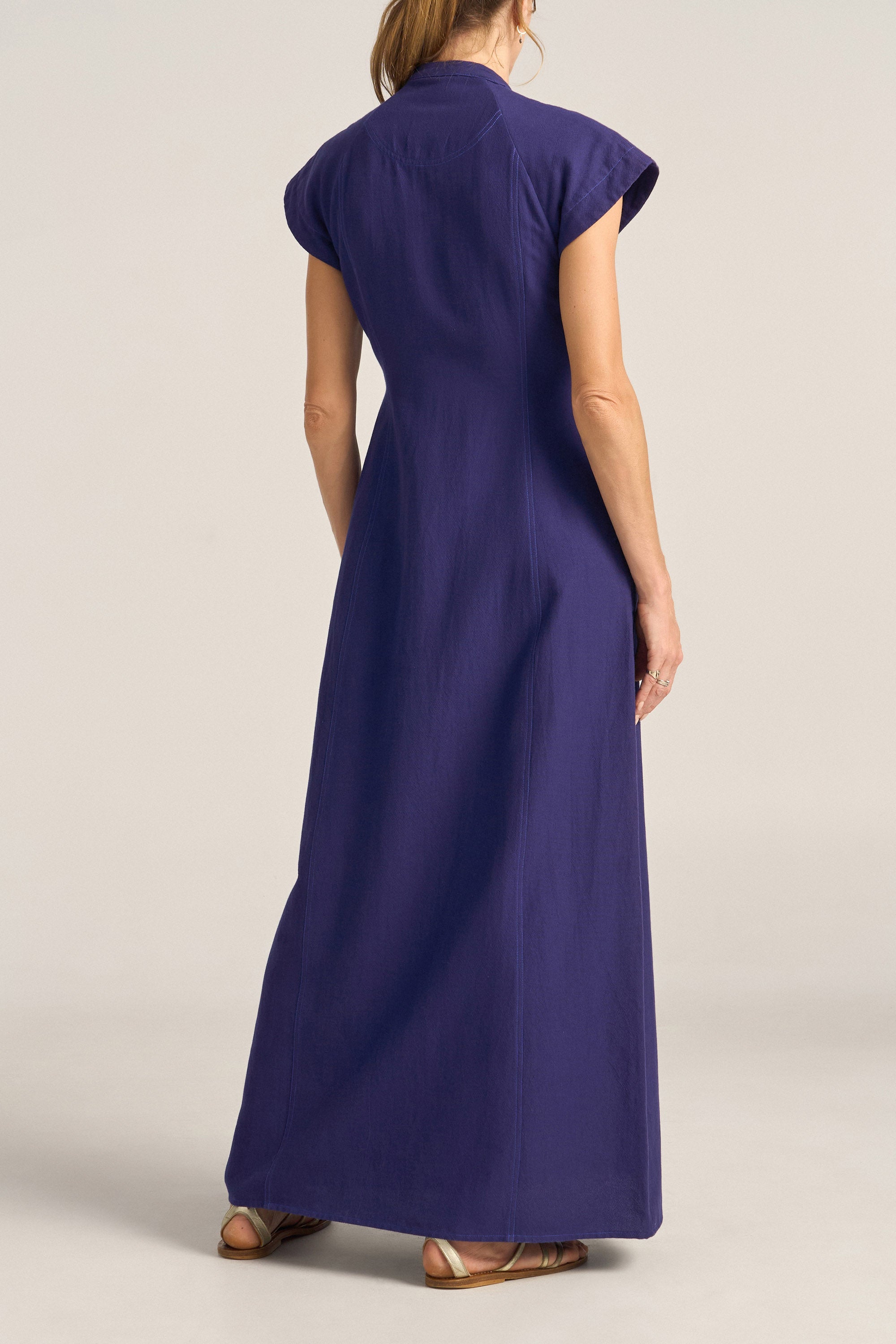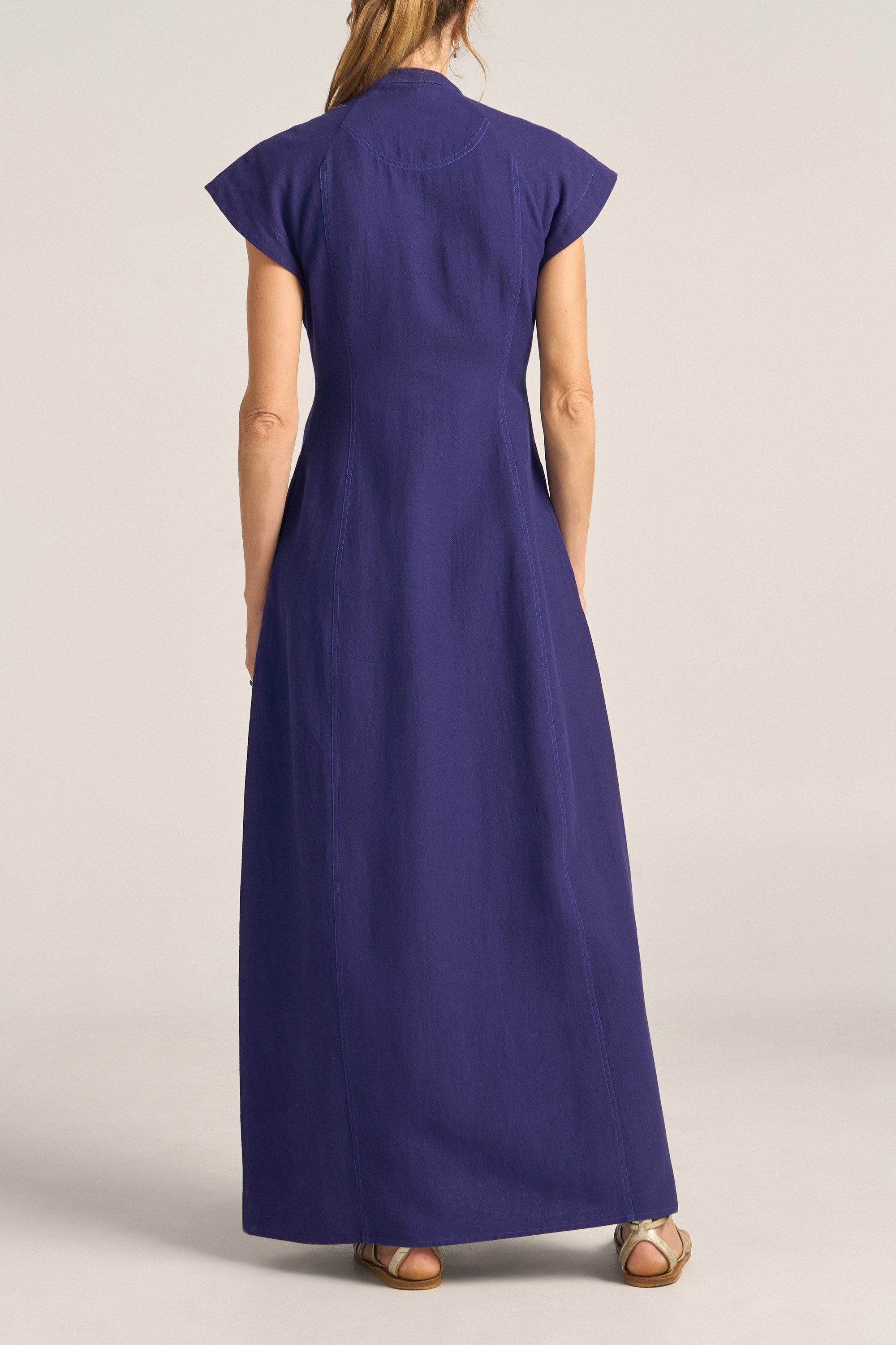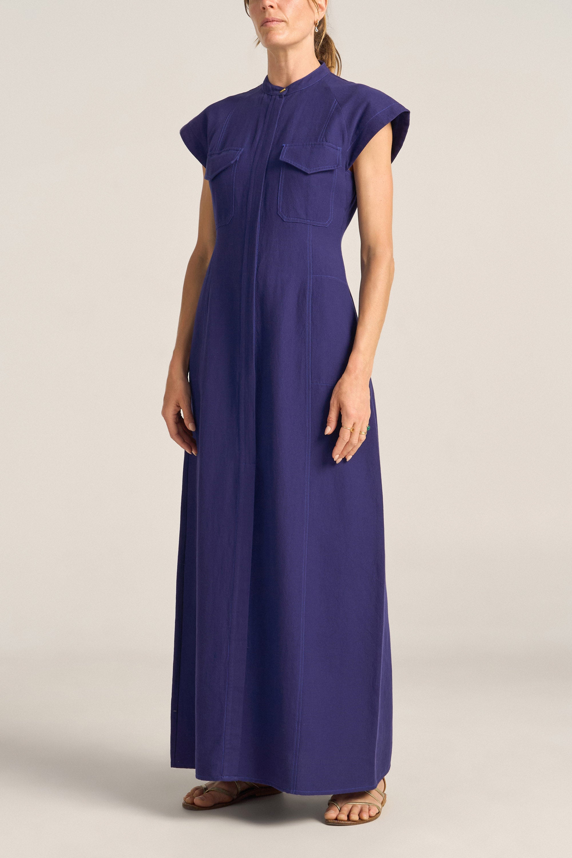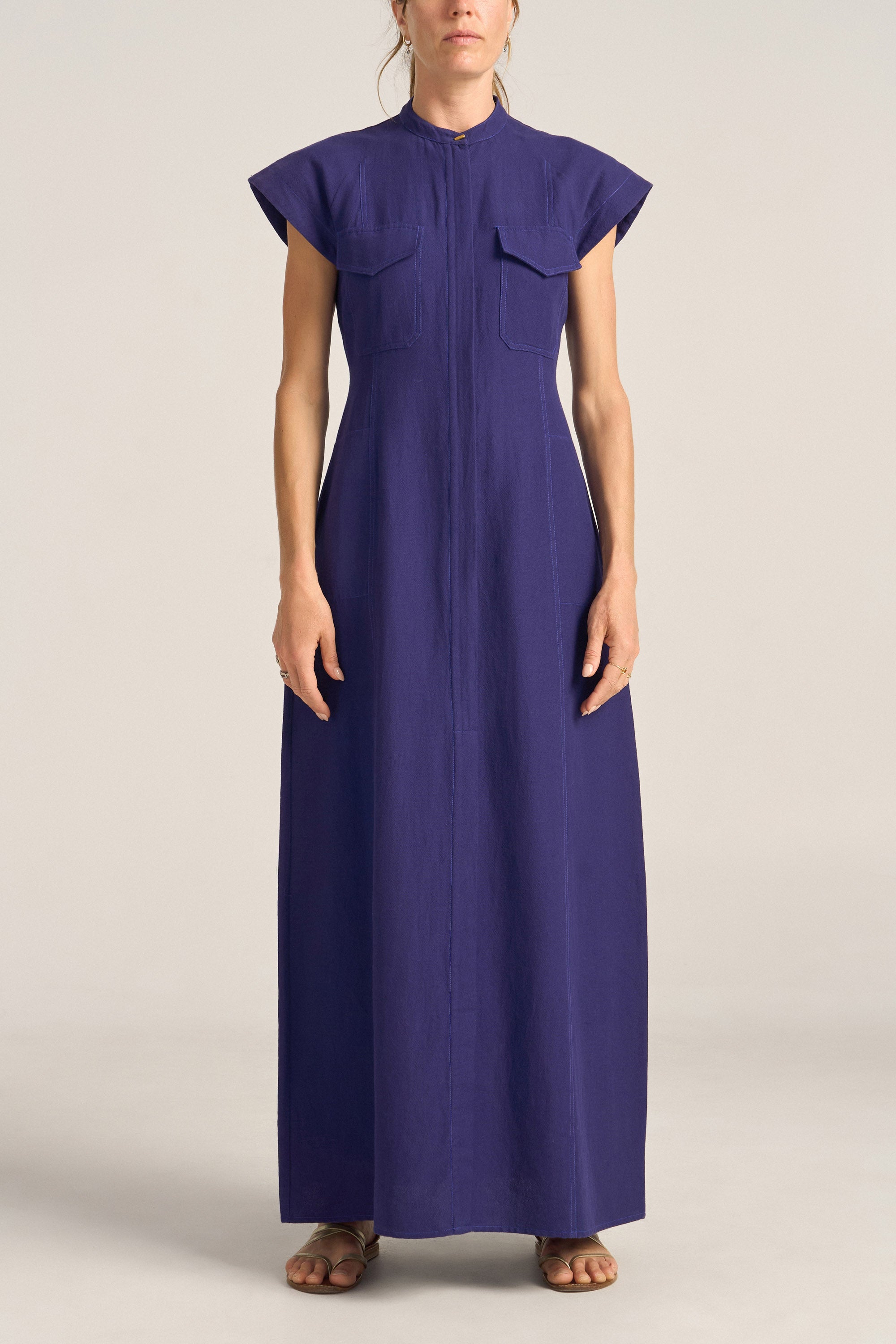 Tailored yet artful, the Heraklion Dress is a striking statement in deep indigo cotton handloom. Ankle-grazing and cut in a structured silhouette to elongate, it features a high neckline, centre-front zip and utility-style breast pockets that nod to classic workwear, reimagined through an elevated, feminine lens. The clean lines are balanced by the natural texture of the fabric, while subtle volume through the skirt allows for ease and movement.