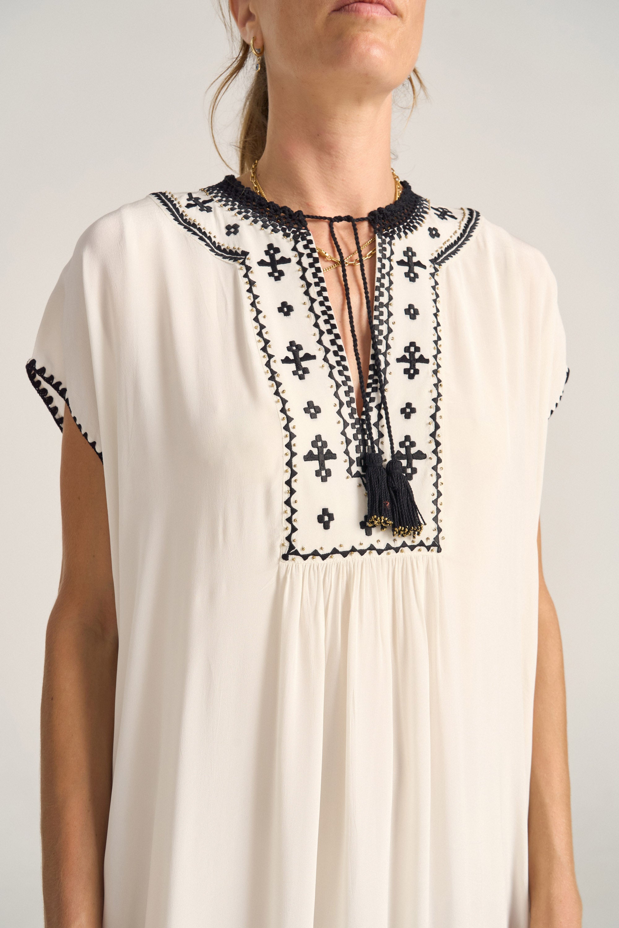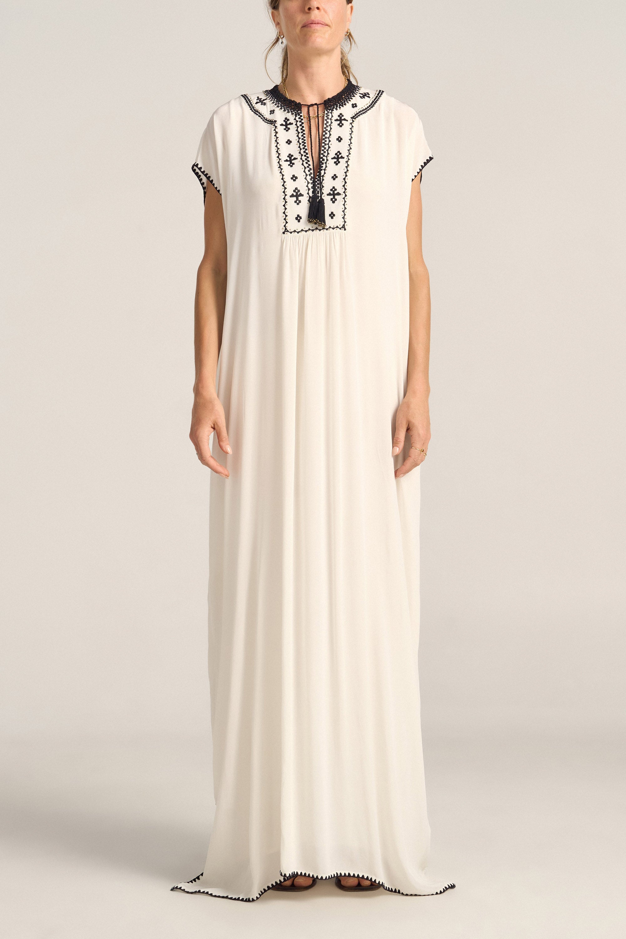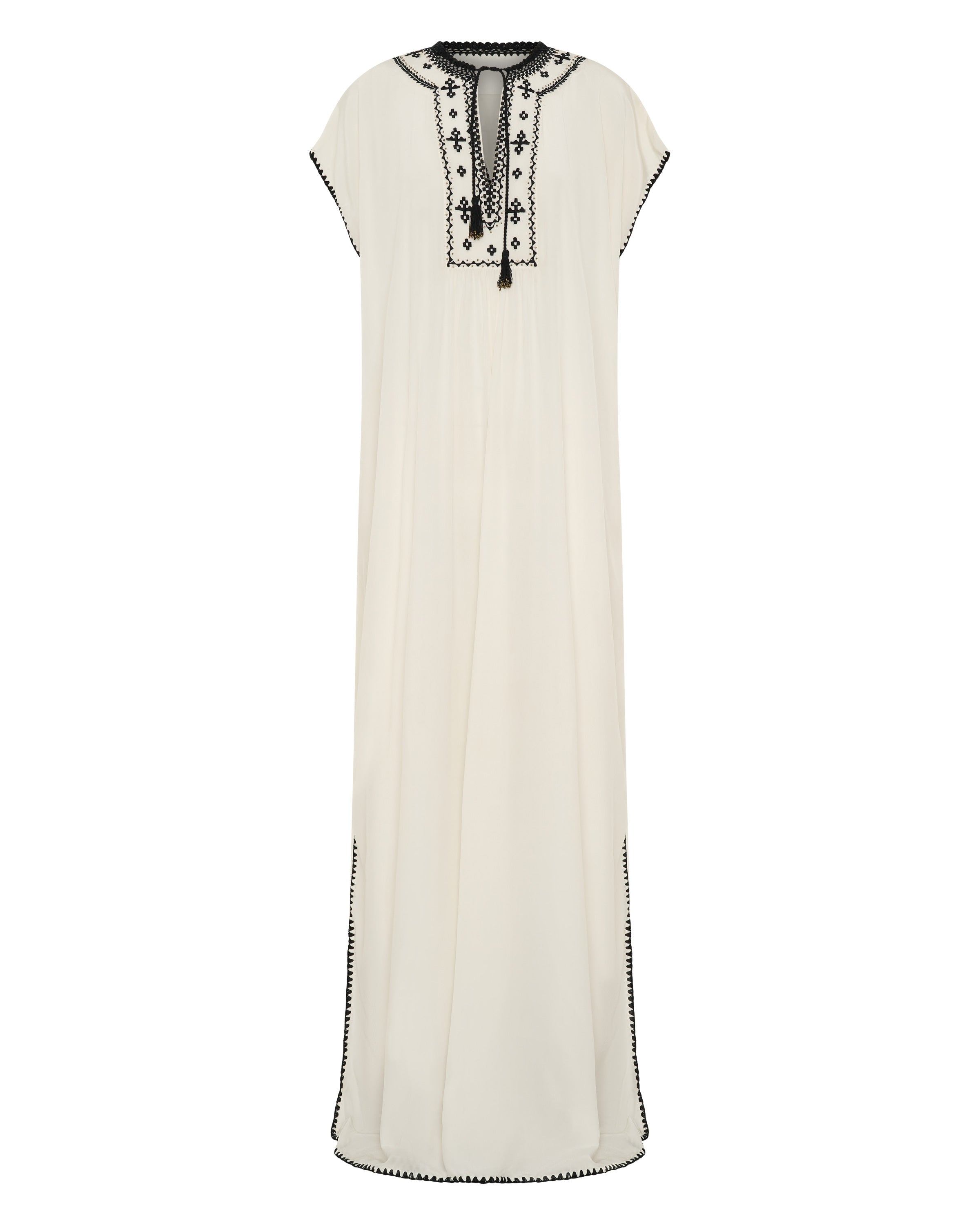 The Luna Caftan is an sumptuous maxi-length, crafted from luxurious white silk crepe, beautifully detailed with intricate black embroidery. Black crochet accents frame the neckline, capped sleeves, and hem, adding artisanal texture and depth. Finished with delicate tassels that bring a playful yet refined touch, this caftan combines timeless sophistication with handcrafted charm—perfect for graceful days and evenings alike.