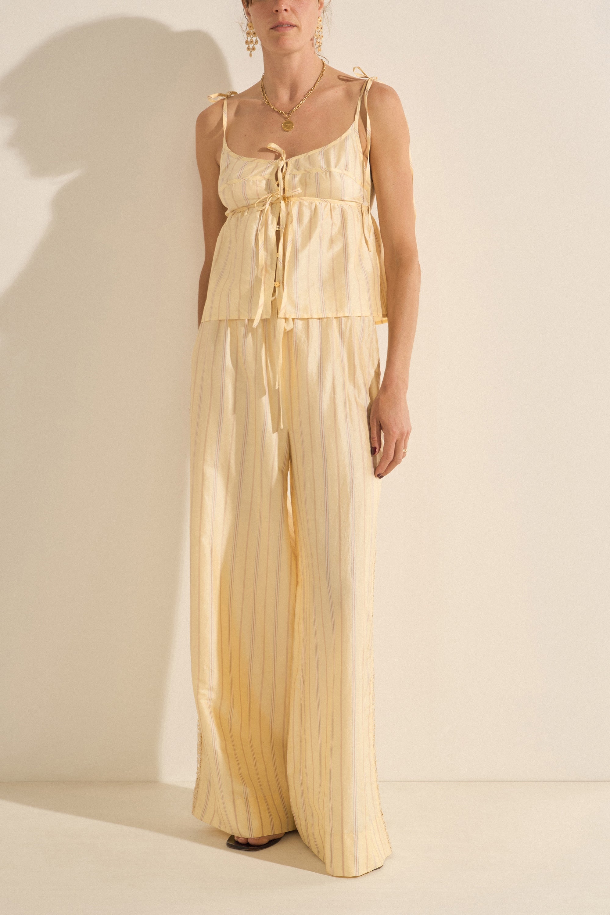 The Pellias Pants are simultaneously comfy and elegant. Tailored in a lightweight silk stripe with lace inserts running down the side for a delicate peek-a-boo effect. Featuring an elastic waistband, side pockets, and back patch pocket, they can be worn with the Arion Shirtdress for a matching set. They are our favourite versatile pants, for all occasions!