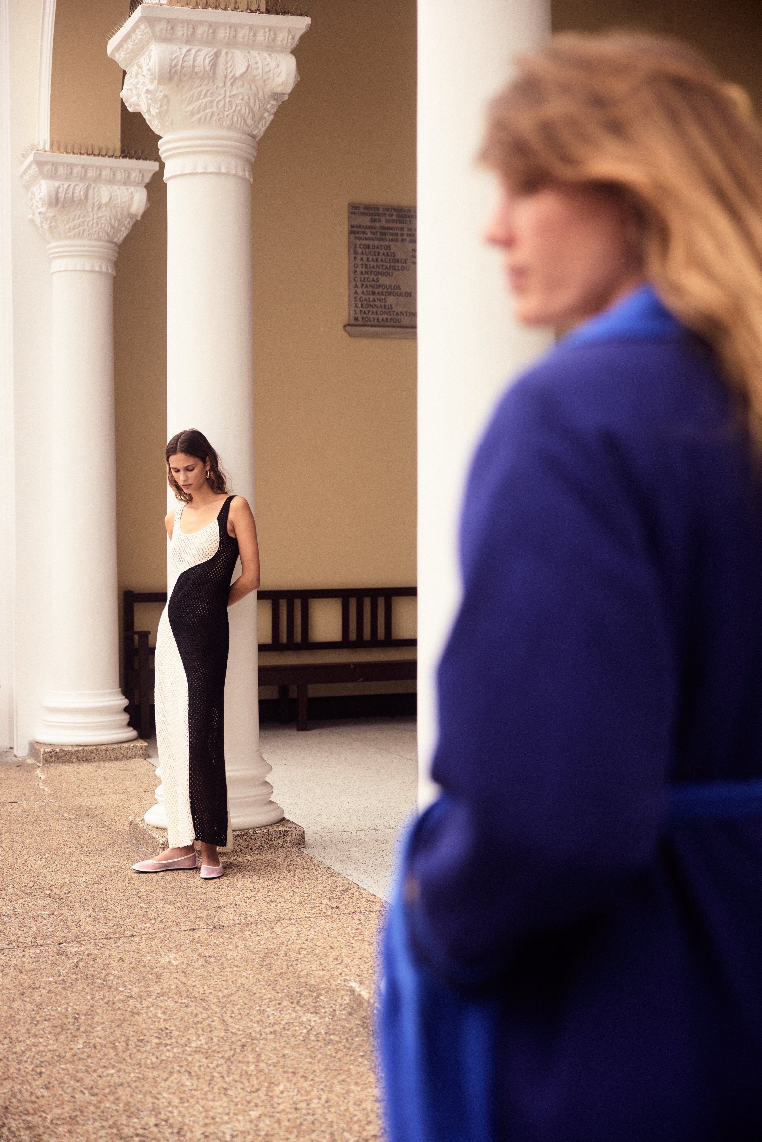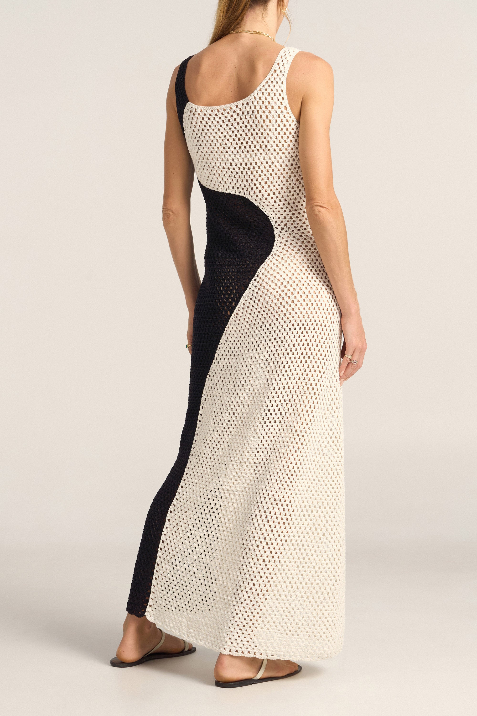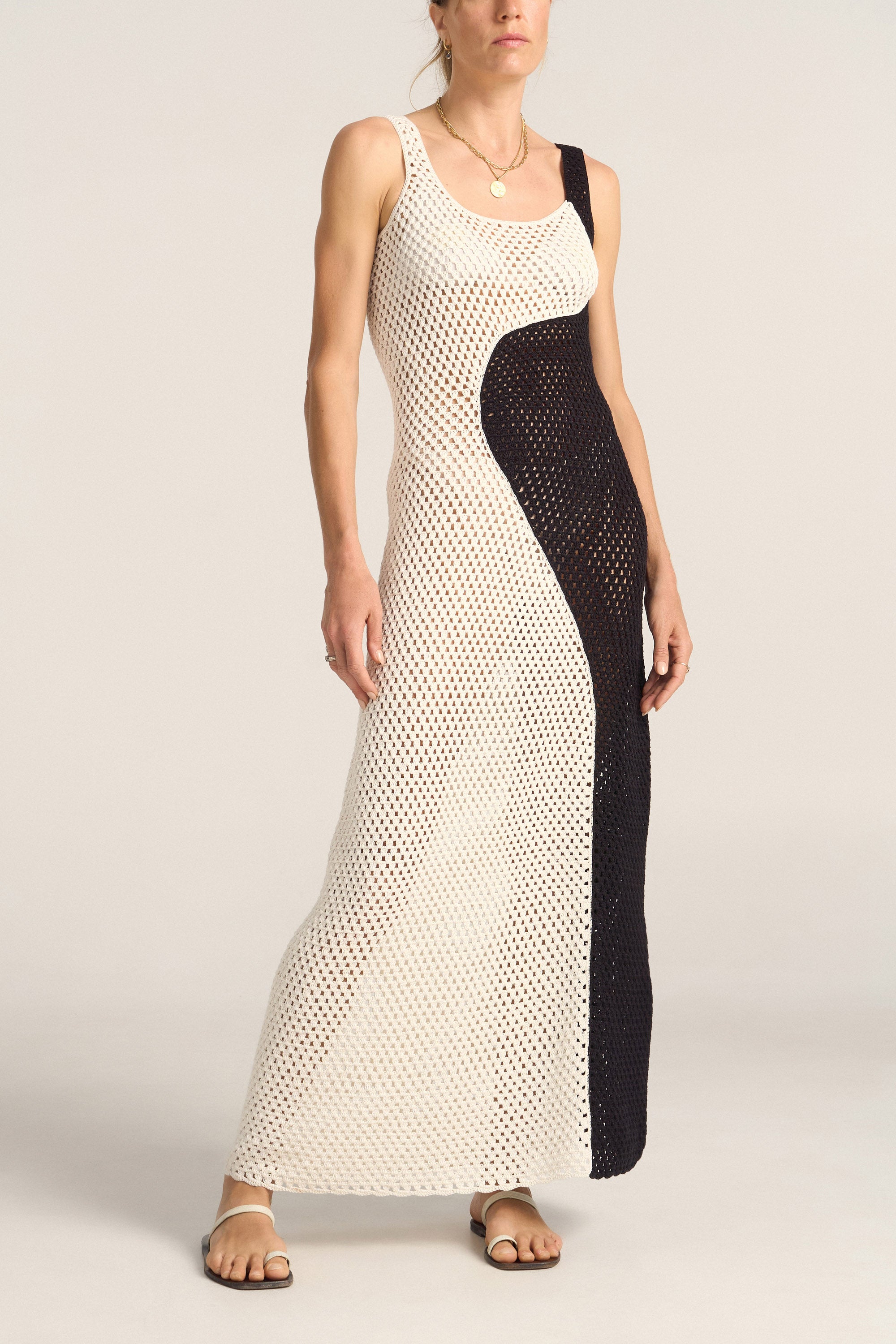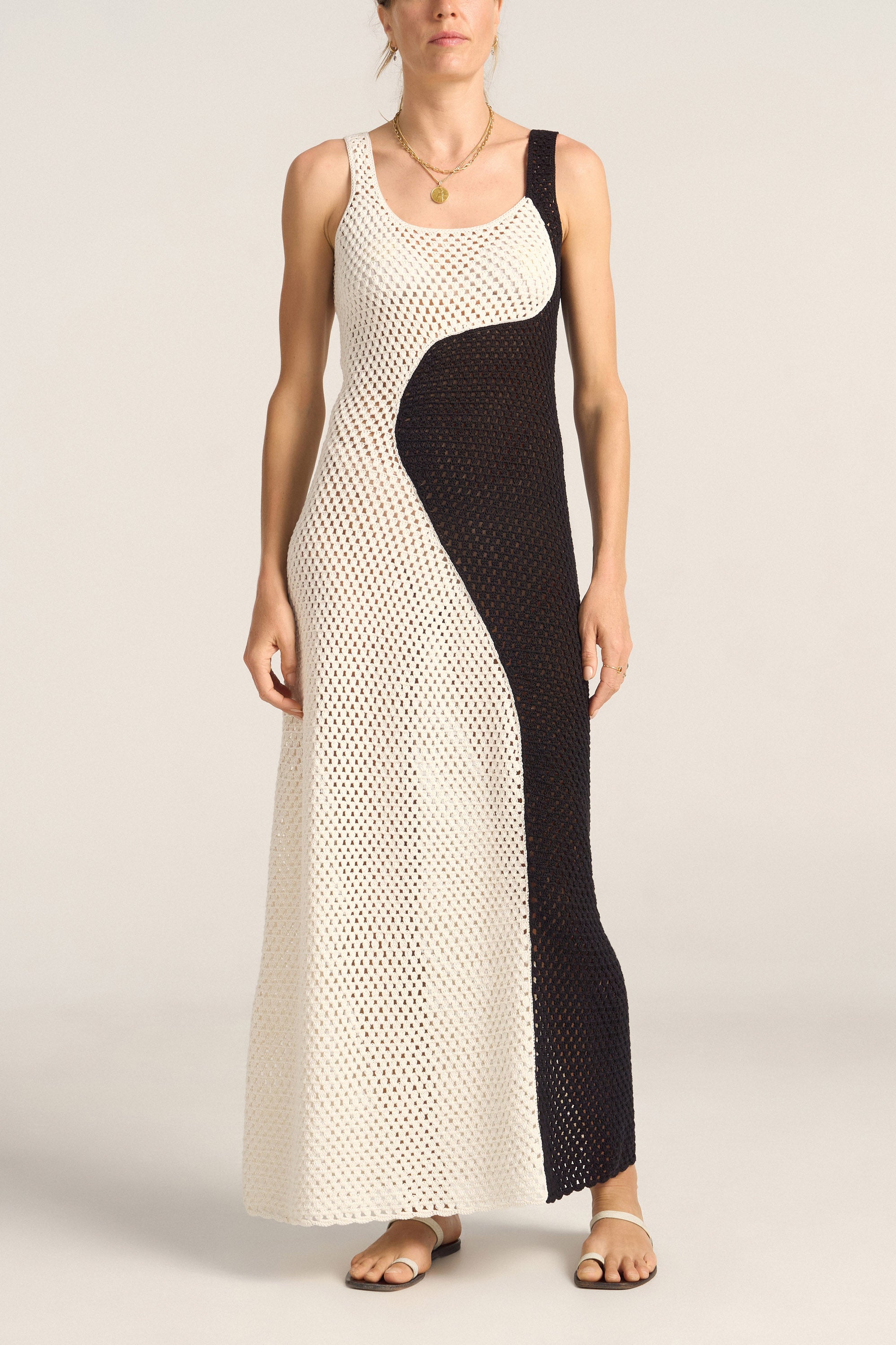 The Pharos Dress is a striking statement piece, hand-crocheted in a bold black and white geometric pattern. A wave-like split runs down the centre of the long silhouette, like a yin and yang symbol, creating contrast and movement with every step. Artisanal and sculptural, this dress celebrates craftsmanship and fluid form, making it the perfect piece for sun-drenched escapes or moonlit gatherings.