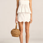The Scilla Skirt is a fresh take on a classic mini silhouette. Crafted from crisp white cotton poplin, it features vertical wave paneling that adds subtle texture and visual interest. A discreet back zip ensures easy wear, while the skirt finishes with a delicate wave hemline, lending a soft, feminine movement to the structured shape. Perfect for pairing with Pronce top or Cleobis shirt, the Scilla Skirt is a versatile piece for elevated everyday style.
