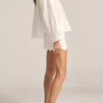 The Cleobis Shirt is a modern interpretation of classic shirting, crafted in crisp white cotton poplin. Designed with a clean collar and a single rectangular gold button at the neckline, the shirt features structured paneling through the high neck and shoulders, creating gentle volume. A delicate wave crochet insert at the mid-chest releases the silhouette into a soft, billowing shape that flows to the hem. With long sleeves and refined detailing, the Cleobis Shirt offers a fresh balance of structure and fluidity.