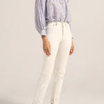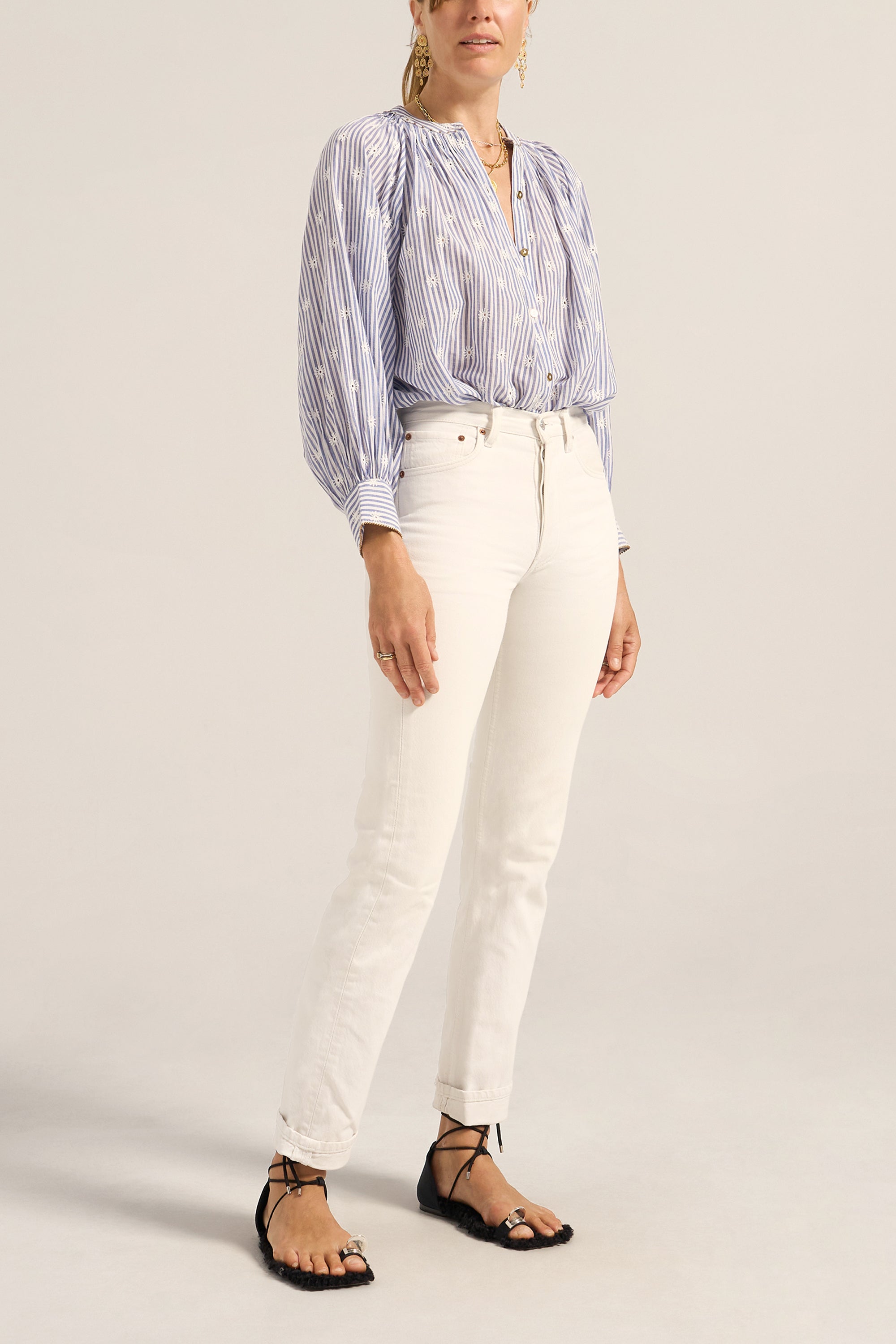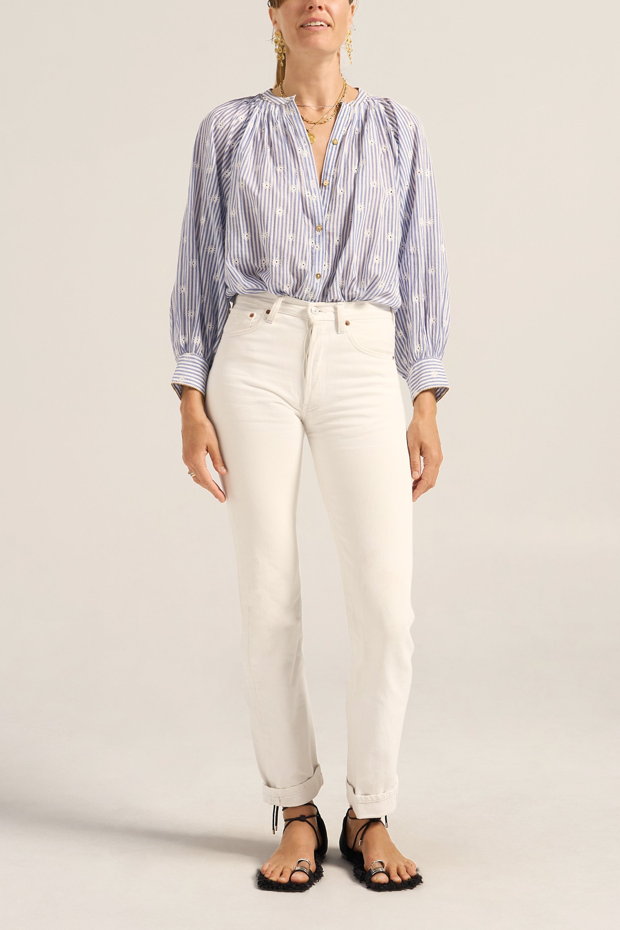 The Salome Blouse is crafted from a lightweight blue and white striped voile, detailed with delicate sun-like eyelets that bring texture and light to the fabric. Designed for ease and movement, it features a softly gathered neckline, and beautiful billowy sleeves. Gold beading adorns the neckline and cuffs for a subtle touch of shimmer. Gold buttons down the front of this relaxed, button-down silhouette add a touch of elegance. A timeless piece that balances intricate craftsmanship with effortless wear. Pair it with the Remus Shorts or your favourite jeans.