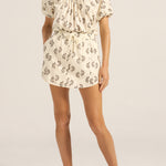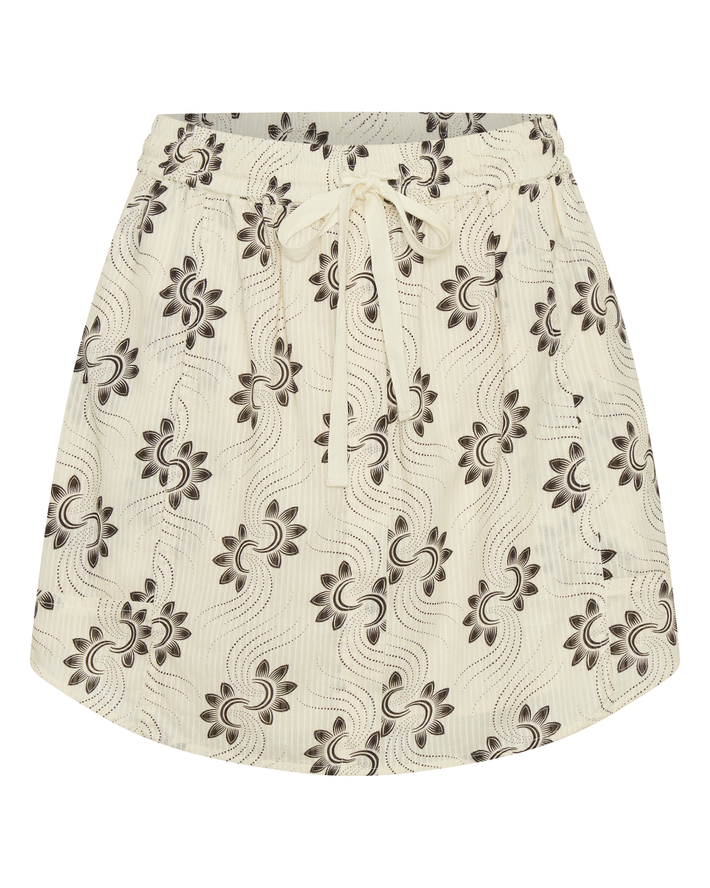 The Abas Skirt is crafted from a lightweight cotton voile printed with swirl motifs. Designed for ease and movement, it features a comfortable elastic drawstring waistband, practical side pockets, and a softly rounded hem that adds fluidity to the silhouette. Perfectly paired with the Cerbere Shirt or Moira Top, the Abas Skirt is an effortless, sun-ready piece for relaxed days.
