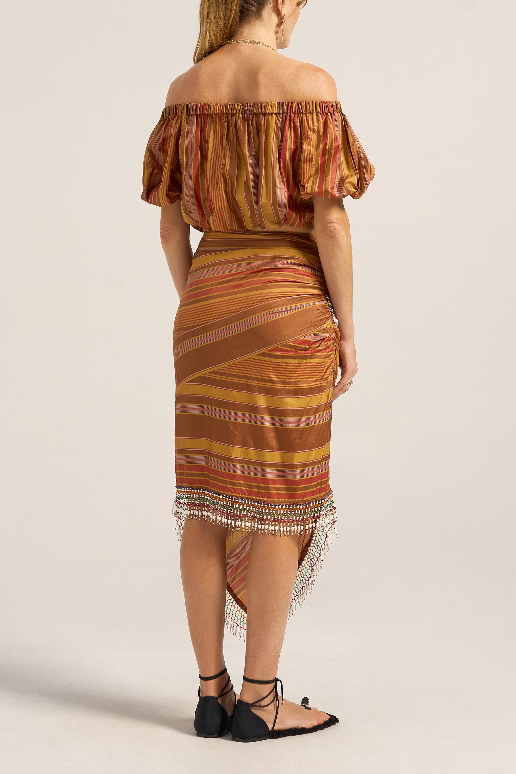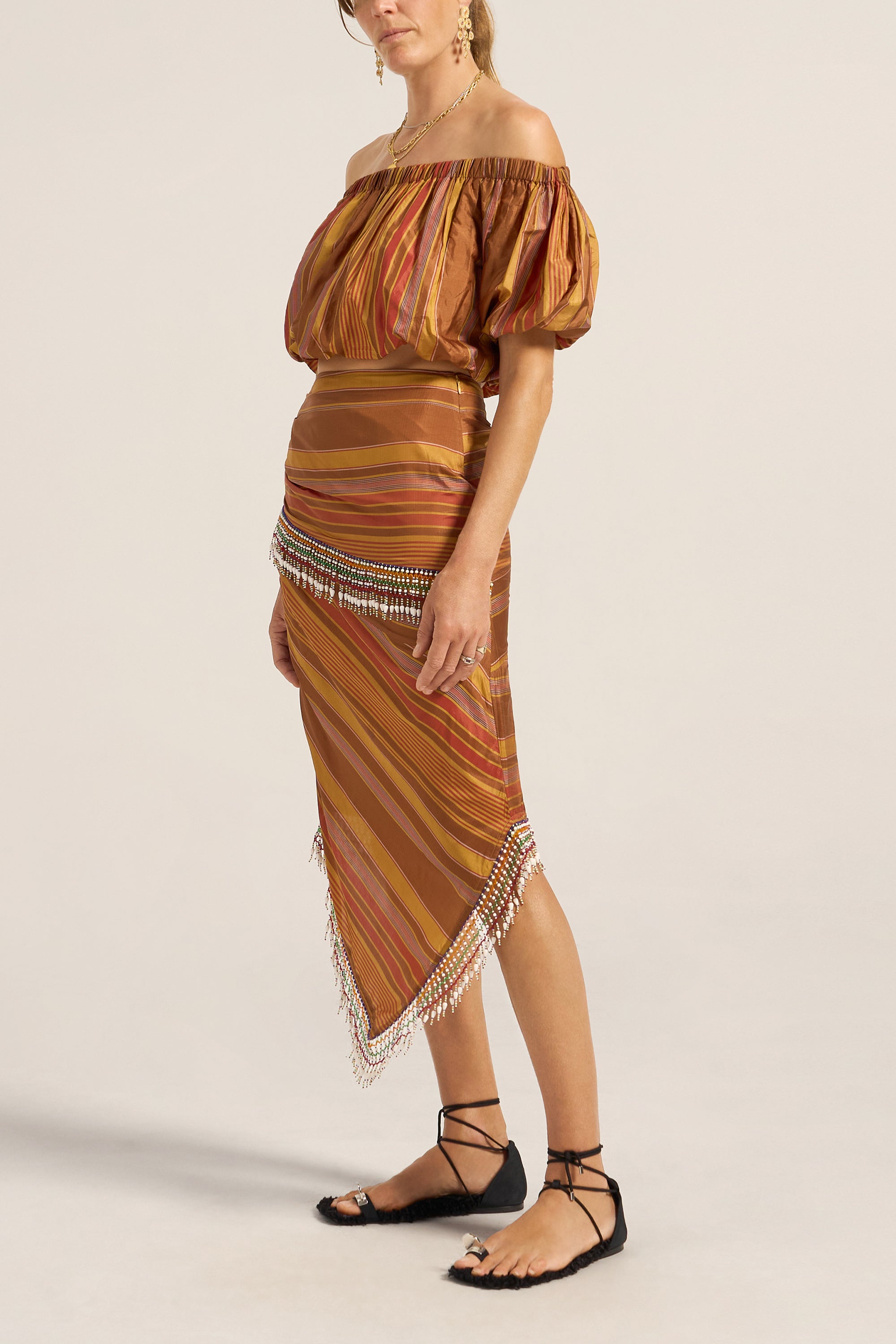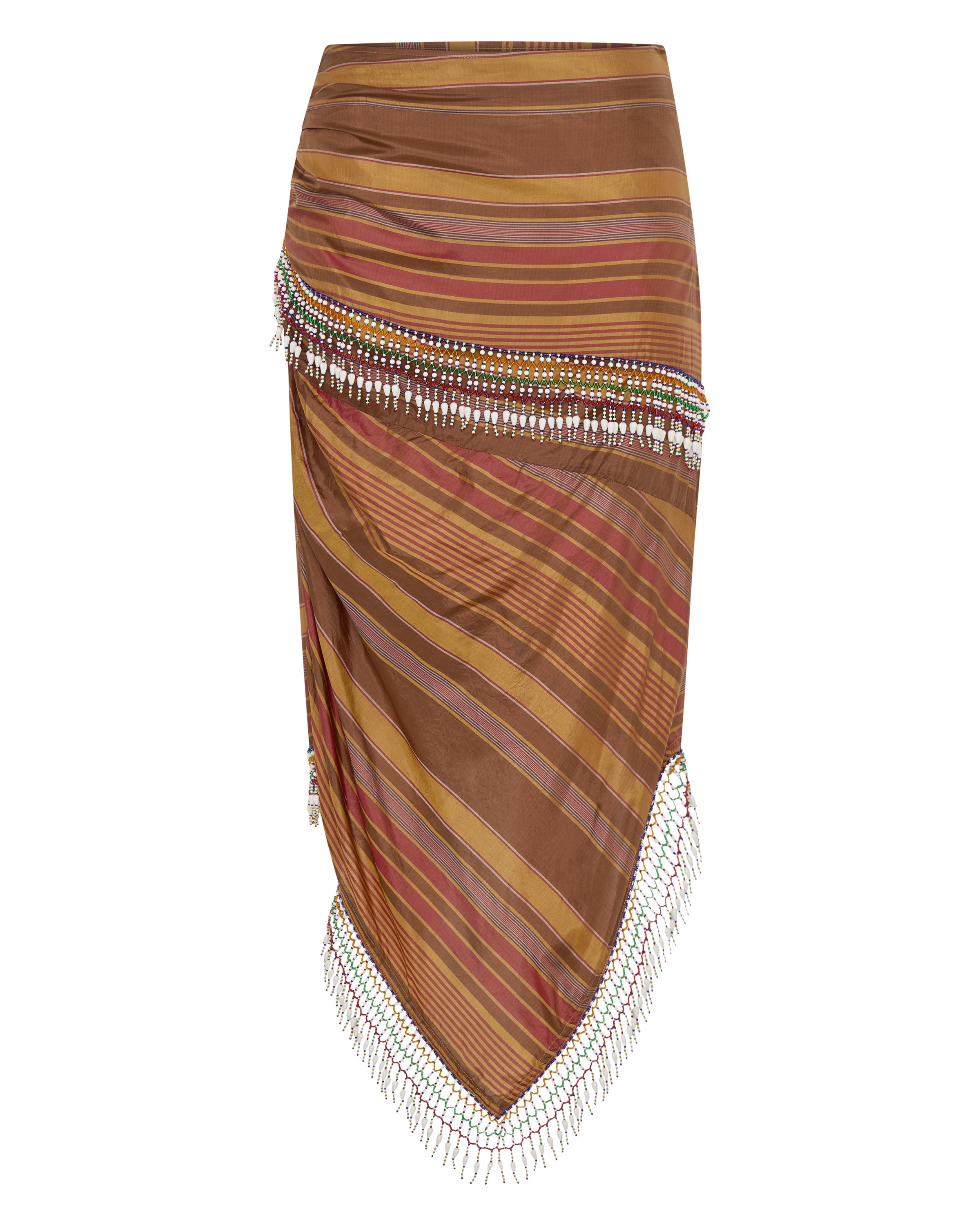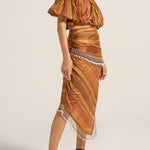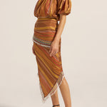 The Aegis Skirt is crafted from a luxurious Stripe silk in golden brown beautifully woven with stripes in chestnut, gold and red. Celebrating craftsmanship and style. The striking asymmetric design features diagonal stripe placement that creates dynamic visual interest and a flattering silhouette. Exquisite beaded detailing wraps around the waist and cascades diagonally down the skirt and hemline, creating beautiful movement. The midi length with asymmetric hemline adds a contemporary, fashion-forward edge, while the fitted waistband and hidden zip ensures a sleek, polished fit. Style the Aegis Skirt with a simple singlet to let the stunning beadwork take centre stage, or pair it with the Elli top for a coordinated look.