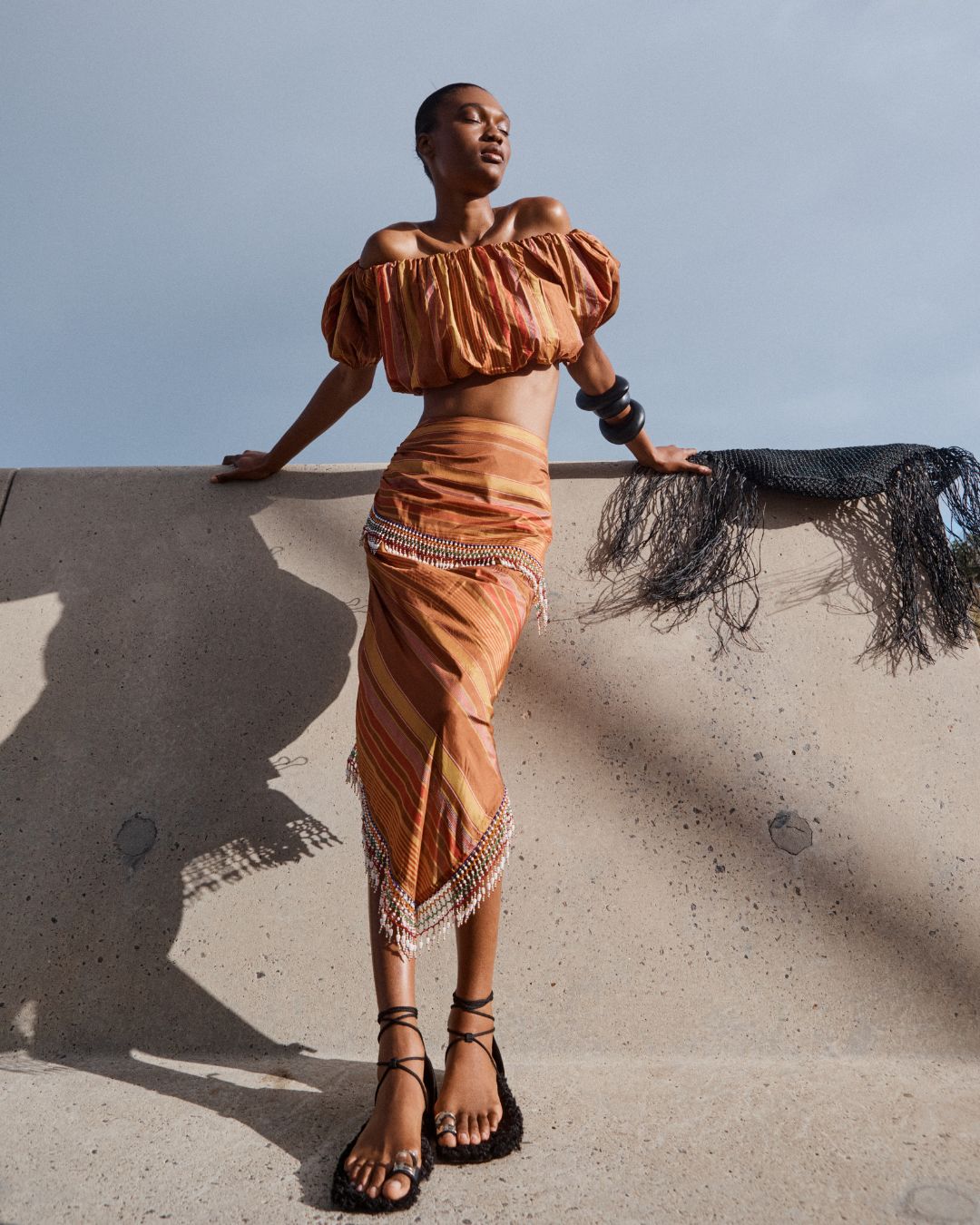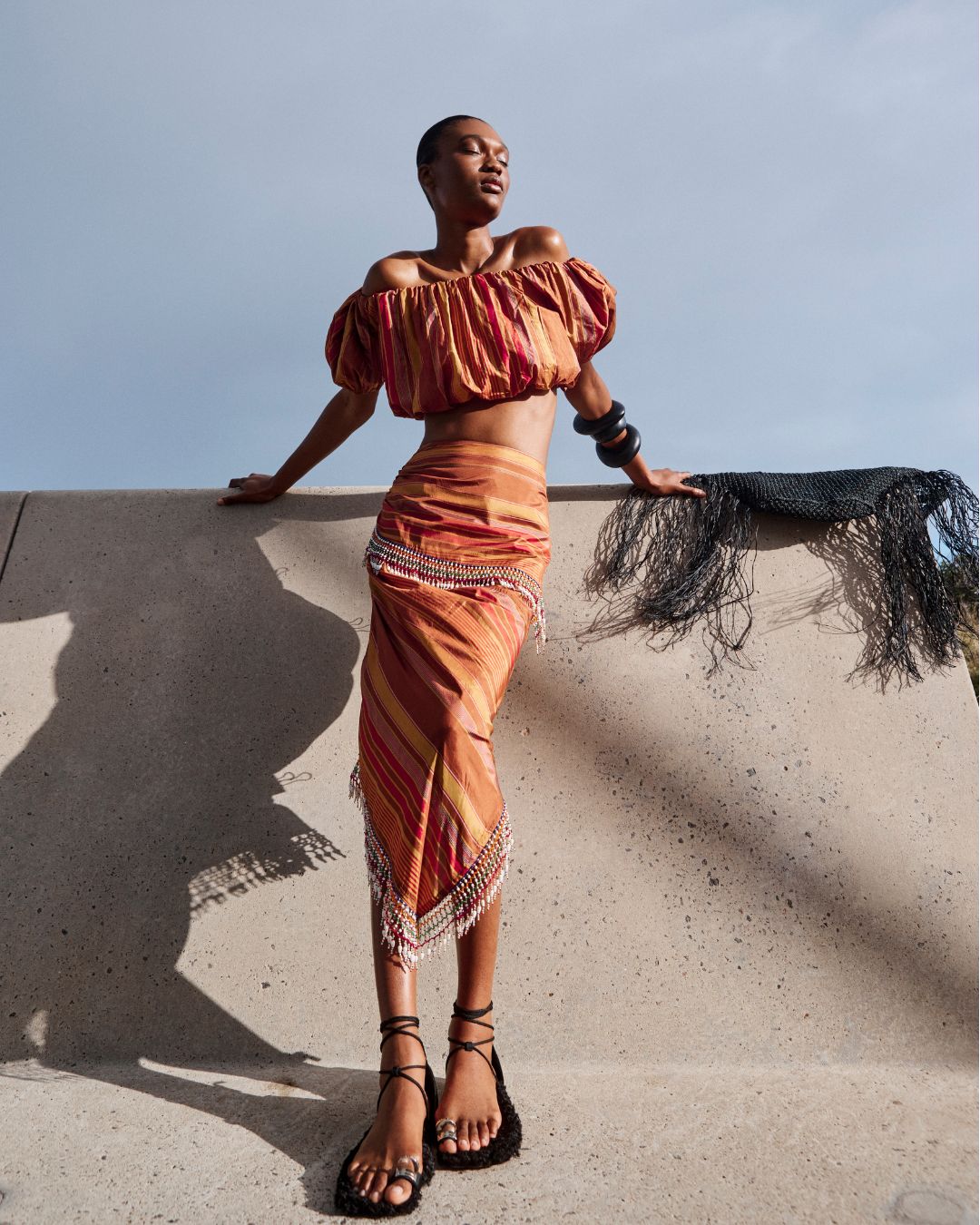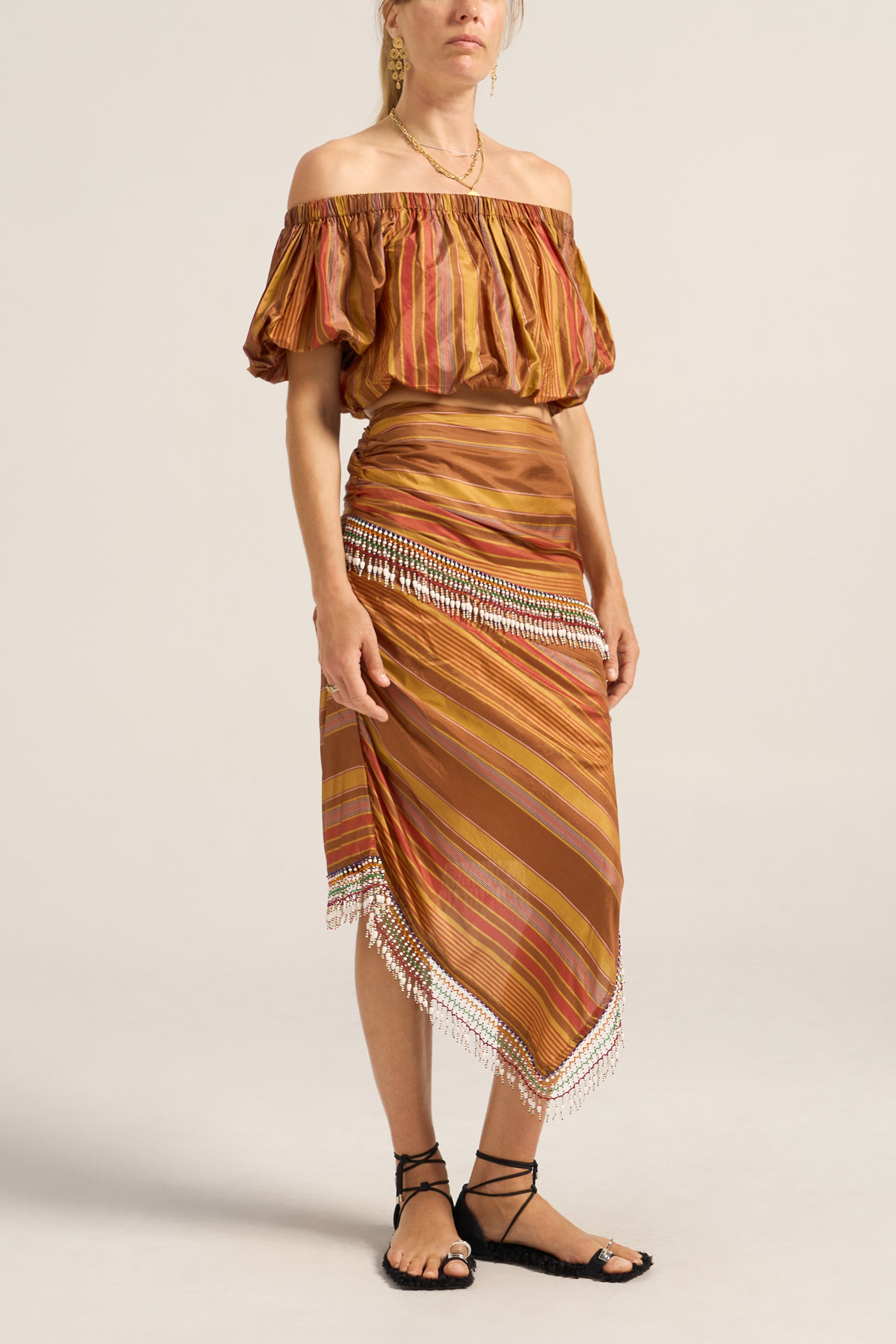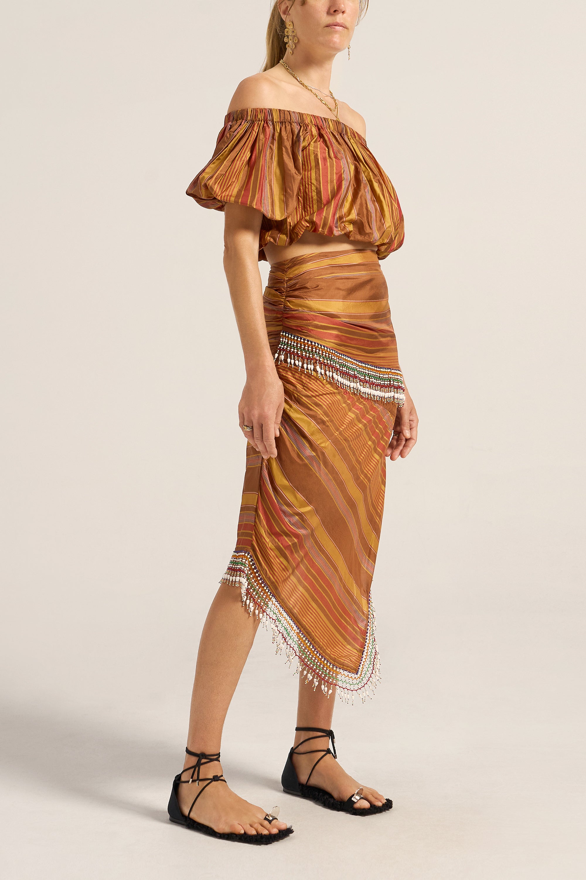 The Aegis Skirt is crafted from a luxurious Stripe silk in golden brown beautifully woven with stripes in chestnut, gold and red. Celebrating craftsmanship and style. The striking asymmetric design features diagonal stripe placement that creates dynamic visual interest and a flattering silhouette. Exquisite beaded detailing wraps around the waist and cascades diagonally down the skirt and hemline, creating beautiful movement. The midi length with asymmetric hemline adds a contemporary, fashion-forward edge, while the fitted waistband and hidden zip ensures a sleek, polished fit. Style the Aegis Skirt with a simple singlet to let the stunning beadwork take centre stage, or pair it with the Elli top for a coordinated look.