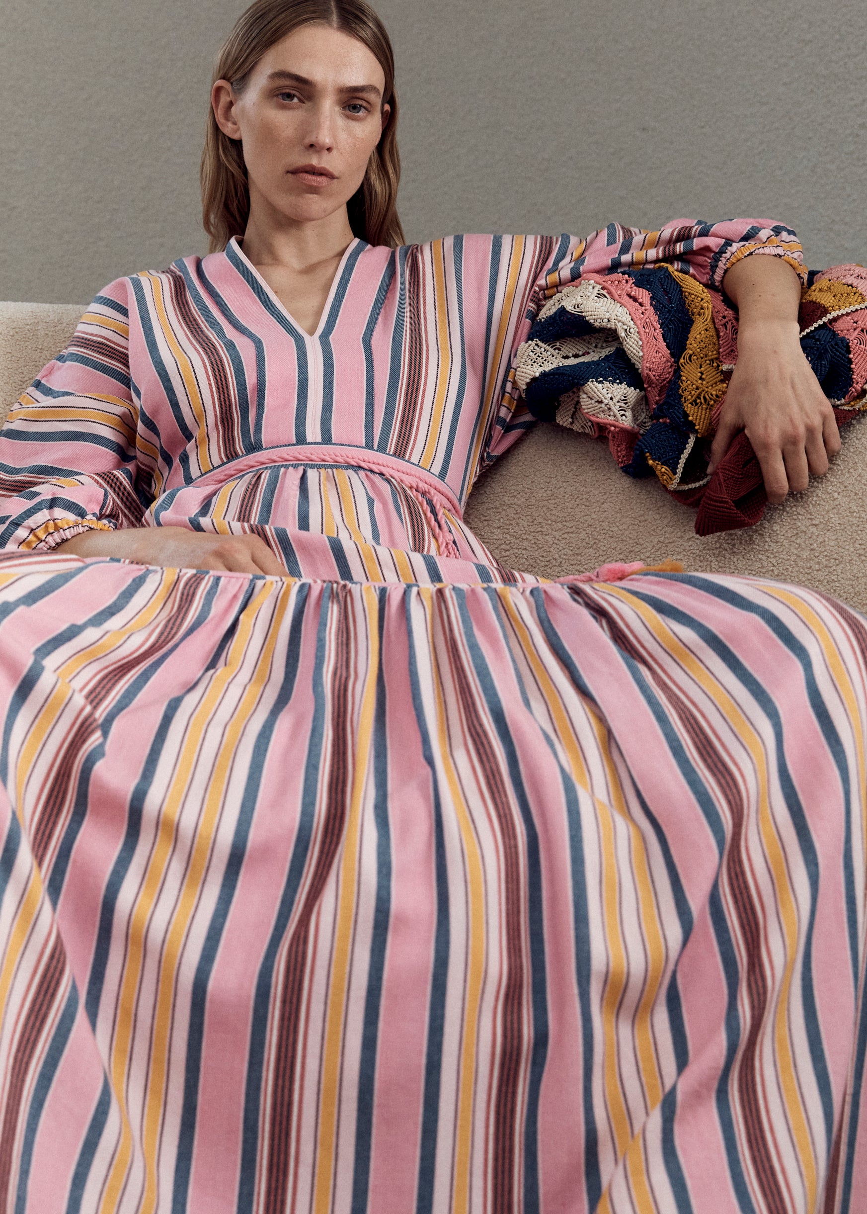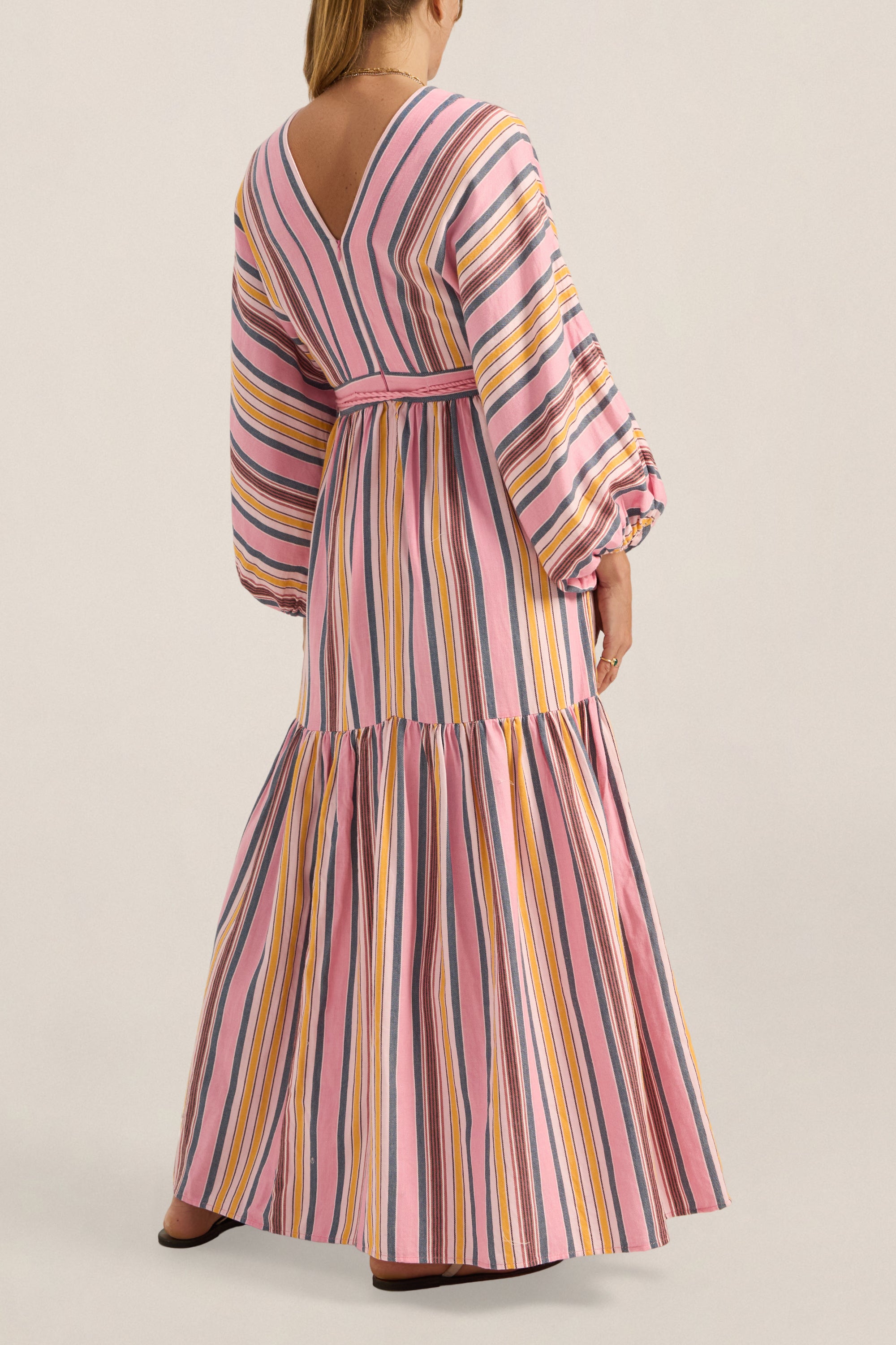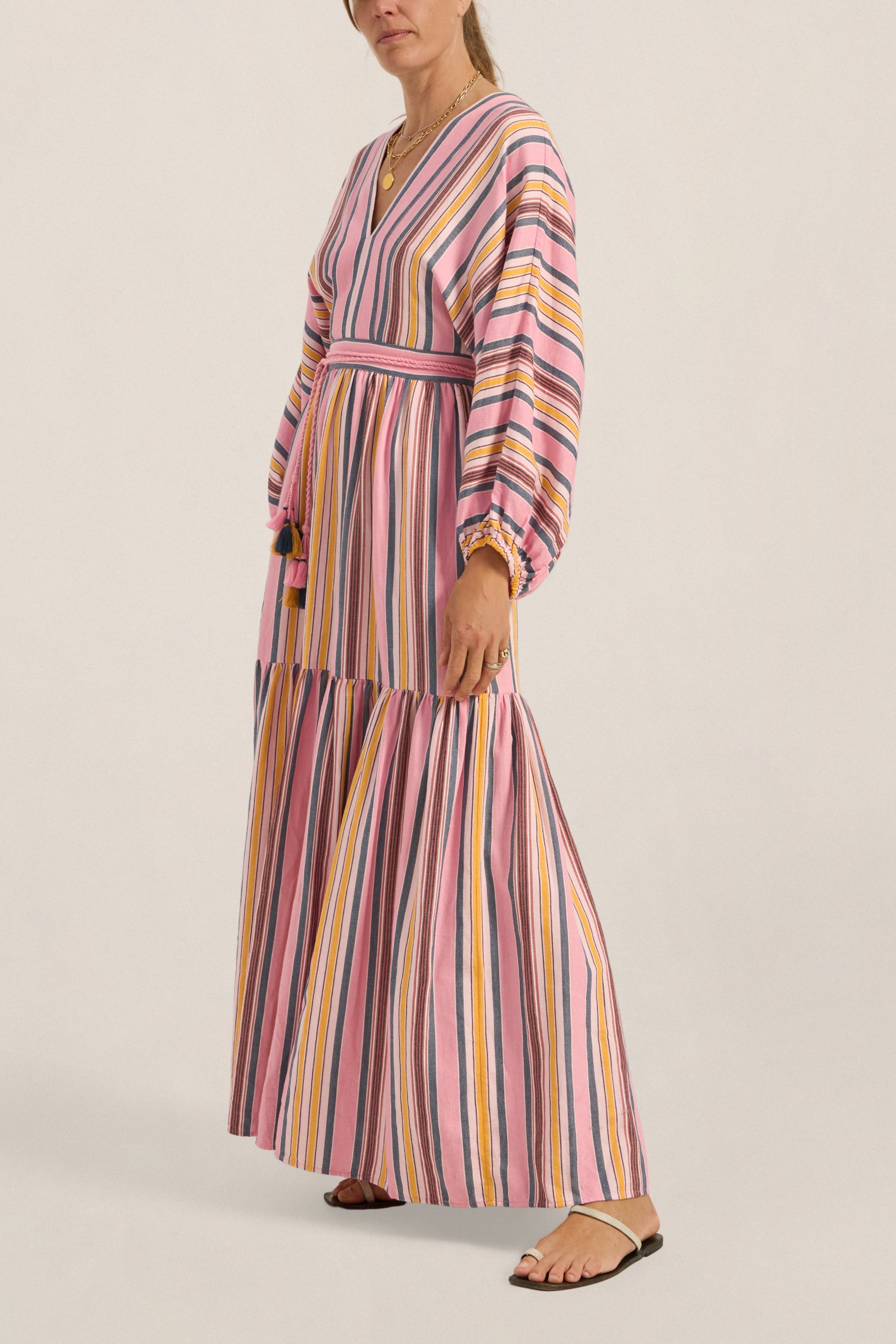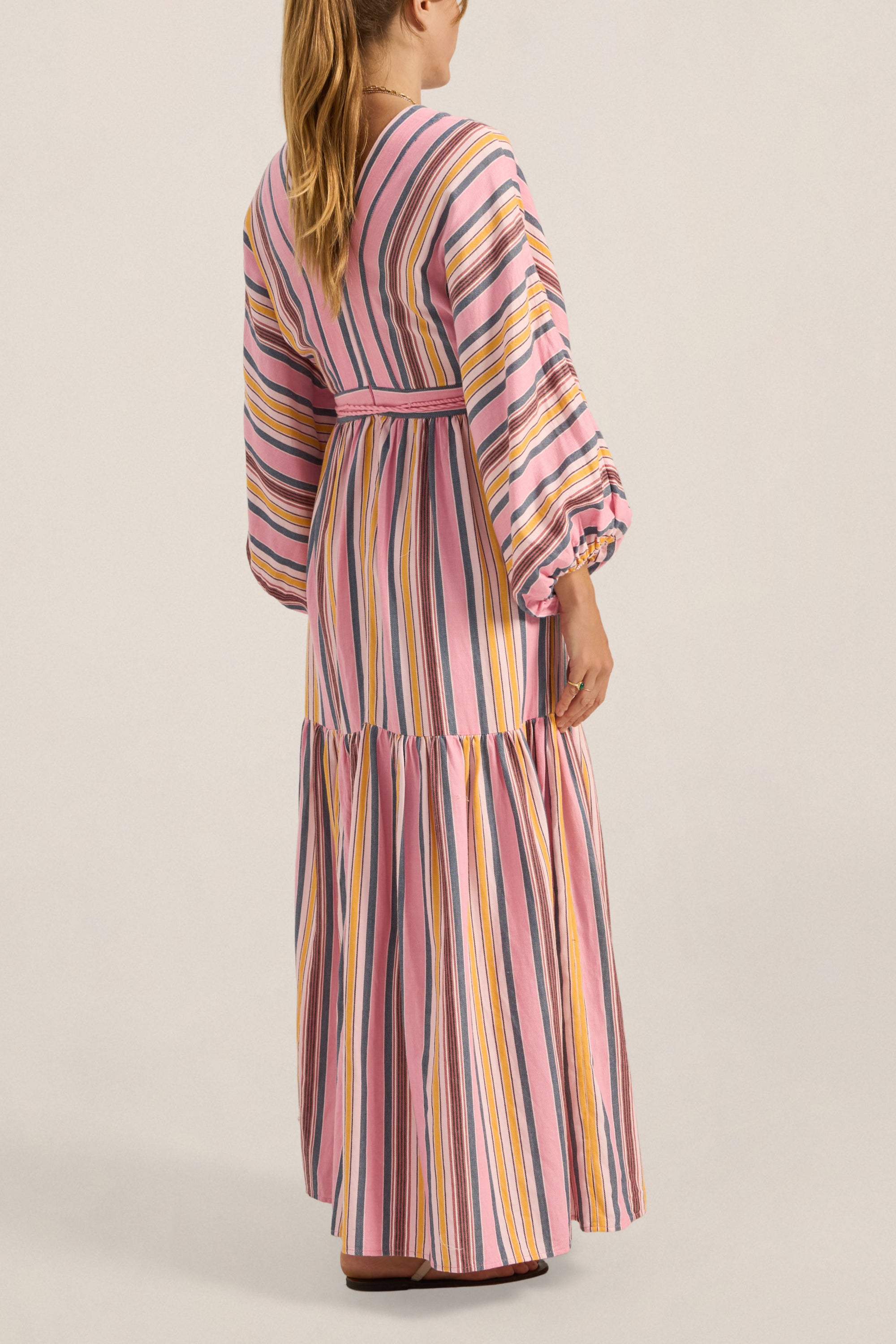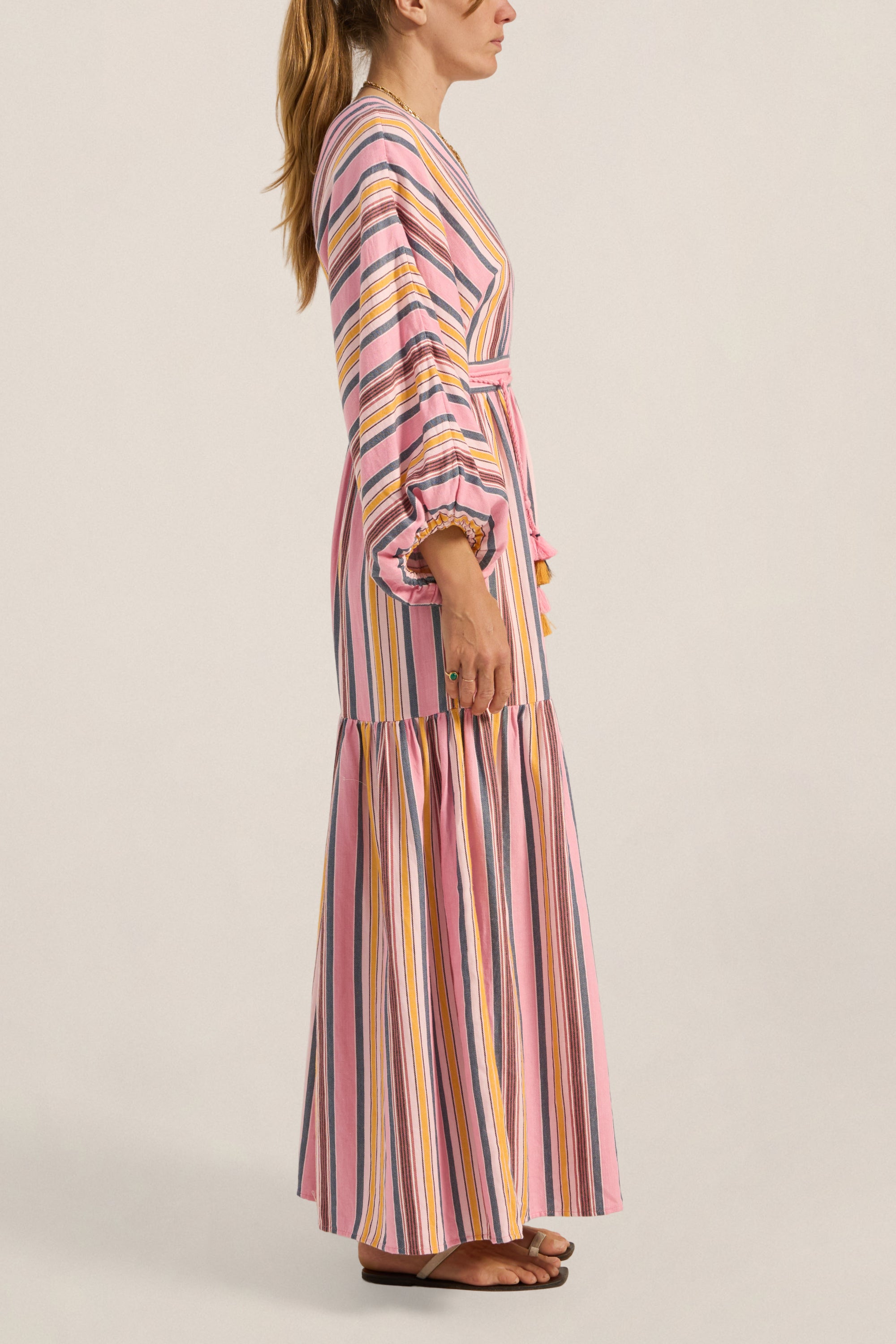 The Cyrene Dress is a statement of relaxed elegance. Crafted in the Samos Stripe, a soft pink base woven with sun-washed stripes. It features a flattering V-neckline, billowing sleeves with elastic cuffs, and a softly gathered maxi skirt. A wrapped waist tie, finished with playful tassels, defines the silhouette while maintaining a laid-back feel. Effortless and feminine, it’s a perfect piece for sunlit bohemian days and balmy evenings.