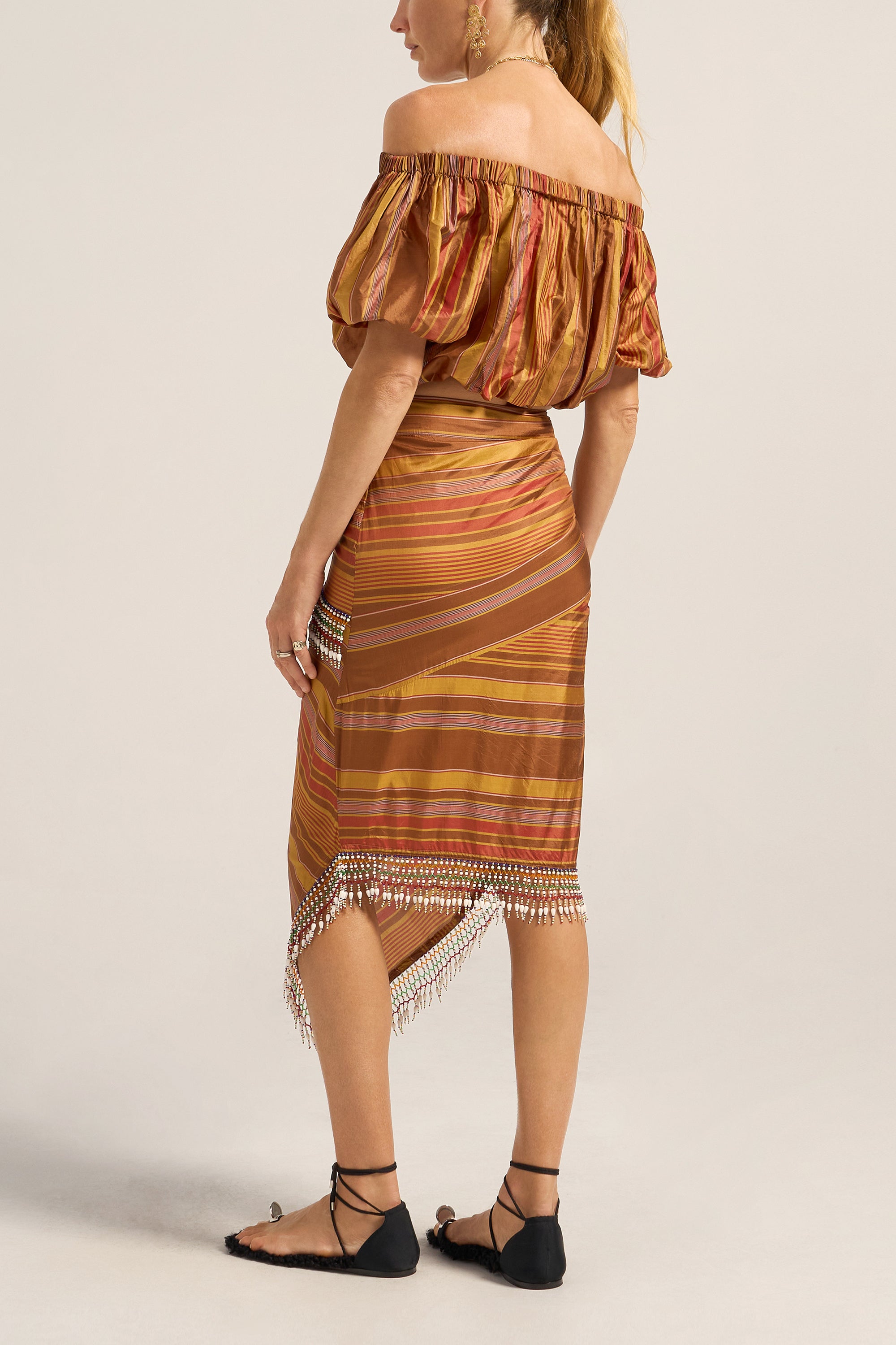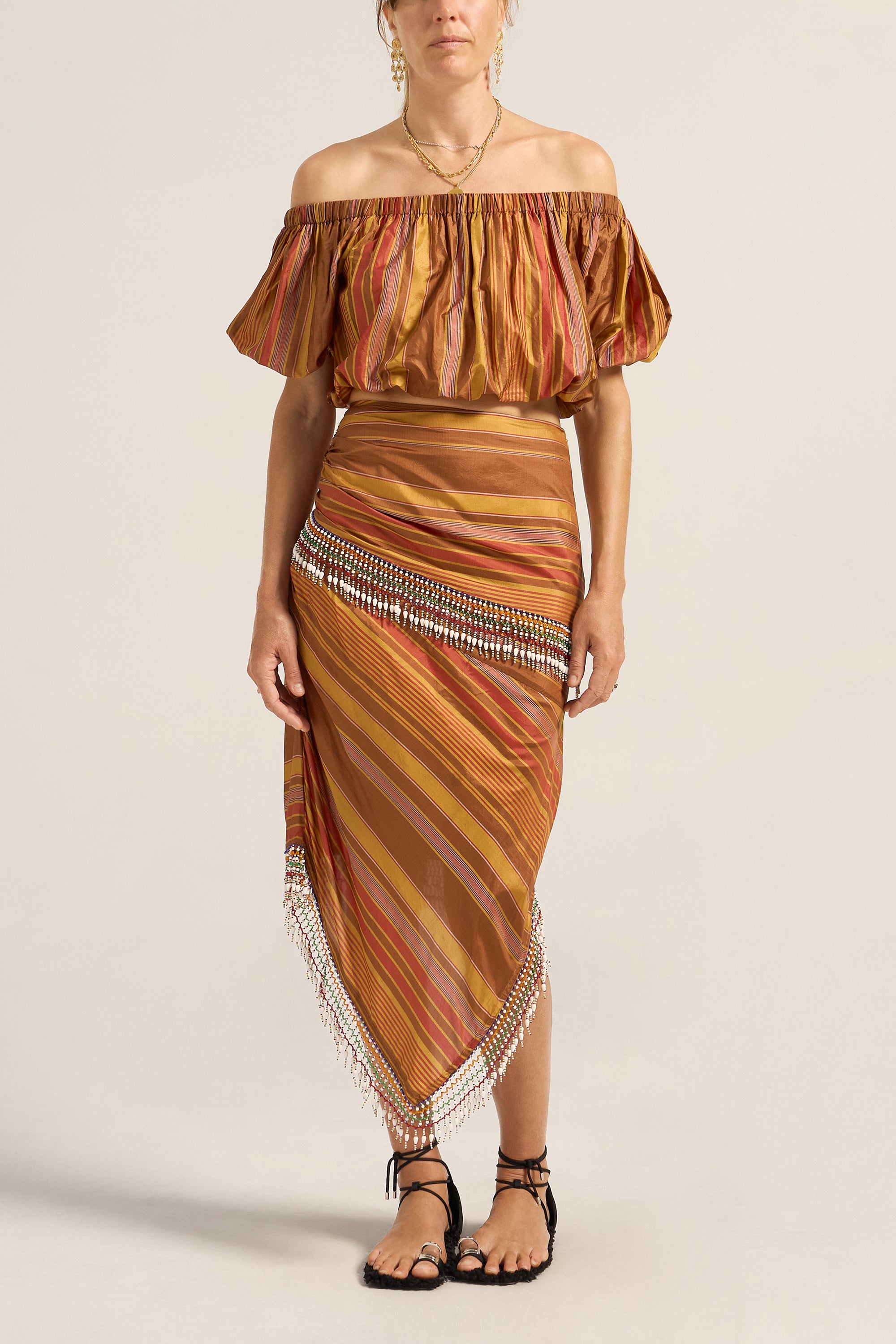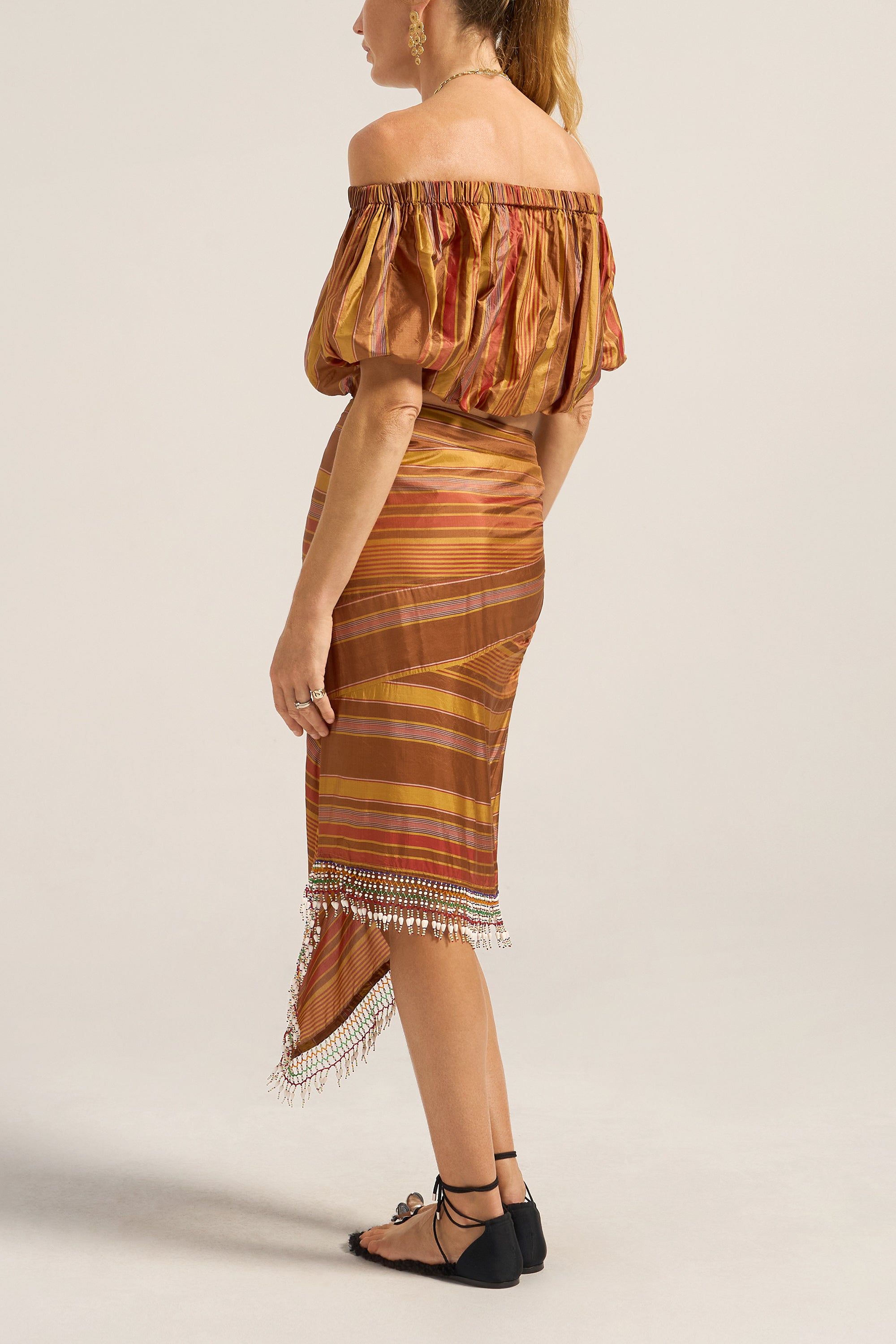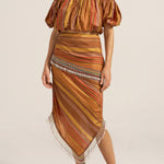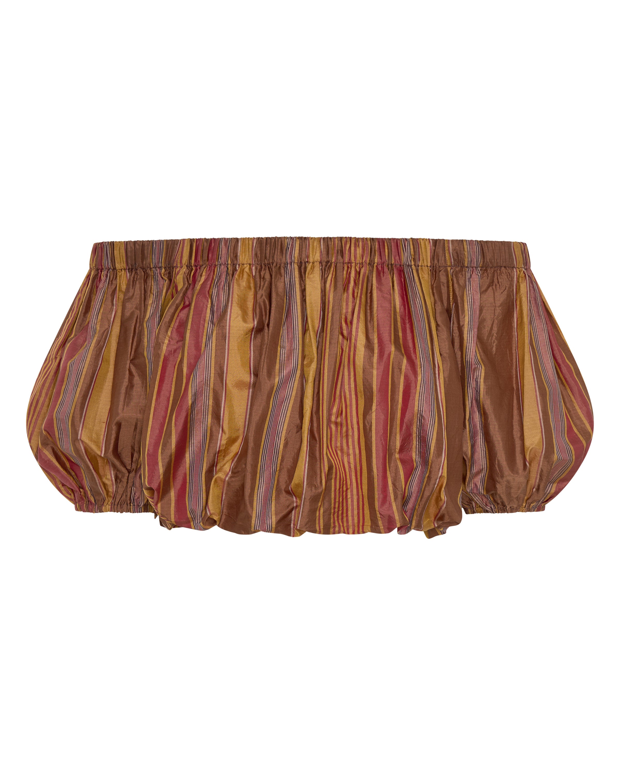 A celebration of artisanal craftsmanship and rich texture, the Elli Top is crafted from a luxurious Stripe silk. The golden brown base beautifully woven with stripes in chestnut, gold and red creates a warm, sophisticated palette that catches the light with every movement. This cropped off-the shoulder top is elasticised across the neckline and waist for a perfect it. Featuring rich puff sleeves, this mini silhouette is fun, young and festive. Pair it with the Aegis Skirt for a beautiful head-to-toe look, or with your favourite jeans for an exquisite summer outfit.