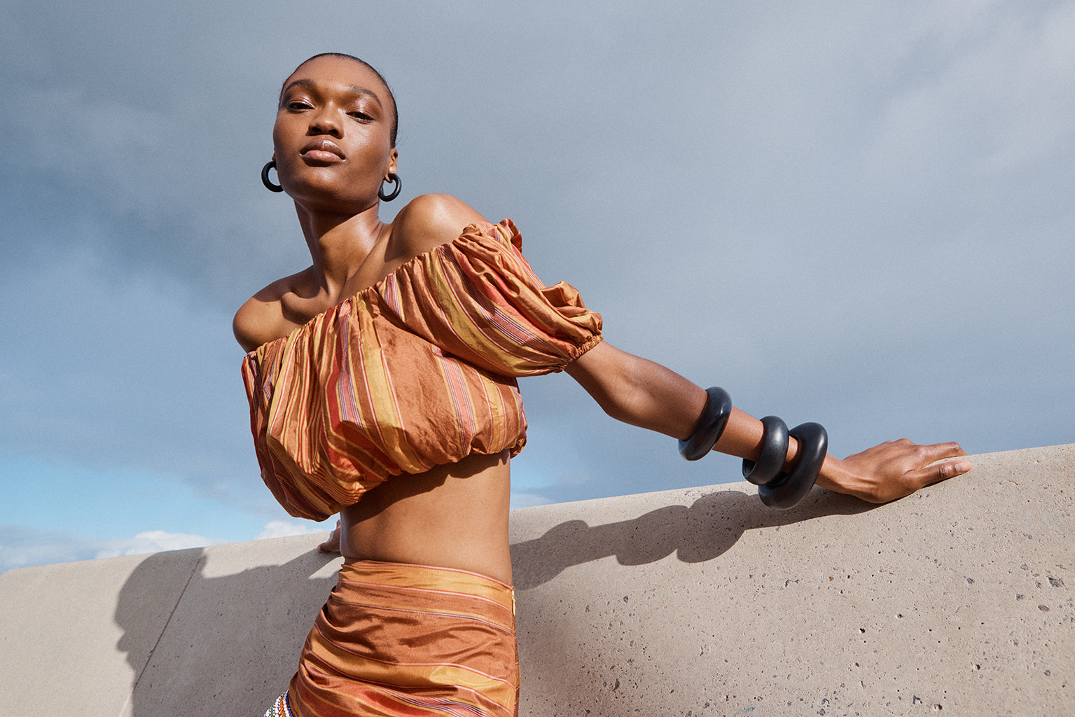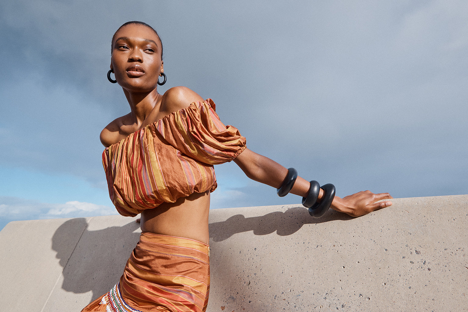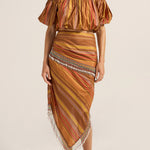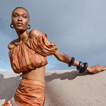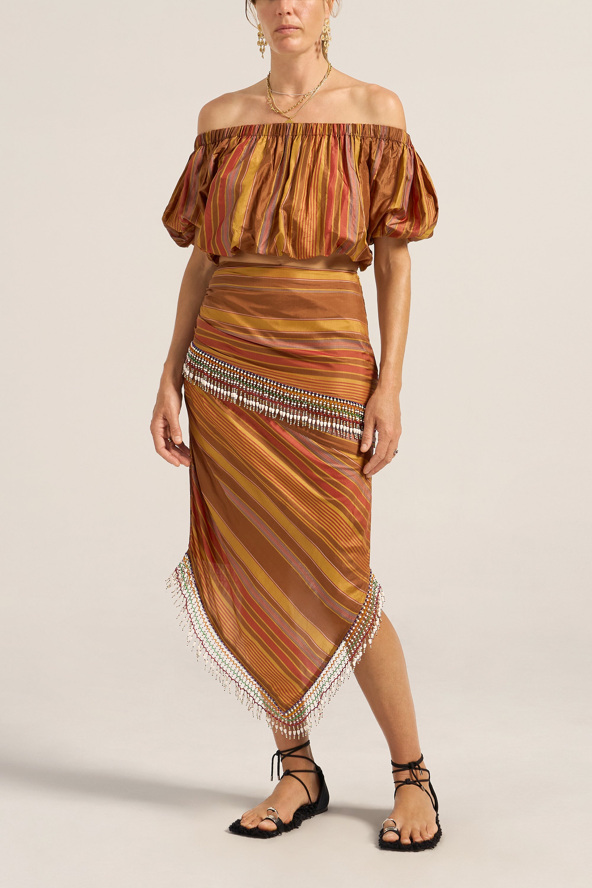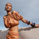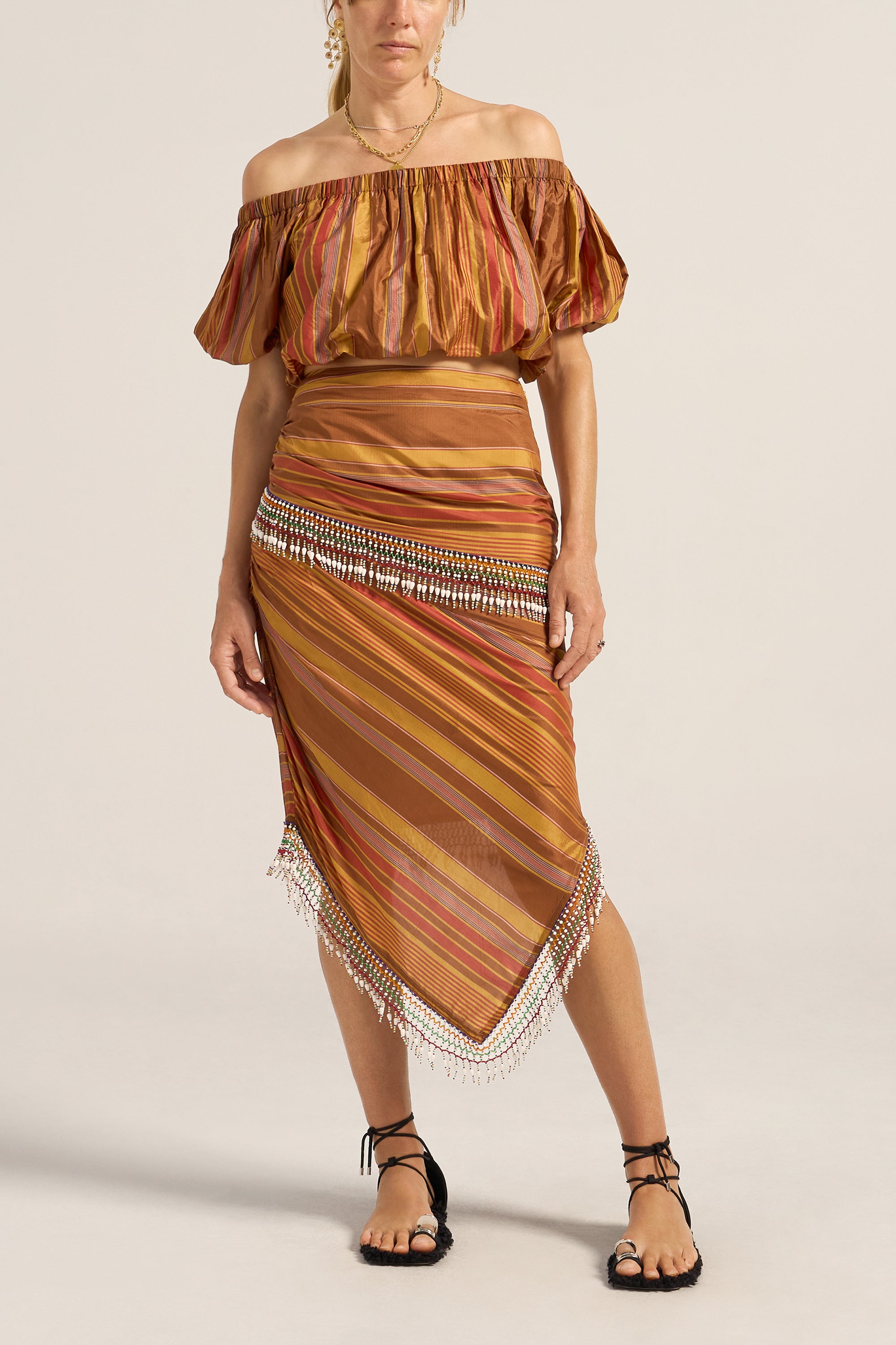 A celebration of artisanal craftsmanship and rich texture, the Elli Top is crafted from a luxurious Stripe silk. The golden brown base beautifully woven with stripes in chestnut, gold and red creates a warm, sophisticated palette that catches the light with every movement. This cropped off-the shoulder top is elasticised across the neckline and waist for a perfect it. Featuring rich puff sleeves, this mini silhouette is fun, young and festive. Pair it with the Aegis Skirt for a beautiful head-to-toe look, or with your favourite jeans for an exquisite summer outfit.