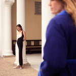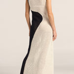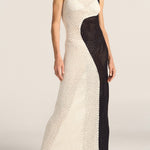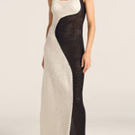 The Pharos Dress is a striking statement piece, hand-crocheted in a bold black and white geometric pattern. A wave-like split runs down the centre of the long silhouette, like a yin and yang symbol, creating contrast and movement with every step. Artisanal and sculptural, this dress celebrates craftsmanship and fluid form, making it the perfect piece for sun-drenched escapes or moonlit gatherings.
